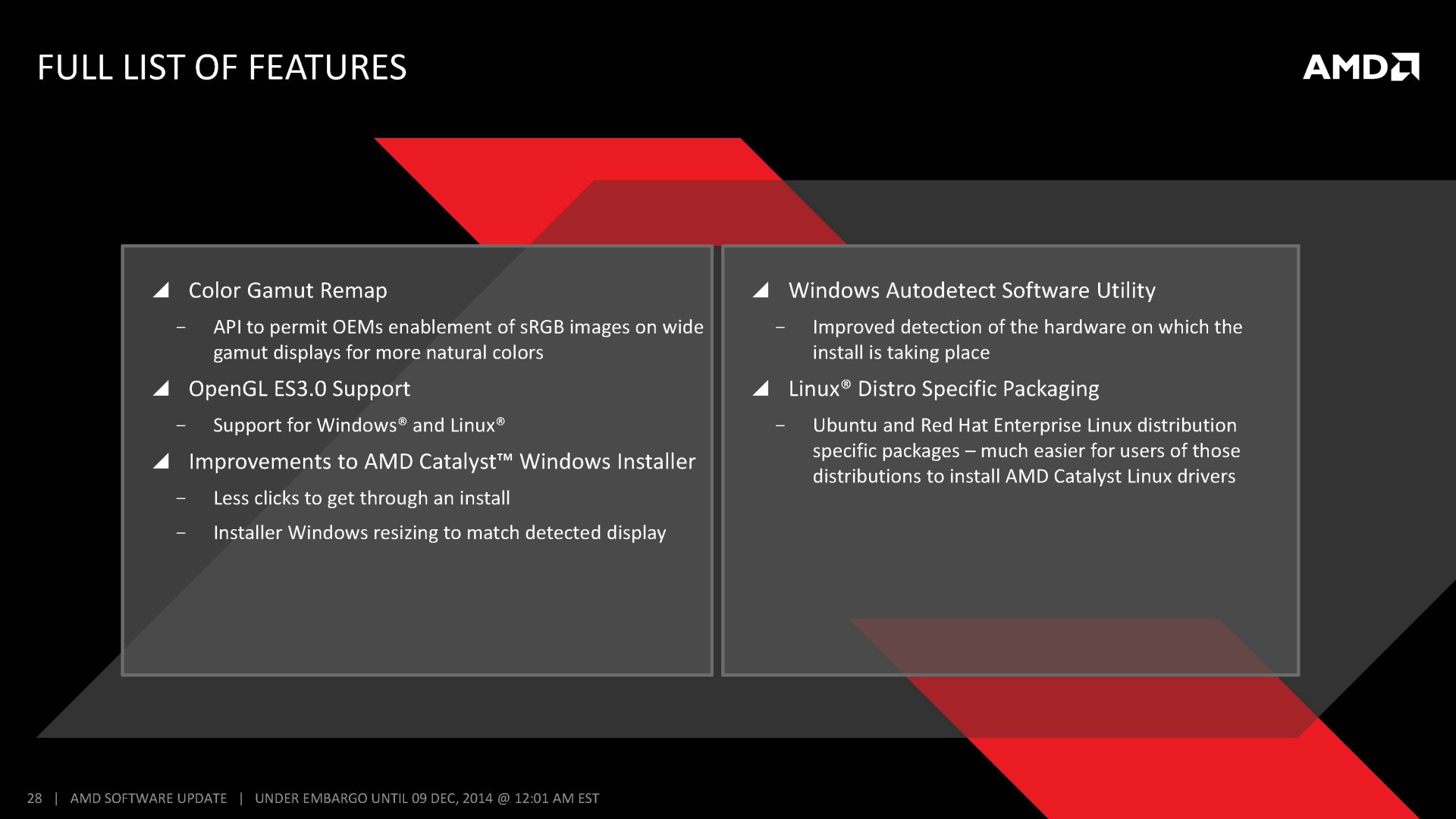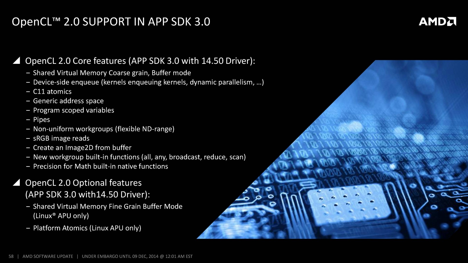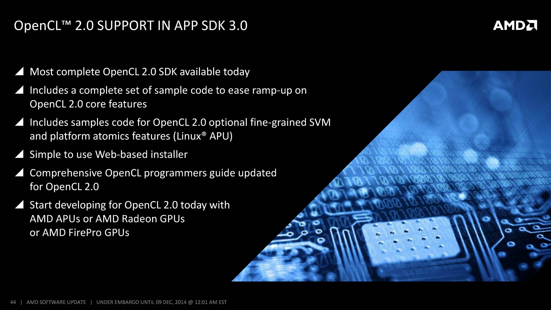 Les Catalyst Omega représentent l'occasion pour AMD d'intégrer dans la branche standard de ses pilotes le support d'OpenCL 2.0 qui était jusqu'ici proposé à travers un pilote beta spécifique. Il en va de même pour OpenGL ES 3.0, principalement exploité dans le monde mobile, mais qui pourrait également trouver sa place sur PC.
