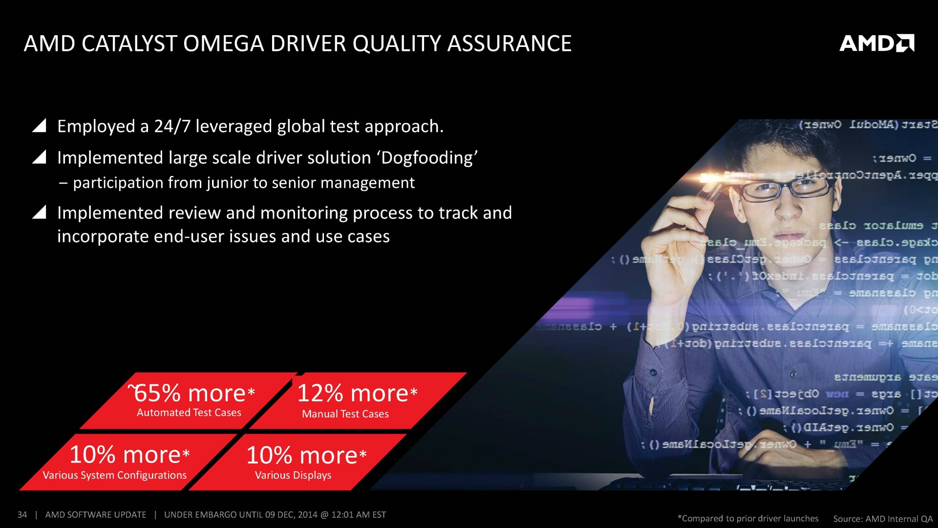 Il y a bien entendu beaucoup de travail pour y parvenir, cela se fera par étape. Dans l'immédiat il s'agit pour AMD de mieux exploiter ses ressources disponibles et de mettre la priorité au bon endroit. Pour améliorer la qualité de ses pilotes, AMD explique par exemple avoir revu toutes ses procédures de tests automatiques et manuelles pour en augmenter significativement le nombre tout en les exécutant sur plus de configurations différentes que ce soit en termes de systèmes ou de types d'affichages. AMD a également lancé un vaste programme interne qui pousse chaque employé à tester les logiciels maisons et à apporter un feedback. Tout cela devrait permettre de repérer les bugs et autres problèmes plus tôt et idéalement avant la sortie d'une nouvelle version des pilotes.