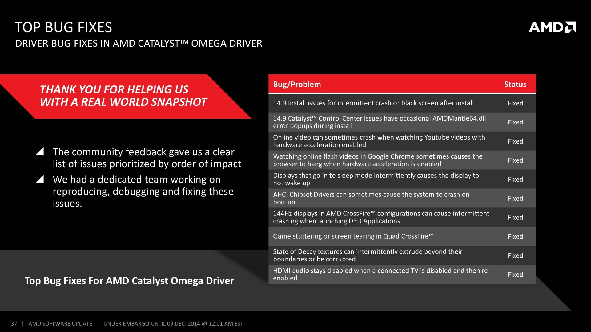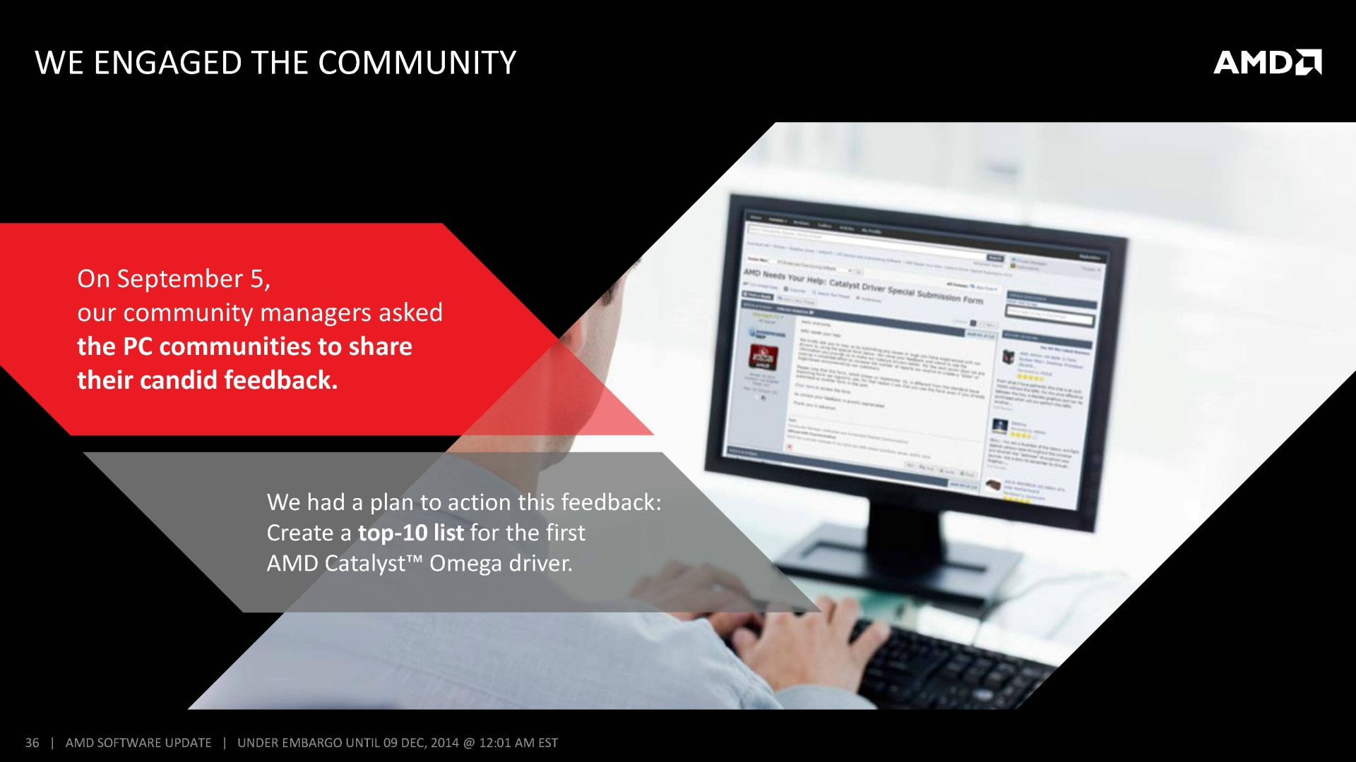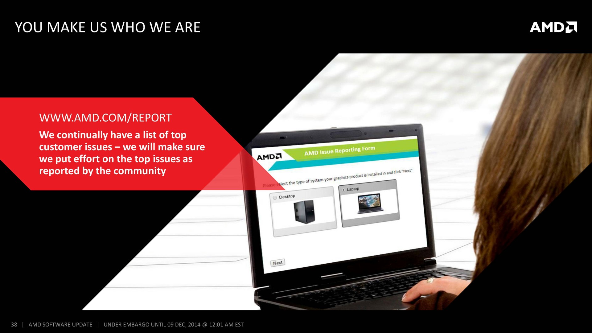Il est également question de chercher plus activement à faire remonter les problèmes rencontrés par les utilisateurs, par exemple via les forums ou les réseaux sociaux. Enfin, AMD a mis en place une URL spécifique pour reporter un problème : www.amd.com/report .