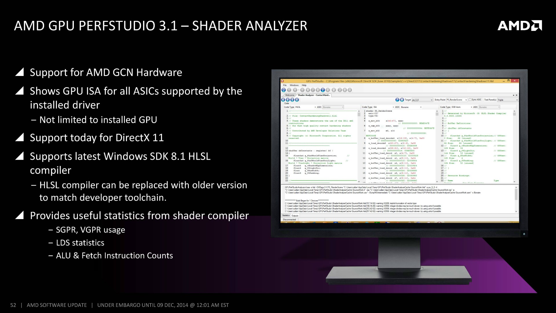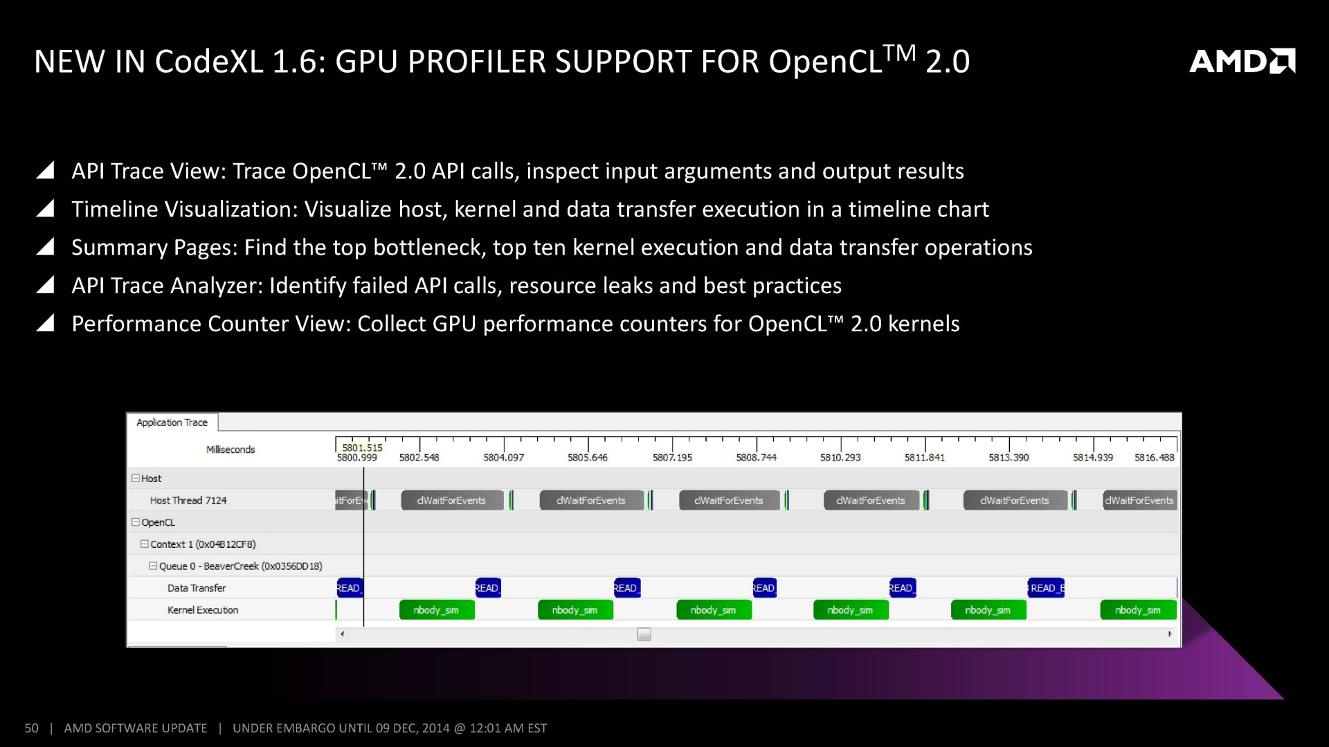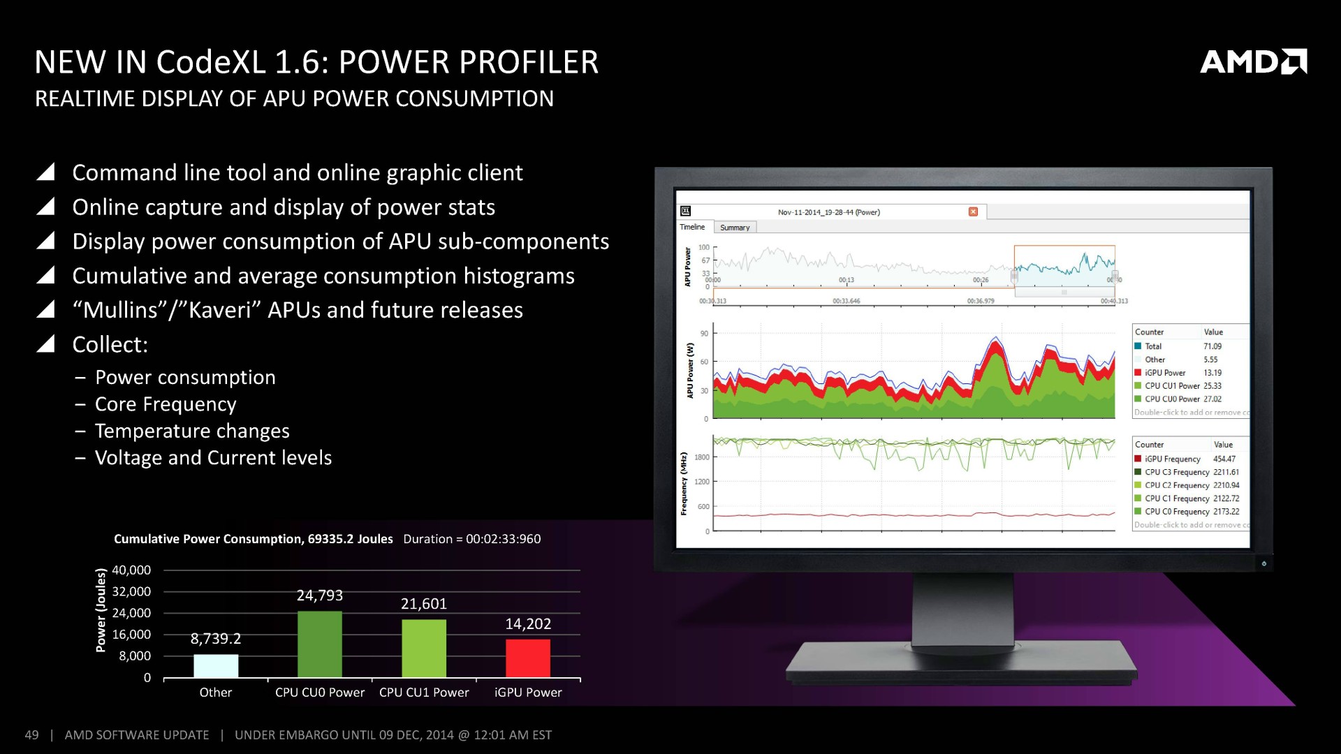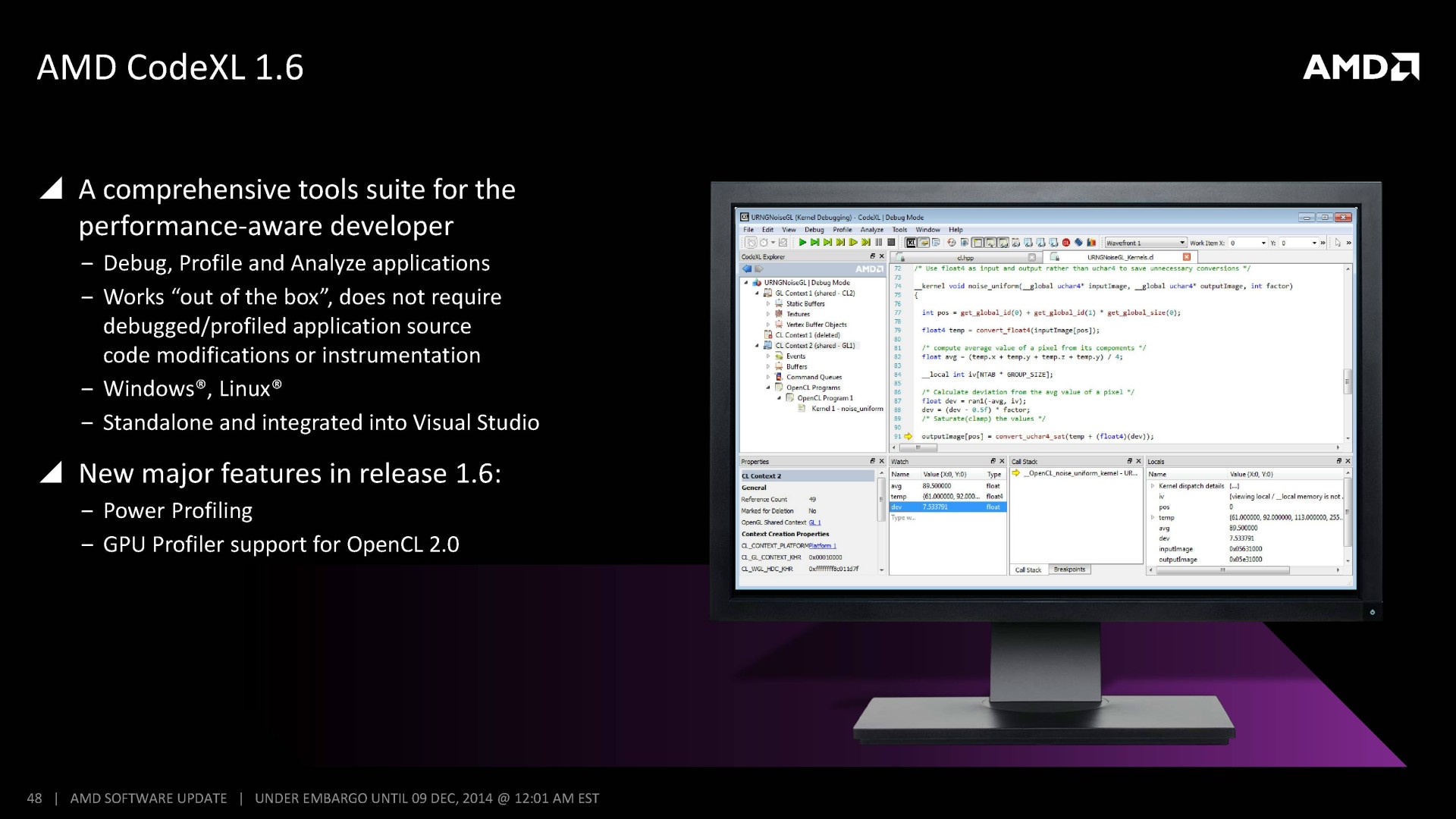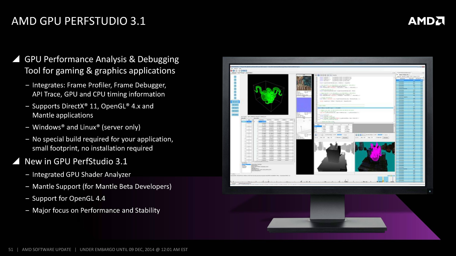 Pour accompagner ce support, AMD met à jour ses outils développeurs : CodeXL passe en version 1.6 et PerfStudio en version 3.1. CodeXL 1.6 gagne un mode de profiling tourné autour de la consommation des différentes composantes d'un APU, ainsi que le support d'OpenCL 2.0. GPU PerfStudio reçoit de son côté le support de Mantle et d'OpenGL 4.4.