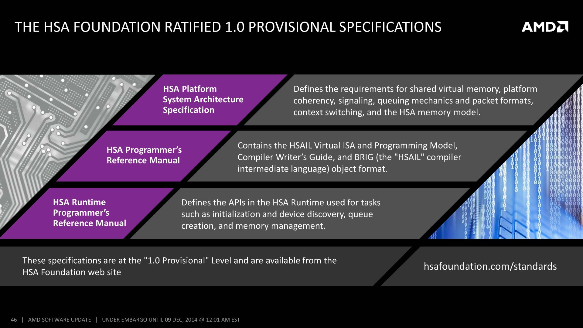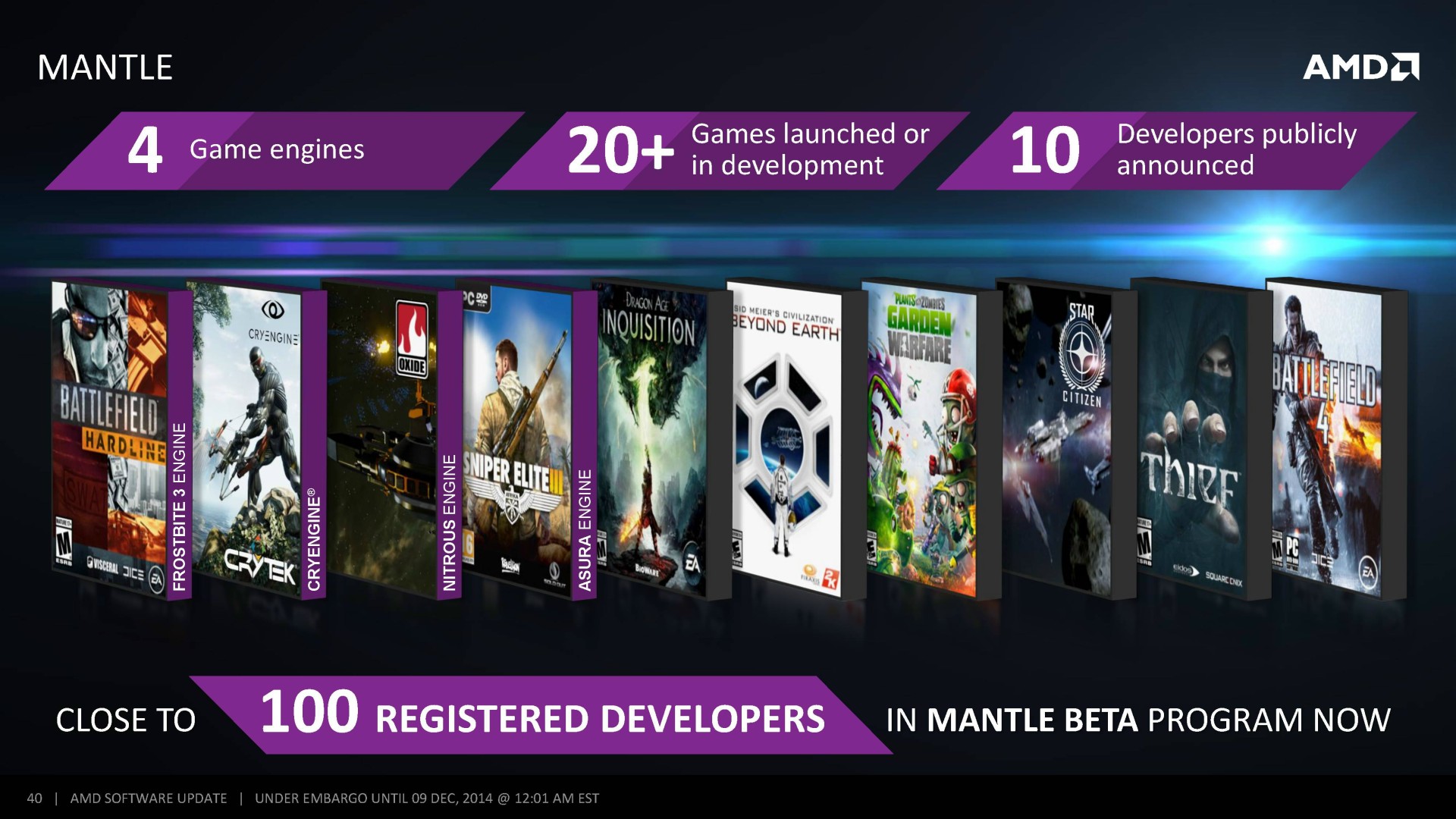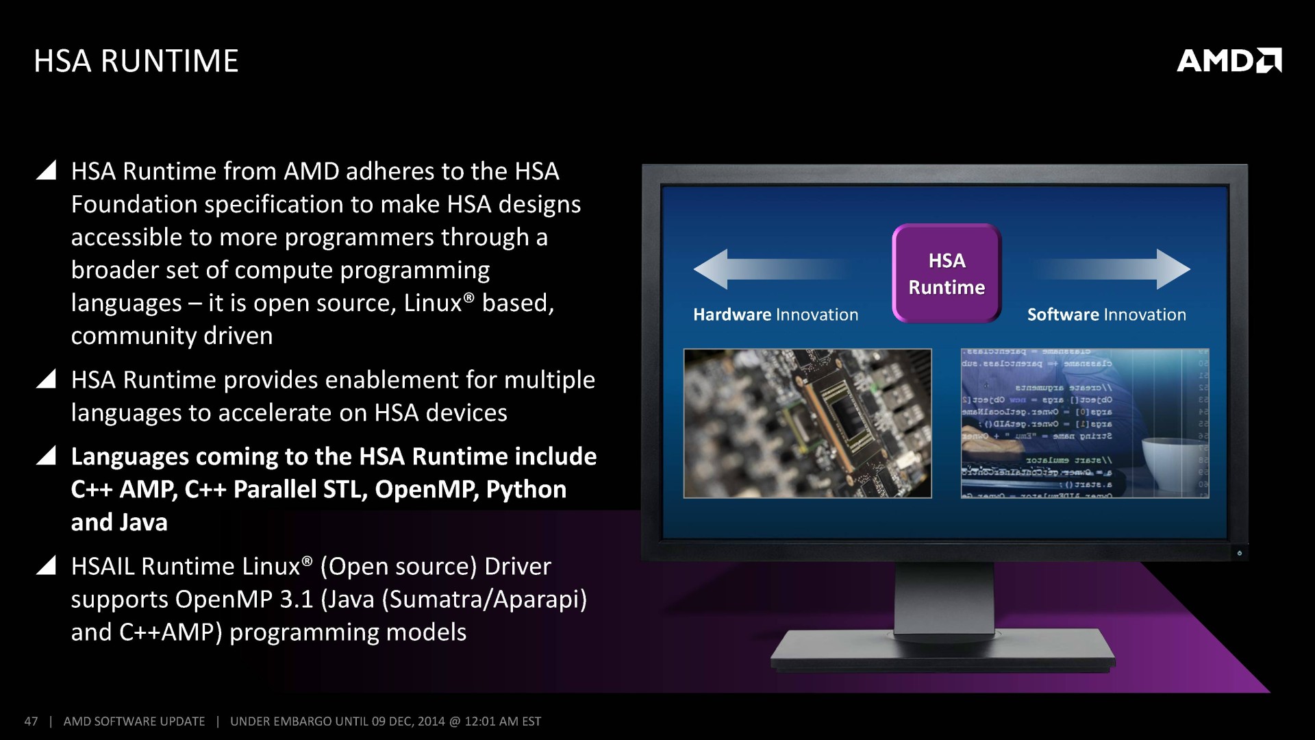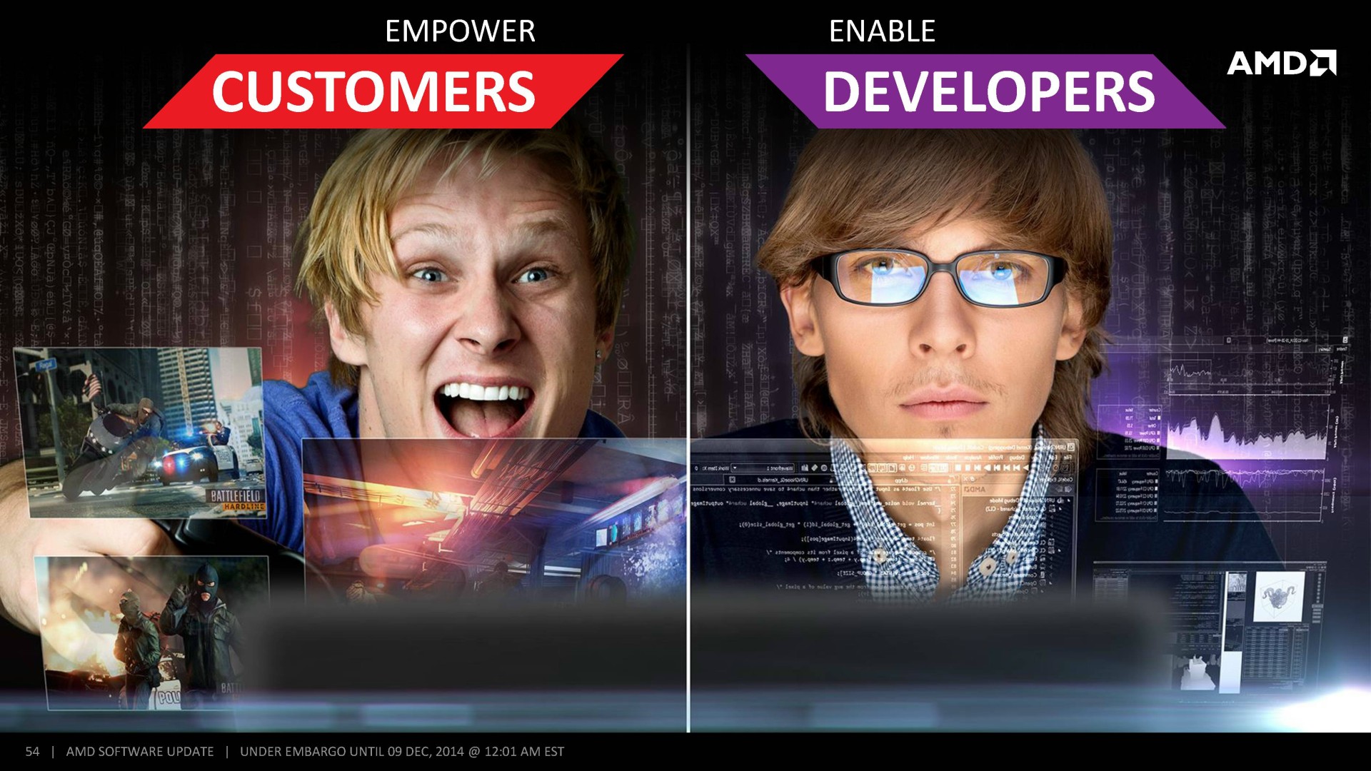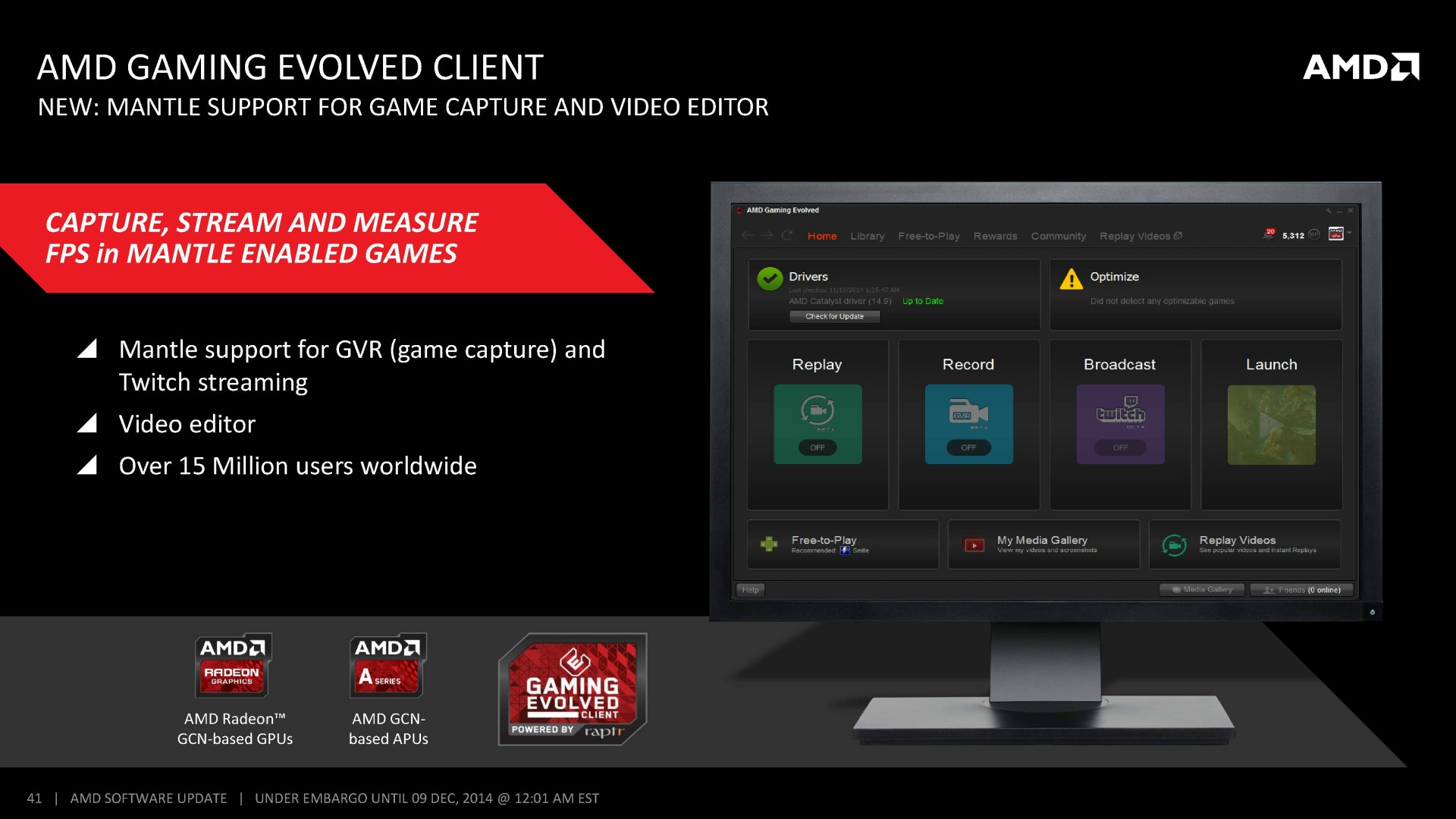 Pour accompagner ce support, AMD met à jour ses outils développeurs : CodeXL passe en version 1.6 et PerfStudio en version 3.1. CodeXL 1.6 gagne un mode de profiling tourné autour de la consommation des différentes composantes d'un APU, ainsi que le support d'OpenCL 2.0. GPU PerfStudio reçoit de son côté le support de Mantle et d'OpenGL 4.4.