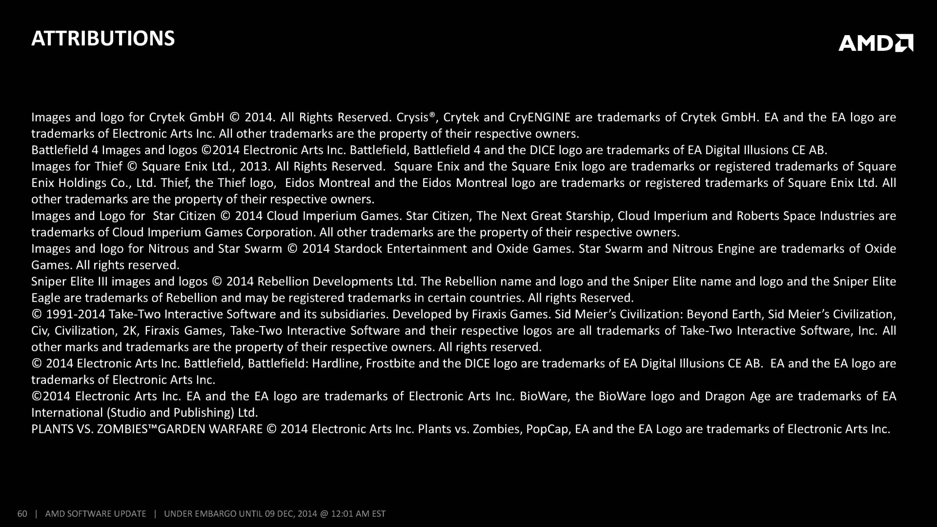 Avec une vingtaine de nouvelles fonctionnalités et de nombreux bugs corrigés, ces Catalyst Omega seront sans aucun doute à privilégier pour tous les utilisateurs de Radeon. AMD a cependant encore du travail pour peaufiner l'implémentation de certaines de ces fonctionnalités, telles que le mode VSR. Nous attendons également avec impatience de pouvoir enfin tester FreeSync, ce qui devrait se faire début 2015. Enfin, il restera à vérifier si les promesses d'amélioration de la qualité auront bel et bien un effet au-delà de la présentation que vous pourrez retrouver en intégralité dans la galerie ci-dessous :