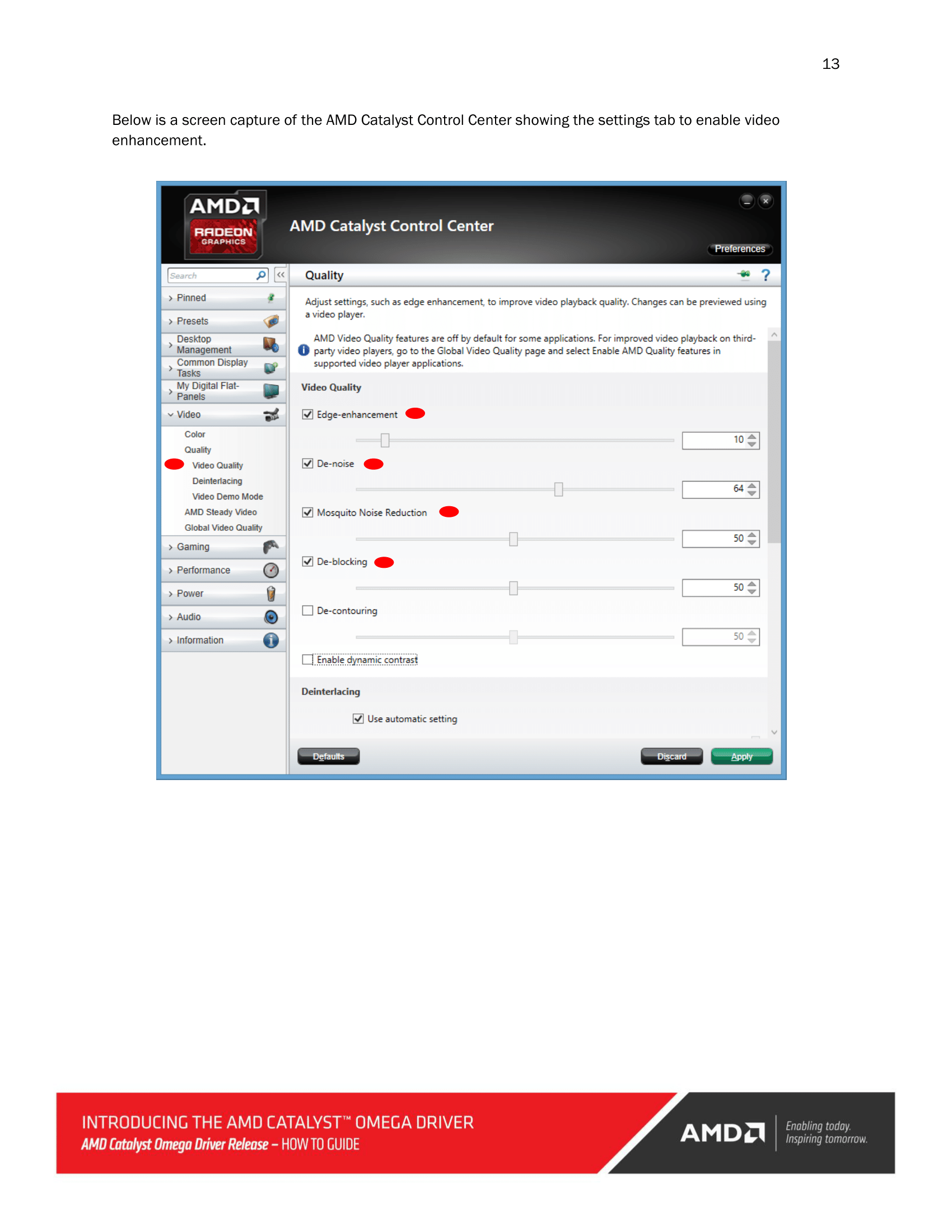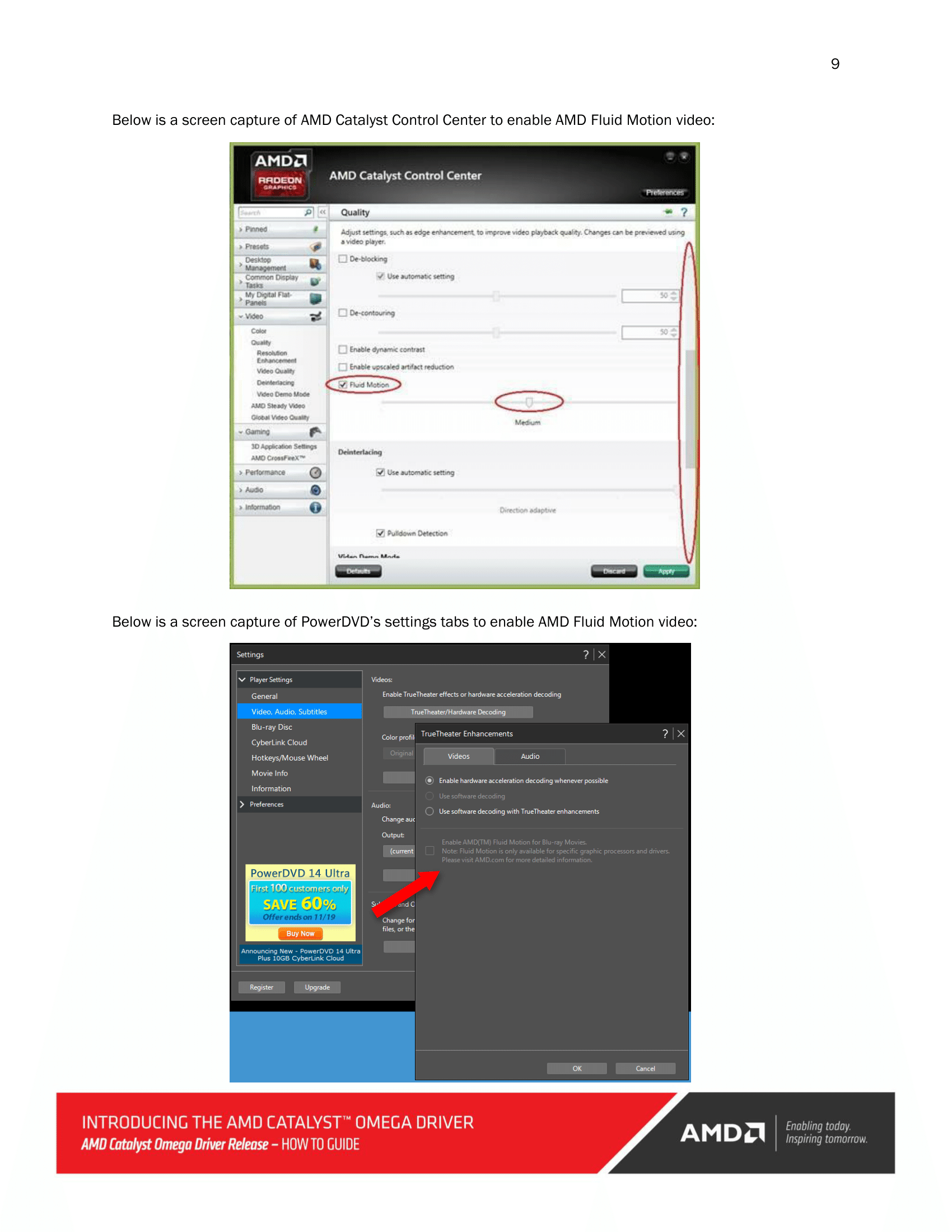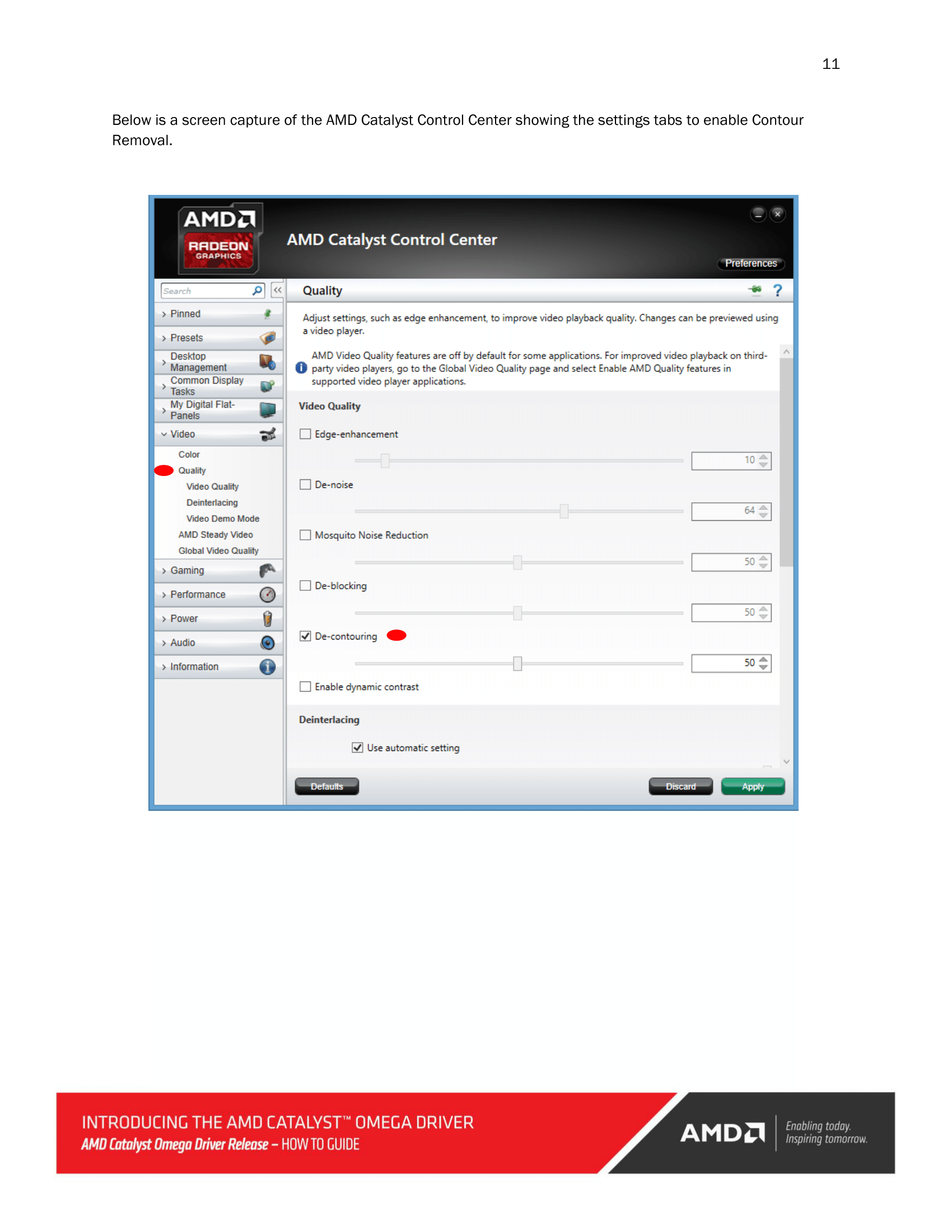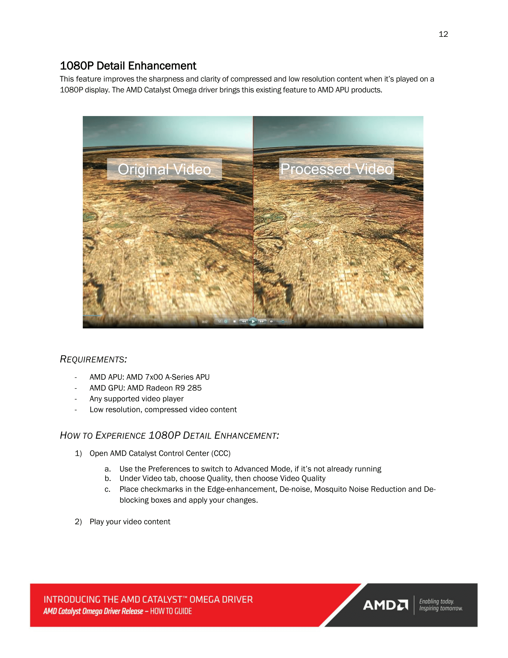 AMD apporte ensuite quelques améliorations qualitatives au niveau du décodage et de l'affichage des vidéos à travers les options Fluid Motion Video, Contour Removal et Detail Enhancement. Ces fonctions permettent d'intercaler des images intermédiaires, comme le font les TV modernes pour fluidifier la lecture, de supprimer les artéfacts liés à la compression et d'ajouter des détails aux vidéo lues sur des écrans 1080p ou 4K.