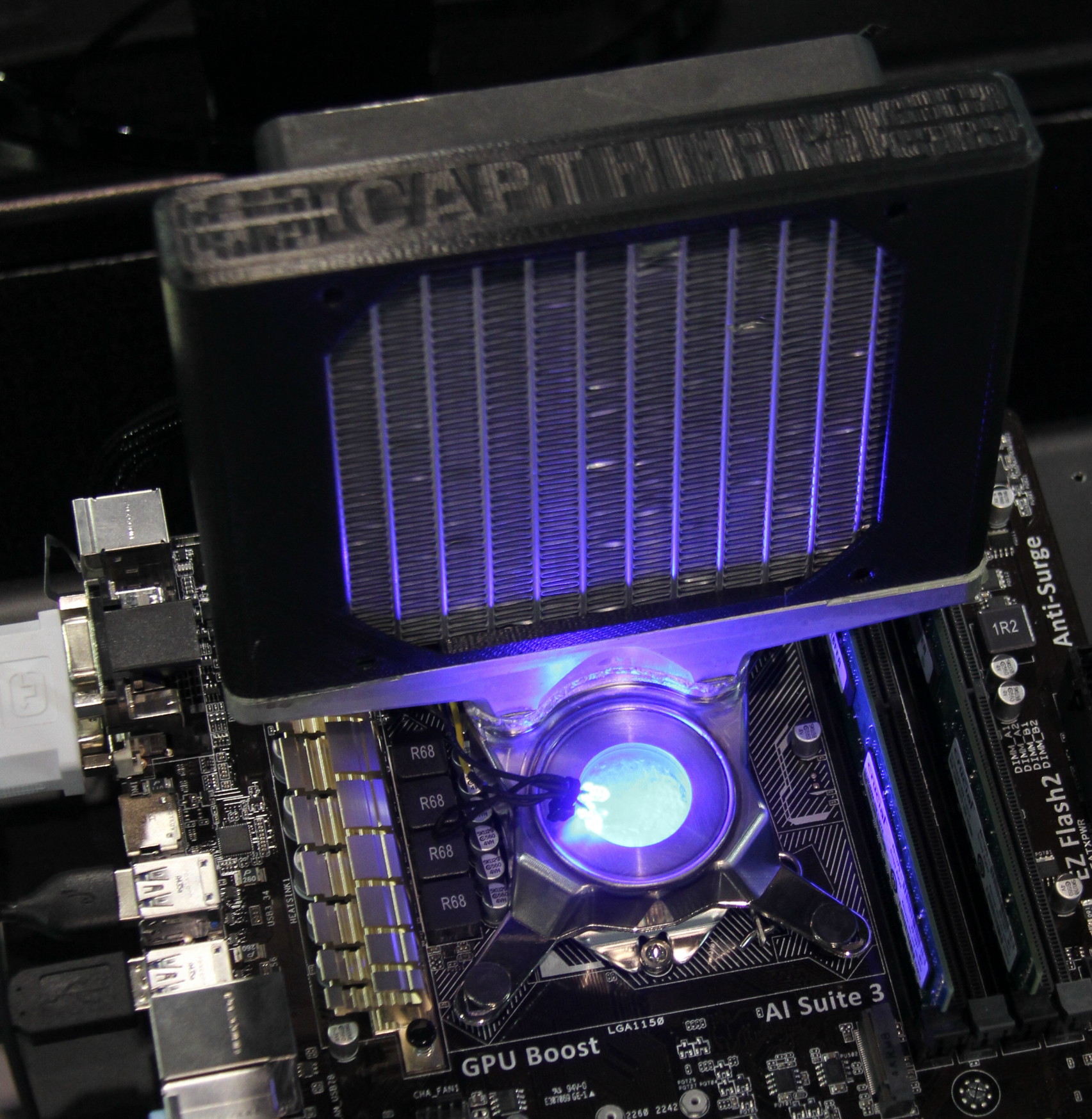 Ensuite, il faut parvenir à faire en sorte qu'un mouvement cyclique puisse se mettre en place. Pour cela il faut que l'orientation du radiateur soit dans une direction supérieure à la base. Nous ne savons pas exactement comment CapTherm pourra garantir que ce sera toujours le cas, mais le bloc de refroidissement CPU a été dessiné de façon à ce que ce soit le cas dans les boitiers classiques. Ceci dit, pour ne pas prendre de risque, les démonstrations se faisaient avec une carte-mère posée à 45 °C pour s'assurer que la base soit inclinée et que la vapeur puisse trouver son chemin de façon optimale.