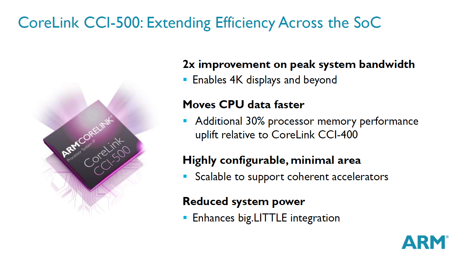 On notera que contrairement à l'annonce des A50, ARM n'annonce pas de core basse consommation (« LITTLE », des cores utilisant une architecture in order ou les instructions sont exécutés sans réordonnancement, contrairement aux architectures out of order utilisées sur les cores « big » où sur les processeurs x86 modernes) et il faudra dans un premier temps appairer des cores Cortex-A53 pour réaliser des SoC big.LITTLE. On soulignera par contre qu'ARM annonce une nouvelle version de son interconnexion système (Cache Coherent Interconnect) qui améliore de 30% les performances mémoires et permet désormais d'interconnecter jusque quatre groupes de cœurs (une architecture big.LITTLE en interconnecte deux).