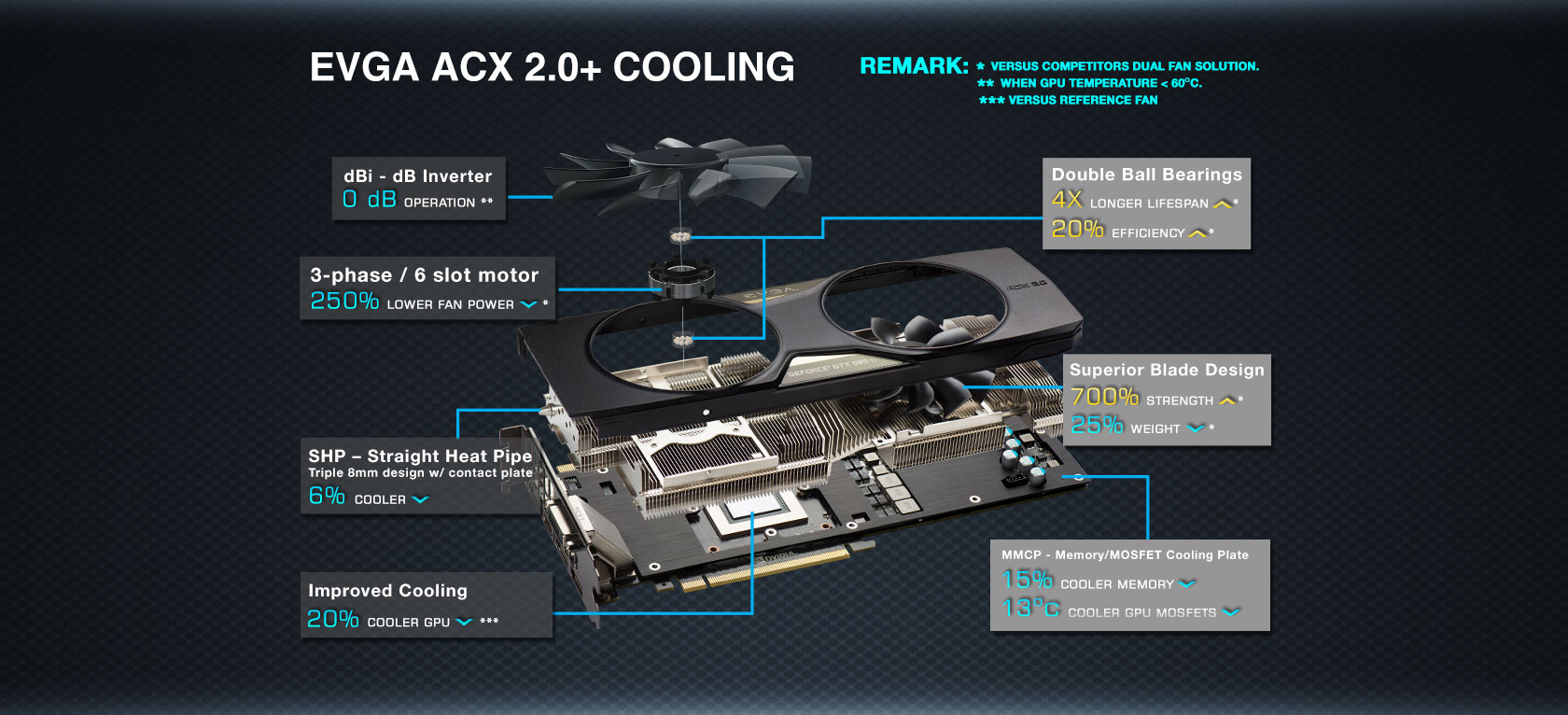 En plus de deux cartes basées sur le design de référence, l'une aux fréquences officielles (1000/1075 MHz) et l'autre à 1102/1190 MHz, trois modèles équipés d'un système de refroidissement ACX 2.0+ sont lancées dès aujourd'hui et ne devraient pas tarder à être disponibles puisqu'elles reprennent par contre le PCB de référence : GTX 980 Ti ACX 2.0+ (1000/1075), GTX 980 Ti Superclocked ACX 2.0+ (1102/1190) et GTX 980 Ti Superclocked+ ACX 2.0+ (?).