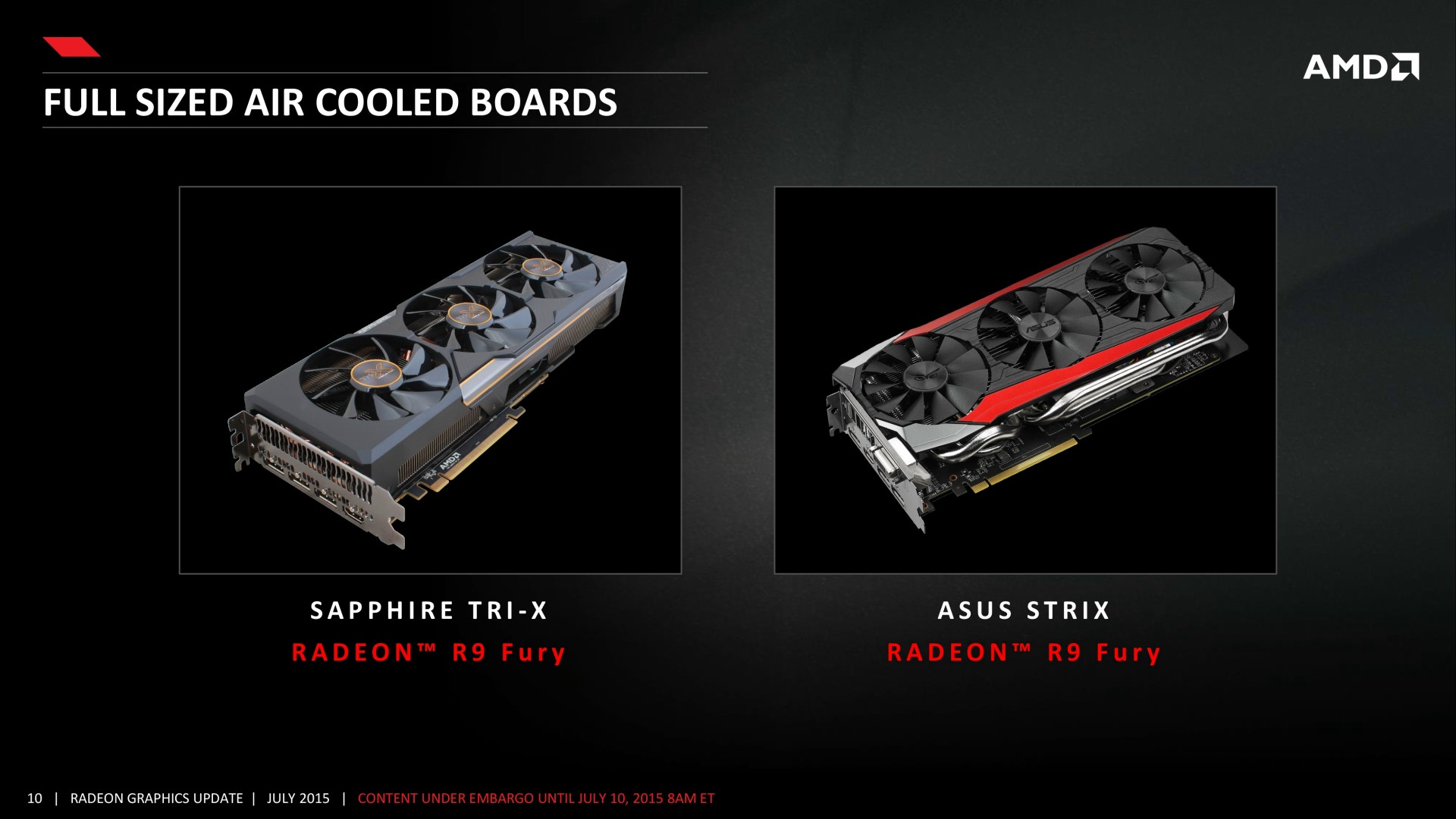 Probablement suite à une disponibilité limitée du GPU Fiji, AMD n'a proposé le kit de développement de la Radeon R9 Fury qu'à deux de ses partenaires : Sapphire et Asus. Ceux-ci ont ainsi pu développer leur solution de refroidissement personnalisée et recevoir des PCB de référence complets (Sapphire) ou développer leur propre version (Asus). Nous ne savons pas si et quand AMD proposera cette solution à d'autres partenaires, ce qui ne manquera pas de faire grincer des dents.