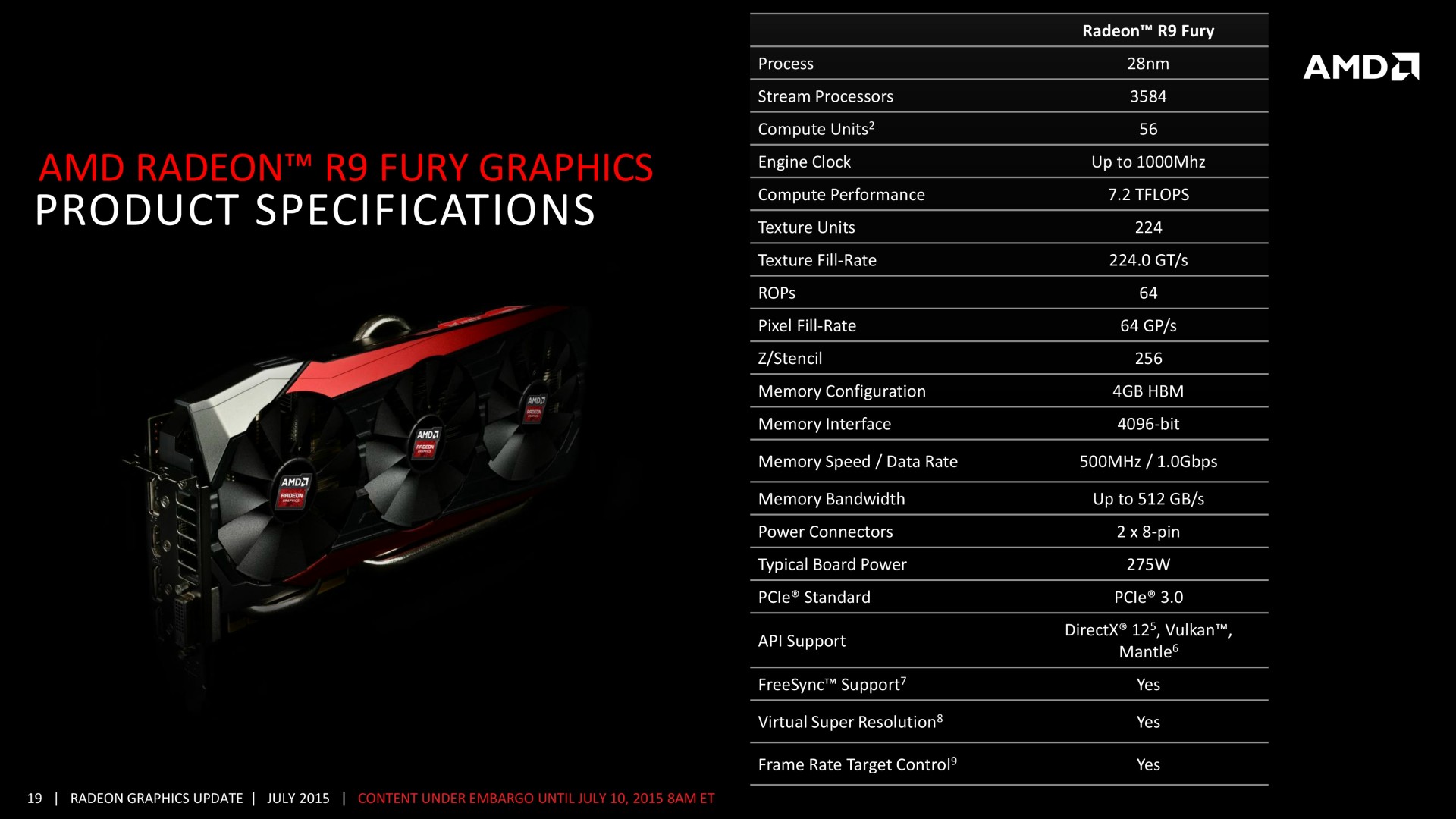 Au niveau des fréquences de référence, il est question de 1000 MHz pour le GPU, une baisse de 5% par rapport à la R9 Fury X. Au final, la R9 Fury affiche une puissance de calcul de 7.2 Tflops, en baisse de 17% par rapport à sa grande sœur. La bande passante mémoire reste par contre identique, tout comme le débit de pixels ou de triangles.