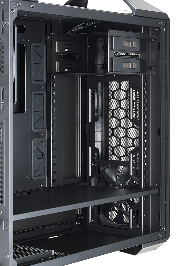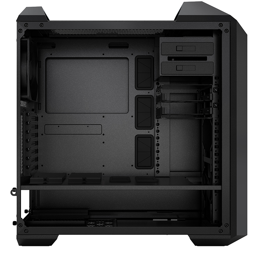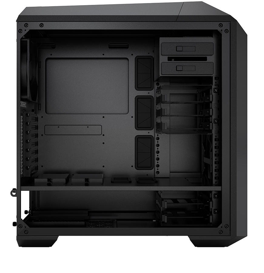 Si on se passe des baies 5.25" on pourra installer 3 ventilateurs 140mm ou un radiateur 280mm à l'avant, alors qu'à l'arrière on peut installer un ventilateur ou radiateur 140mm, contre deux ventilateurs 140mm ou un radiateur 240mm au-dessus. Le ventirad peut mesurer jusqu'à 19 cm de hauteur, l'alimentation 20cm de longueur alors que pour la carte graphique on a droit à 29,6 à 41,2cm selon la position de la cage HDD.