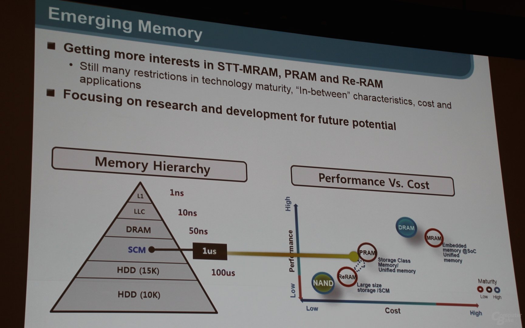 Enfin Samsung a rapidement évoqué les mémoires intermédiaires entre DRAM et NAND telles que la TT-MRAM, la PRAM et la Re-RAM, indiquant toujours travailler sur le sujet mais que les technologies manquaient encore de maturité.