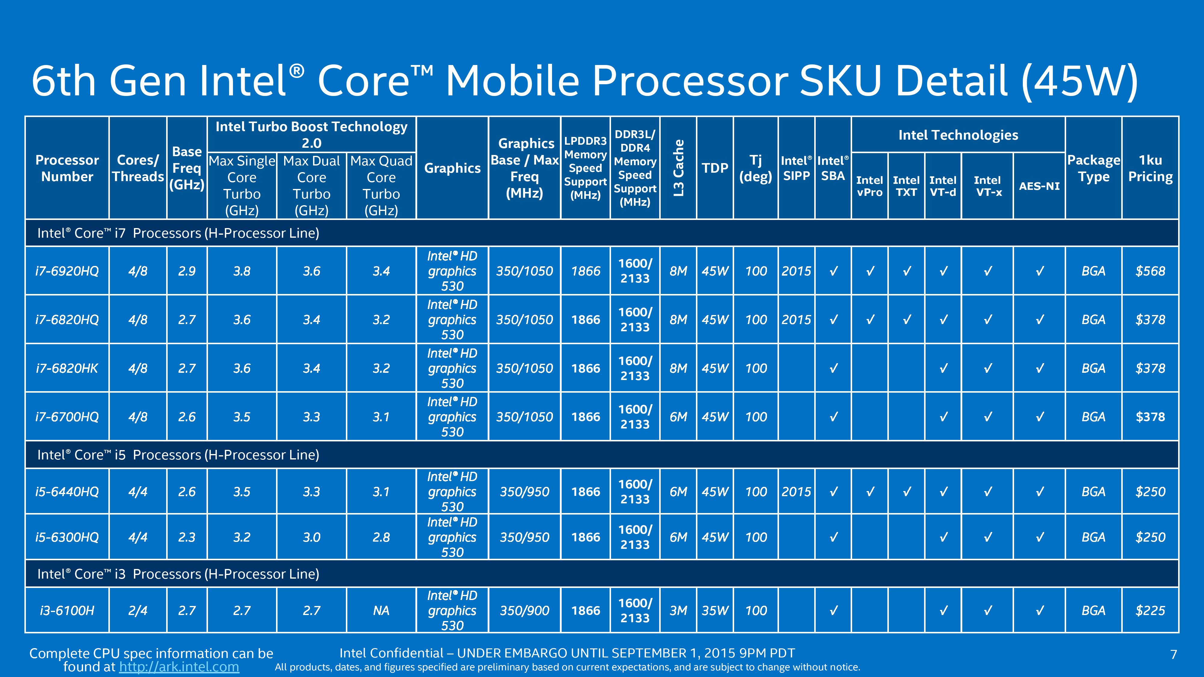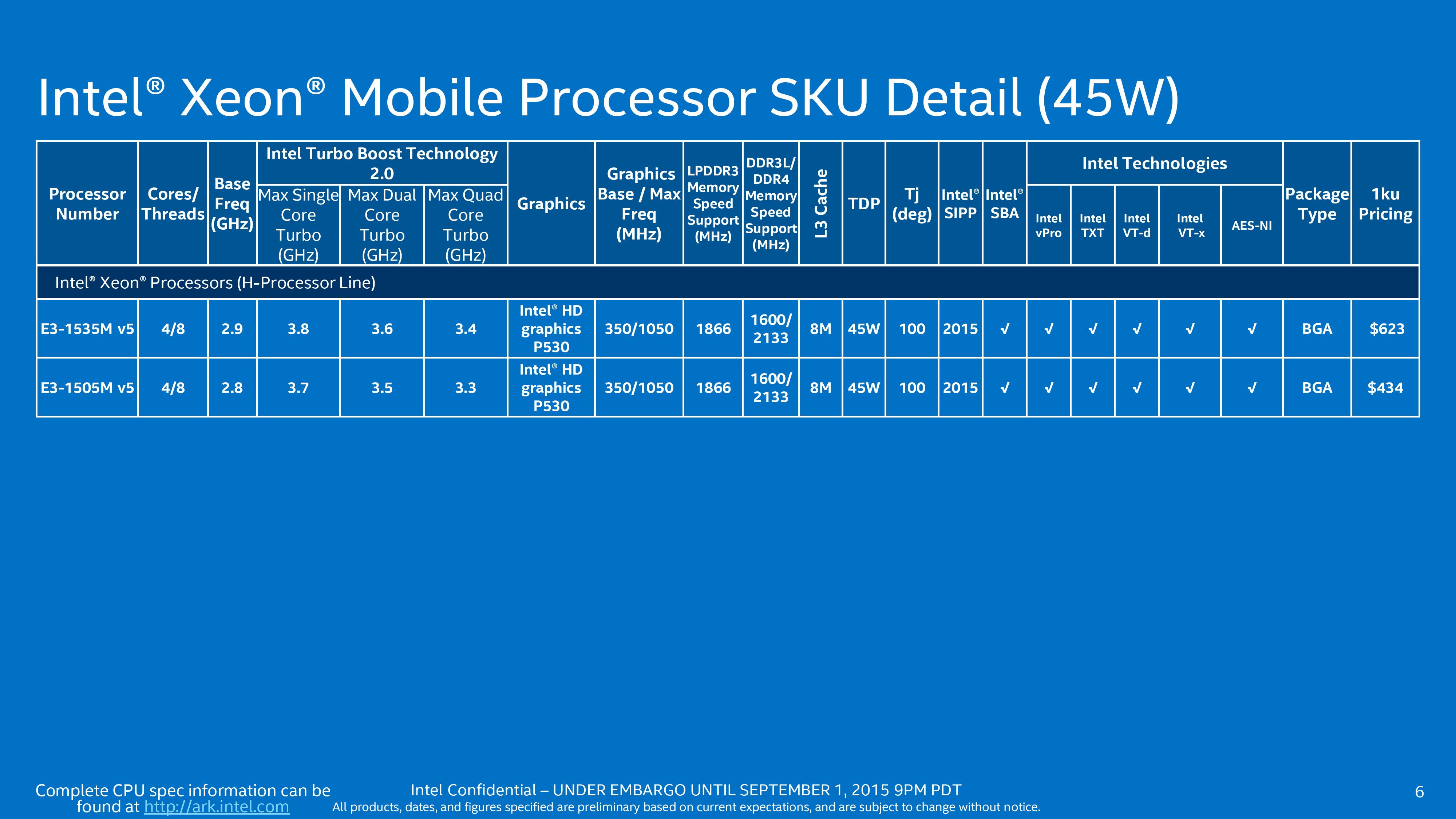 Pour ce qui est annoncé aujourd'hui, on retrouve deux gammes, la gamme Core classique ainsi qu'une gamme Xeon. Cette dernière se distingue par son support de la mémoire ECC et de vPro (qui était déjà supporté sur certains modèles)… et par un prix plus élevé. En pratique il s'agit des mêmes die et l'on cherchera au-delà du prix les différences entre le Core i7 6920HQ et le Xeon E3 1535M v5. Une autre puce se distingue à 45W, le Core i7-6820HK dont le coefficient multiplicateur sera débloqué.
