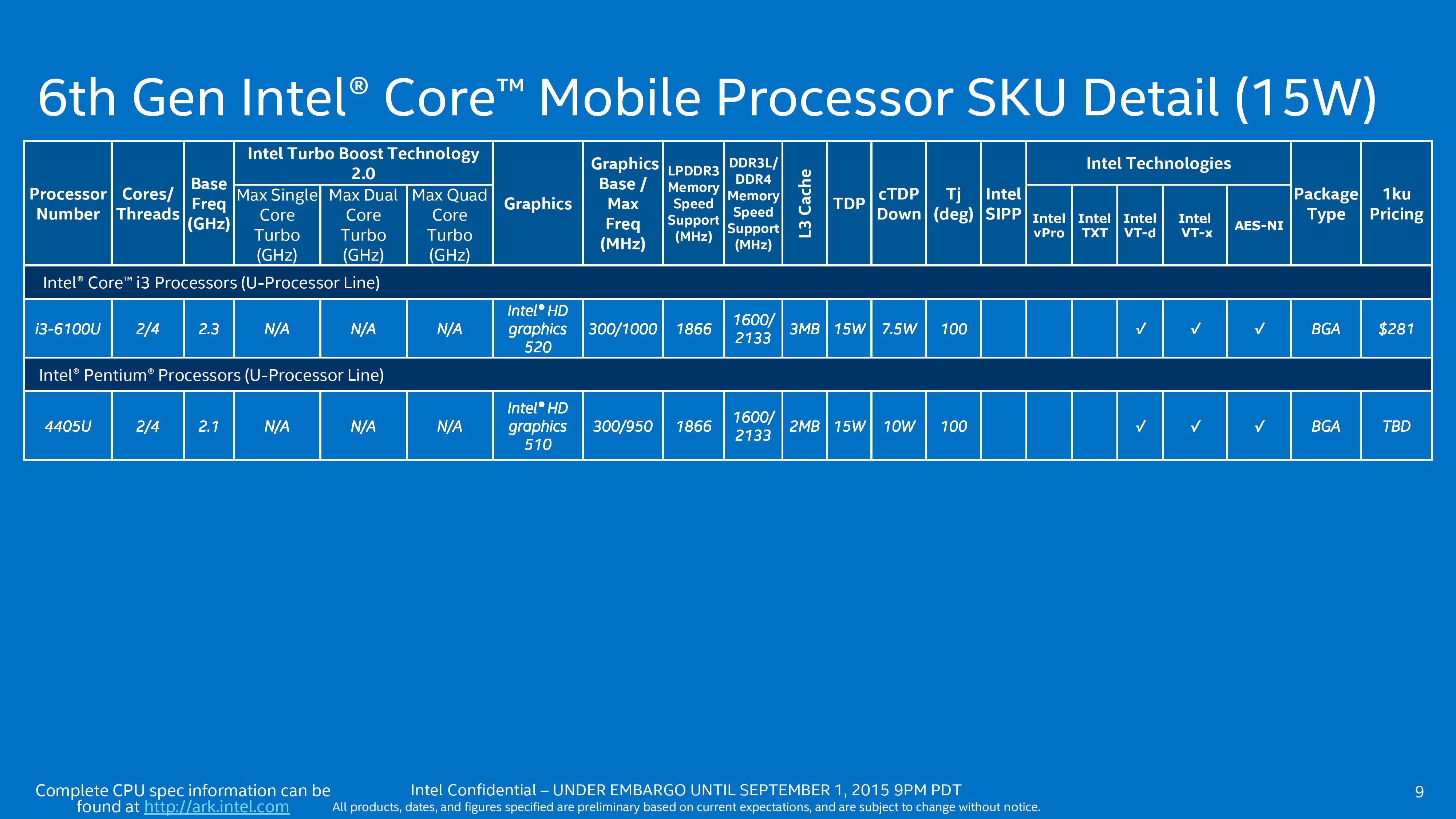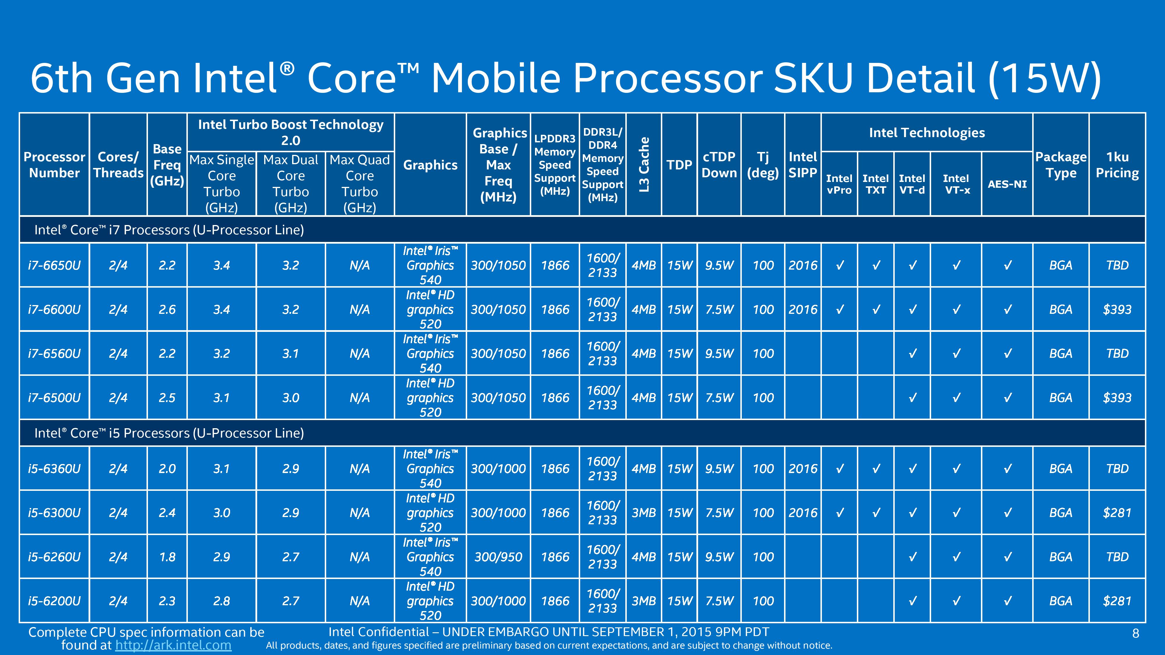 A 15 watts, on retrouvera à nouveau deux configurations différentes. D'abord la version double cœur + GT3e, la même configuration qu'a 28W, mais avec des fréquences revues à la baisse. Là encore ces puces ne seront pas disponibles immédiatement. L'autre configuration est plus classique, avec deux cœurs et l'IGP GT2 (24 EU sans eDRAM). On notera que la fréquence de base est réduite sur les modèles GT3e par rapport aux modèles GT2 équivalents, même si les fréquences Turbo sont identiques ou proches. En pratique l'ajout d'un IGP plus gros et de l'eDRAM devrait pousser le package plus rapidement vers sa limite de TDP.