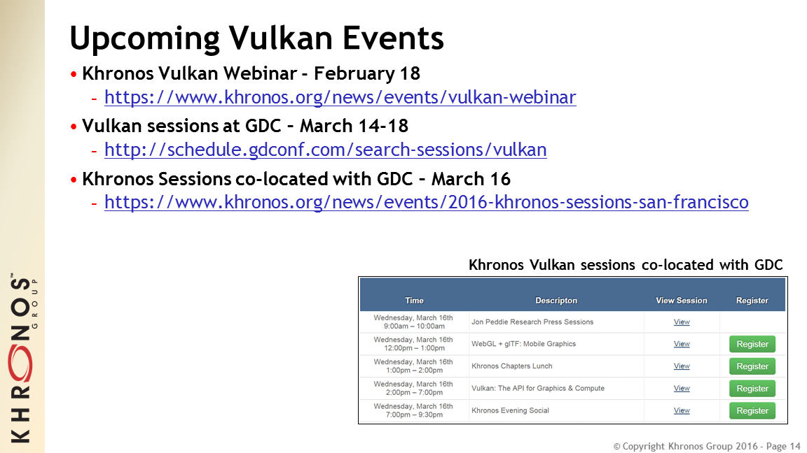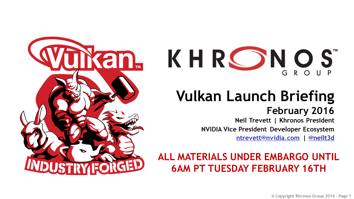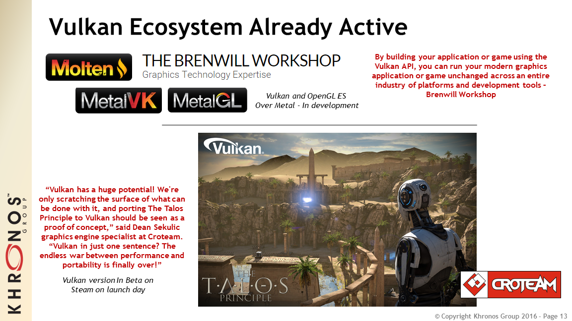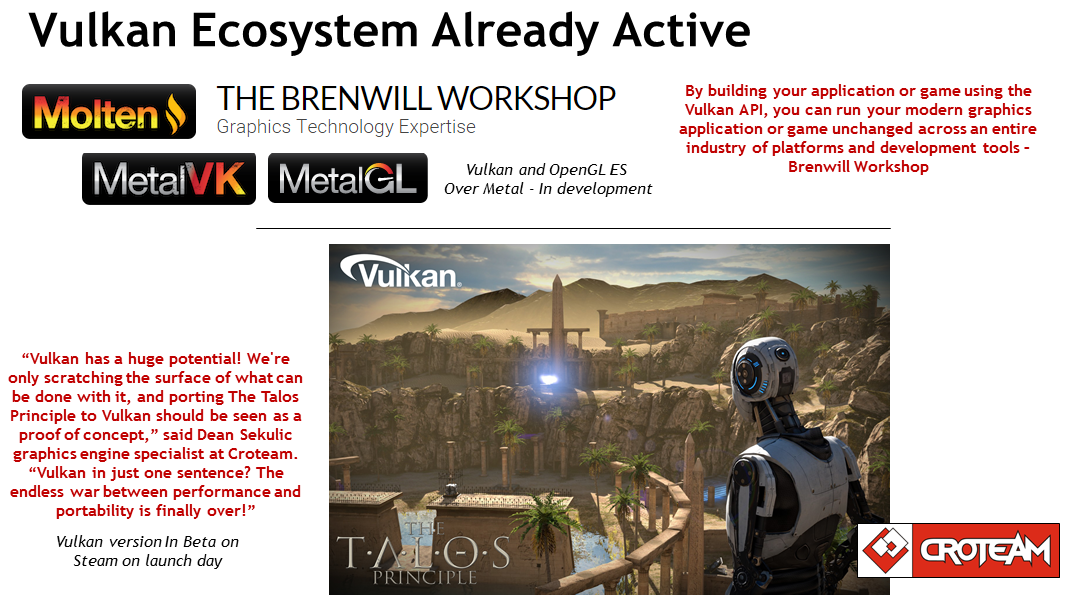 Pour plus d'informations techniques, les spécifications de Vulkan sont disponibles sur le site de Khronos et nous avons ajouté ci-dessous la présentation complète de Khronos destinée à la presse technique :
