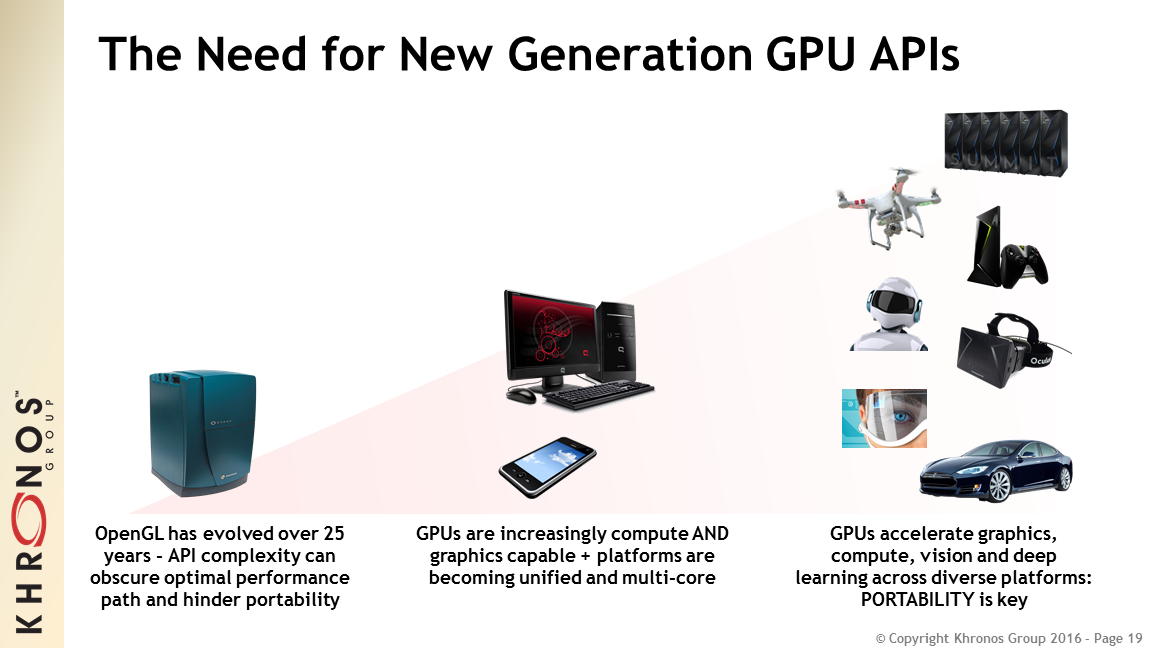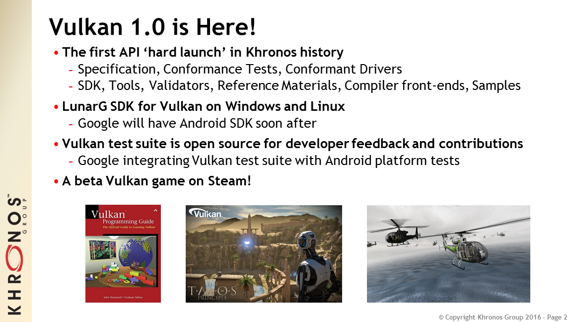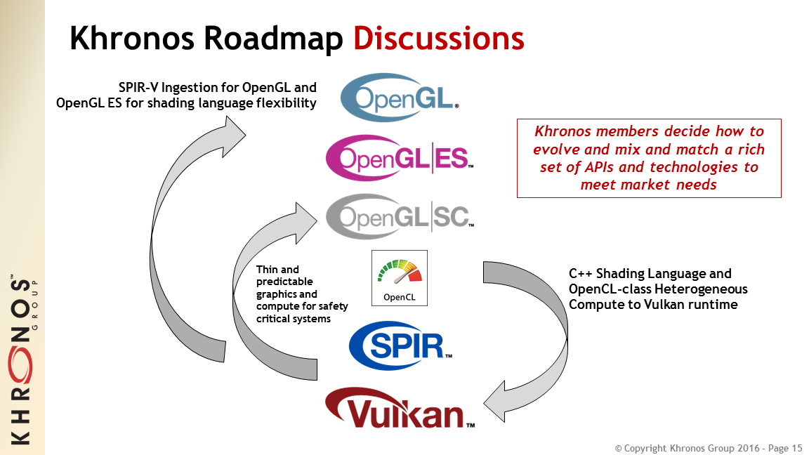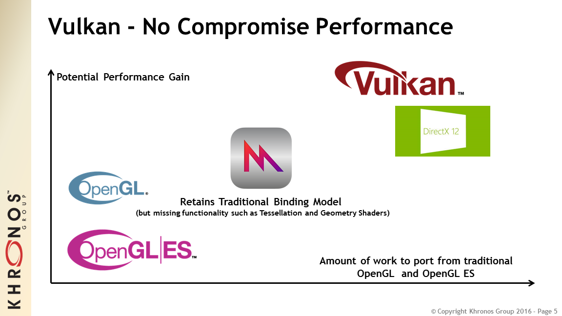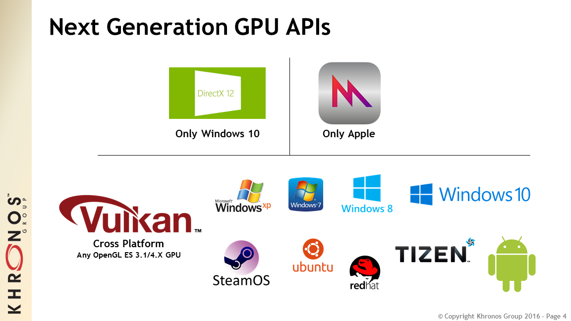 Il y a un an, lors de la GDC 2015, Khronos dévoilait Vulkan, sa vision de l'API graphique de plus bas niveau. Face à Mantle, Direct3D 12 ou encore Metal, Khronos se devait de réagir rapidement pour rester dans la course. Avec cette concurrence et une demande insistante des développeurs, une évolution radicale d'OpenGL, son API graphique historique, était aussi nécessaire que difficile à mettre en place. Pour bouger rapidement et éviter tout compromis boiteux, Khronos a pris la décision de mettre au point une API complémentaire à OpenGL et non de faire évoluer cette dernière vers un plus bas niveau d'abstraction. OpenGL et Vulkan vont coexister, évoluer côte à côte dans le futur, partager certains points communs mais rester distinctes sur d'autres.