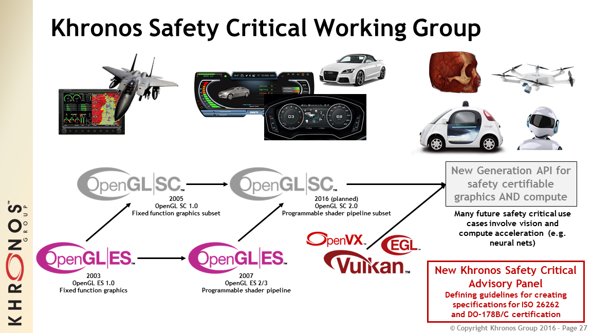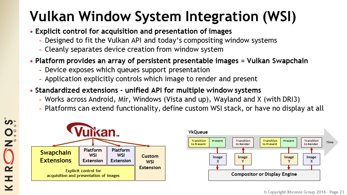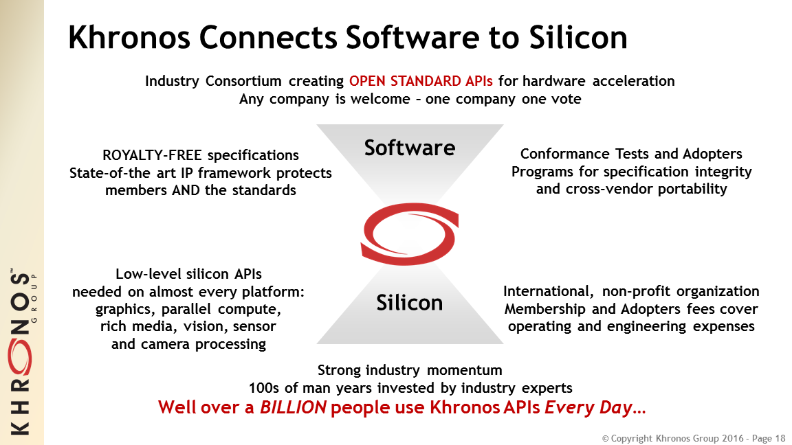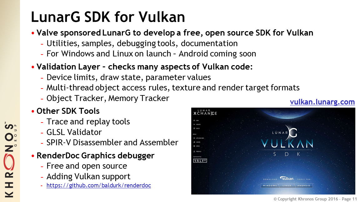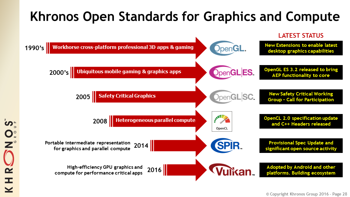 Il y a un an, lors de la GDC 2015, Khronos dévoilait Vulkan, sa vision de l'API graphique de plus bas niveau. Face à Mantle, Direct3D 12 ou encore Metal, Khronos se devait de réagir rapidement pour rester dans la course. Avec cette concurrence et une demande insistante des développeurs, une évolution radicale d'OpenGL, son API graphique historique, était aussi nécessaire que difficile à mettre en place. Pour bouger rapidement et éviter tout compromis boiteux, Khronos a pris la décision de mettre au point une API complémentaire à OpenGL et non de faire évoluer cette dernière vers un plus bas niveau d'abstraction. OpenGL et Vulkan vont coexister, évoluer côte à côte dans le futur, partager certains points communs mais rester distinctes sur d'autres.