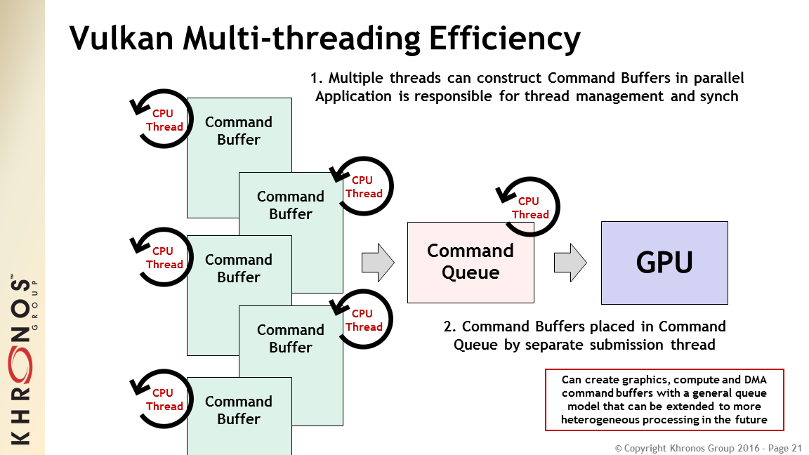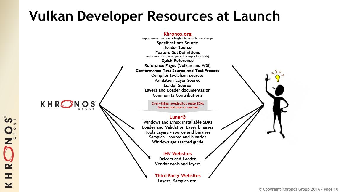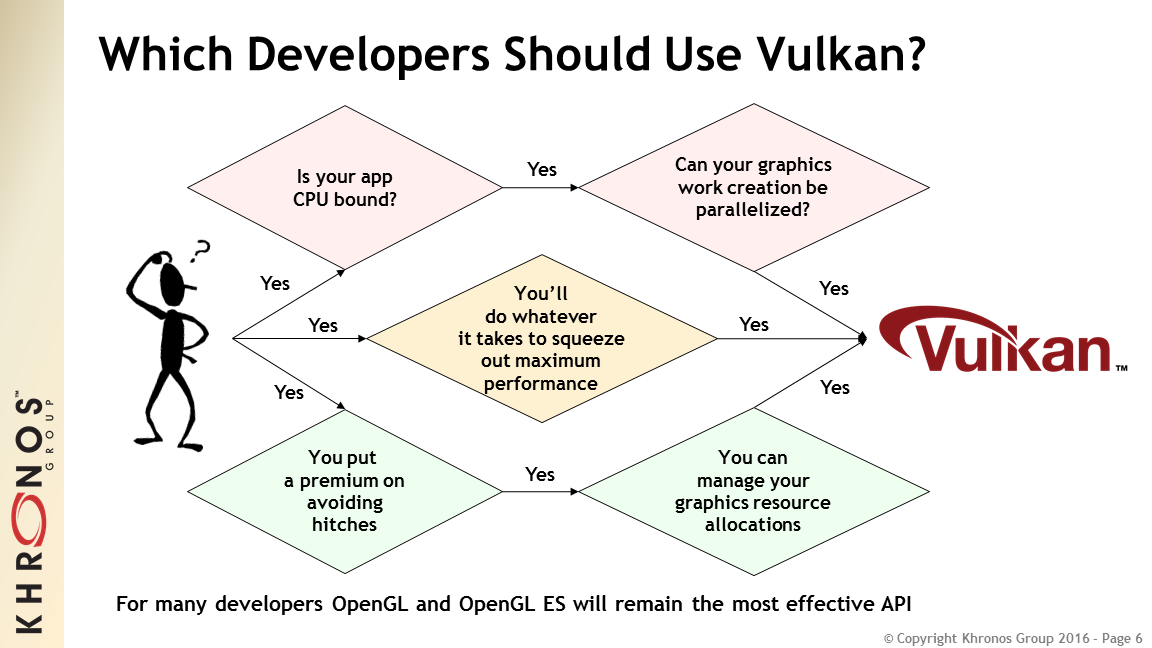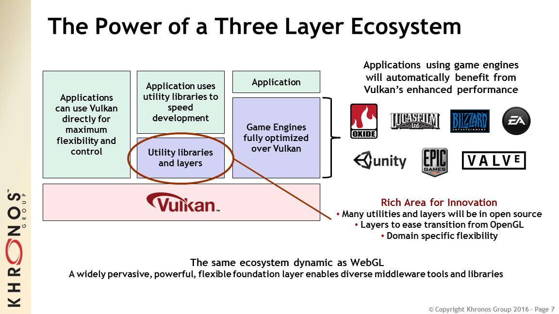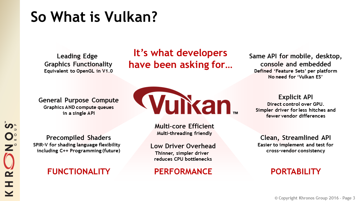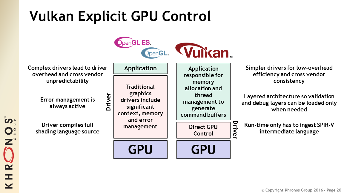 Pour en savoir plus sur la philosophie qui se cache derrière Vulkan, n'hésitez pas à repasser par l'actualité liée à la présentation de Vulkan en mars dernier. Rappelons simplement qu'à la base des travaux de Khronos, nous retrouvons l'API Mantle qui a été "offerte" par AMD (une contribution que Khronos affiche sans détour contrairement à Nvidia qui ne peut s'empêcher d'essayer de la minimiser autant que possible).