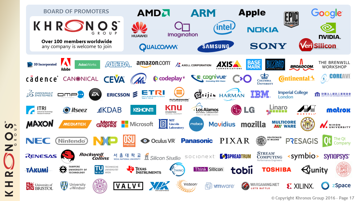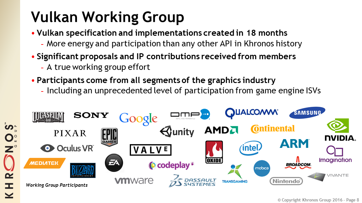 Ses fondamentaux sont toujours là, il aurait été inutile de réinventer la roue, mais après 18 mois de travaux, de nombreuses modifications plus ou moins importantes ont été apportées par le groupe de travail mis en place au sein de Vulkan. Dans sa documentation destinée aux développeurs, Nvidia indique ainsi qu'une douzaine de sociétés ont apporté des contributions majeures et au moins le double étaient sérieusement impliquées dans le projet. Neil Trevett, le Président du consortium (et accessoirement le Vice-Président de l'écosystème développeur chez Nvidia) avec lequel nous avons pu nous entretenir, a tenu à insister sur l'implication plus importante que jamais des développeurs de moteurs de jeu.