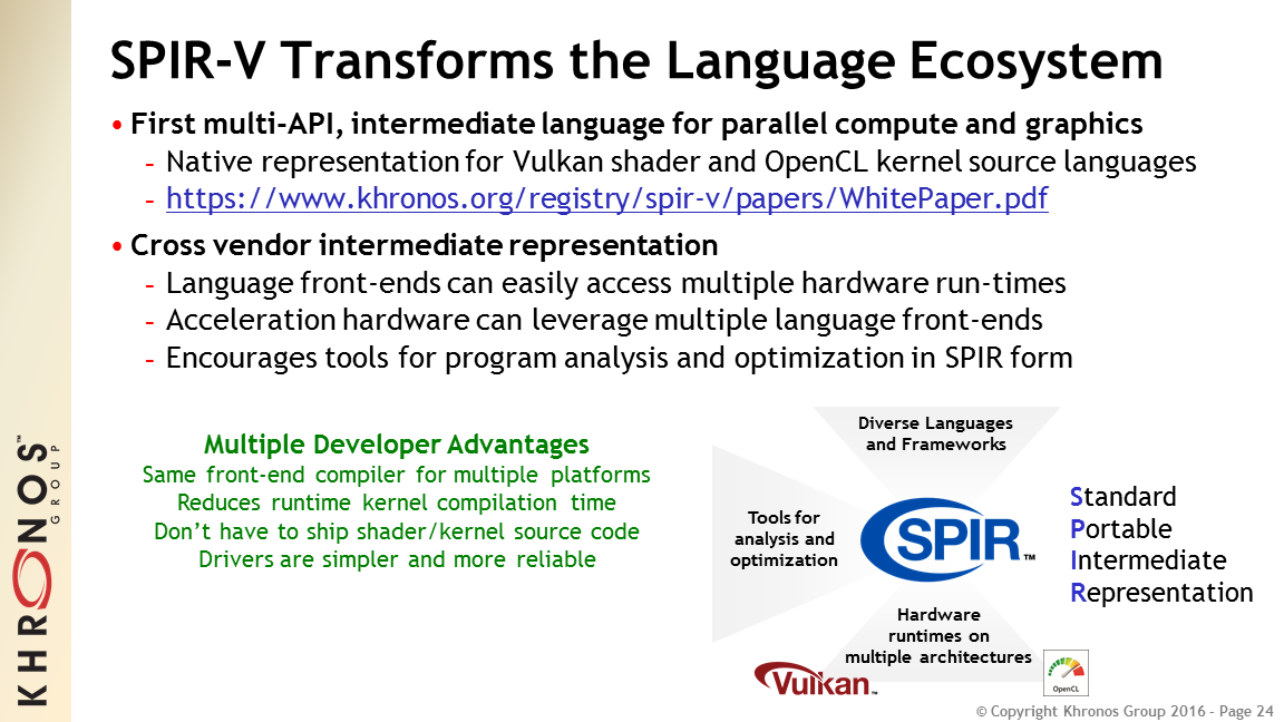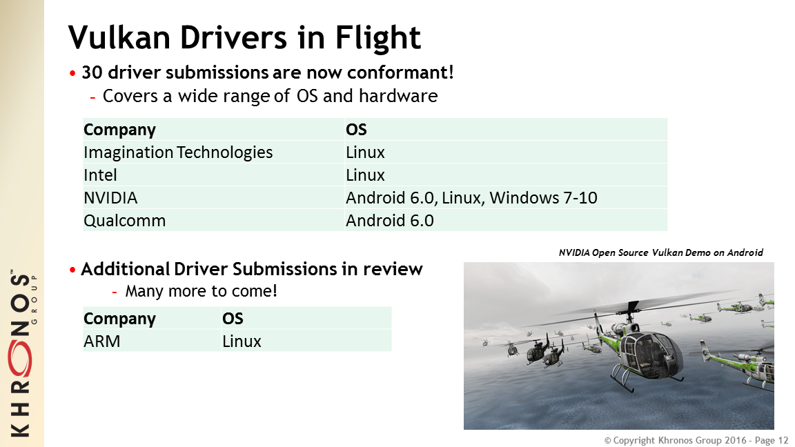 Du côté d'Intel, un pilote a été certifié par Khronos pour Skylake sous Linux, mais nous ne savons pas quand il sera disponible. Imagination dispose également d'un pilote certifié sous Linux (nous avons pu le voir en démo lors du CES), tout comme Qualcomm sous Android 6.0. ARM est également annoncé comme prêt à fournir un pilote sous peu.