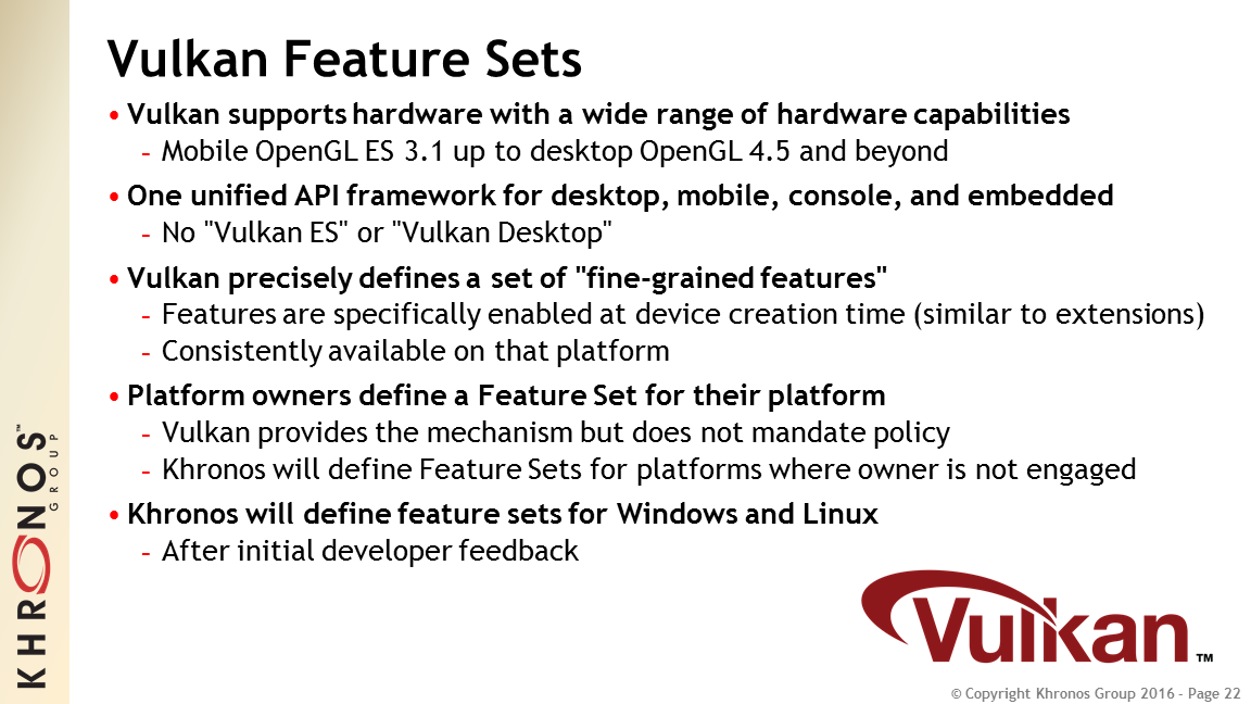 Vulkan supporte tout type d'extensions, exactement comme OpenGL, mais face à la large plage de possibilités liée au matériel supporté (de type OpenGL ES 3.1 mobile à OpenGL 4.5 desktop et supérieur), Khronos a mis en place des feature sets, soit un niveau de fonctionnalité minimum garanti. Ceux-ci sont définis par plateforme, de préférence par l'organisme qui contrôle la dite plateforme, et par Khronos si cet acteur tiers ne souhaite pas s'impliquer. Ces feature sets sont toujours en cours de finalisation et ne devraient être publiés que d'ici 1 ou 2 mois.