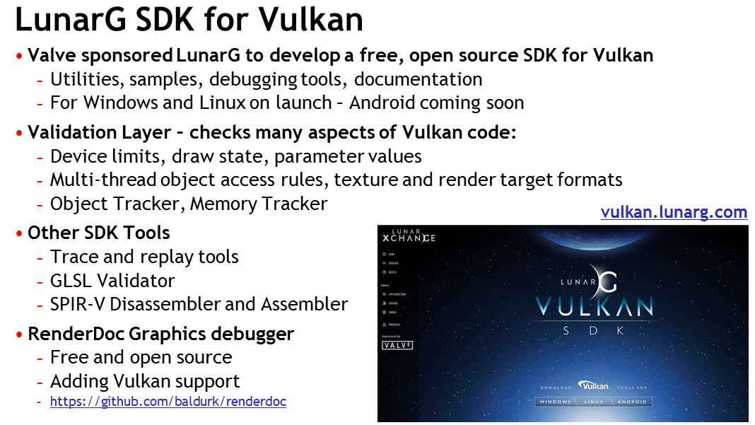 Après 18 mois de gestation, Khronos annonce la disponibilité immédiate de la variante plus bas niveau d'OpenGL : Vulkan. Pour les premiers pas de cette API graphique qui promet une meilleure exploitation des différentes plateformes, sont directement proposés des kits de développements, des pilotes et même le portage beta d'un jeu PC.