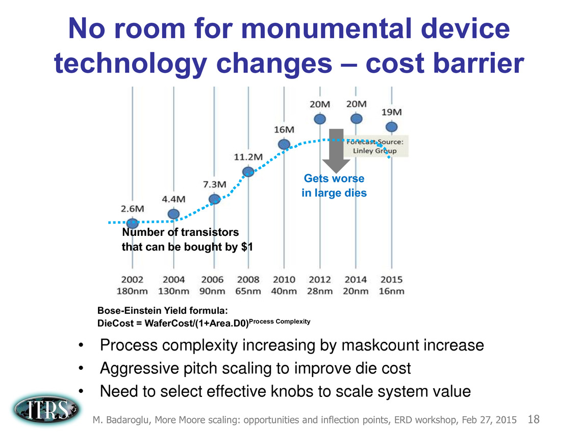 Évidemment depuis 2013 les choses se sont un peu plus compliquées et l'absence de roadmap en provenance de l'ITRS n'a pas forcément aidé. En pratique, la réduction des coûts s'est arrêtée, avec même un retour en arrière à 16nm signant de facto la fin de la loi de Moore, comme on peut le voir sur cette estimation ci-dessus tirée d'une présentation de l'ITRS en février 2015.