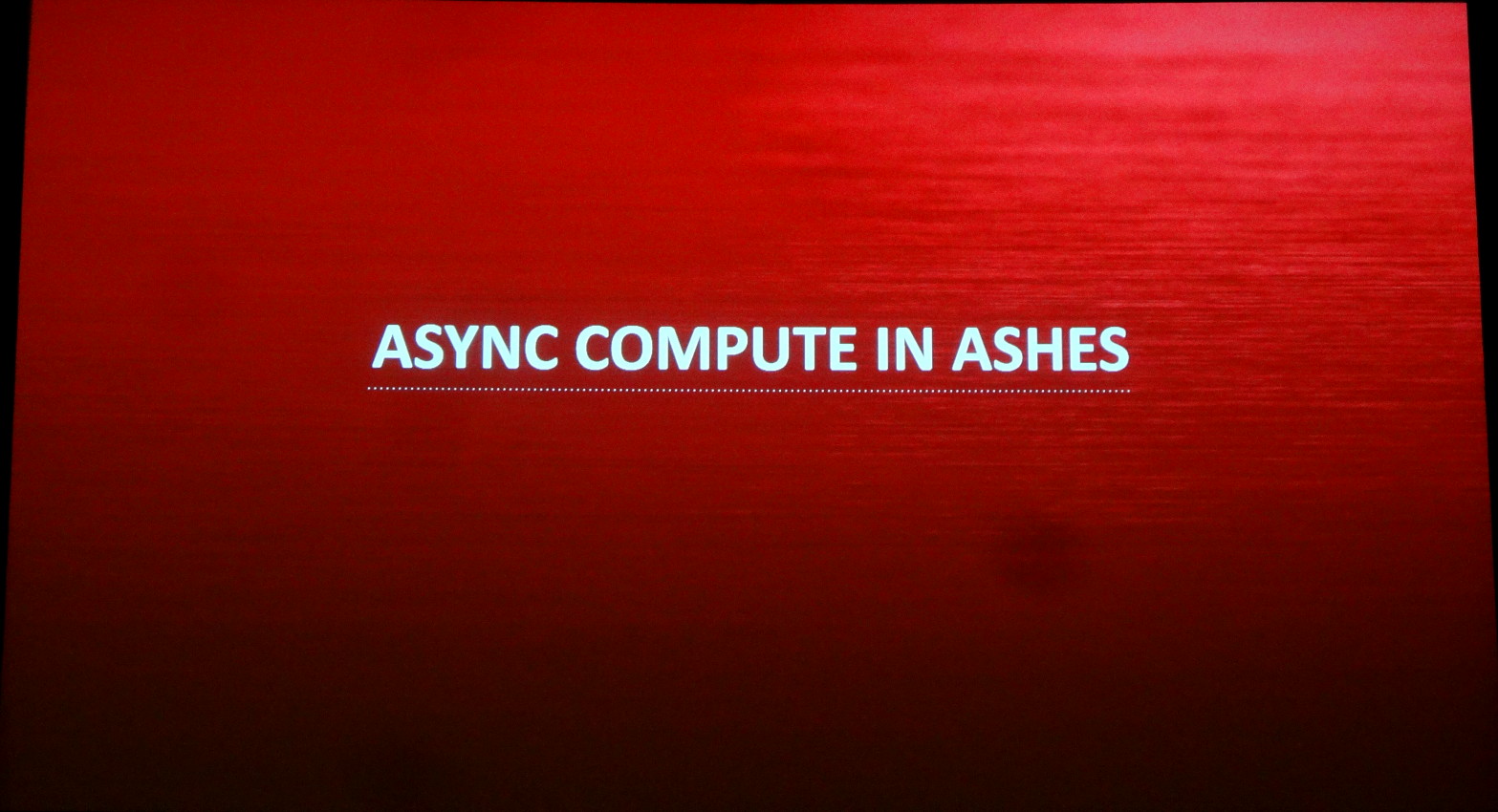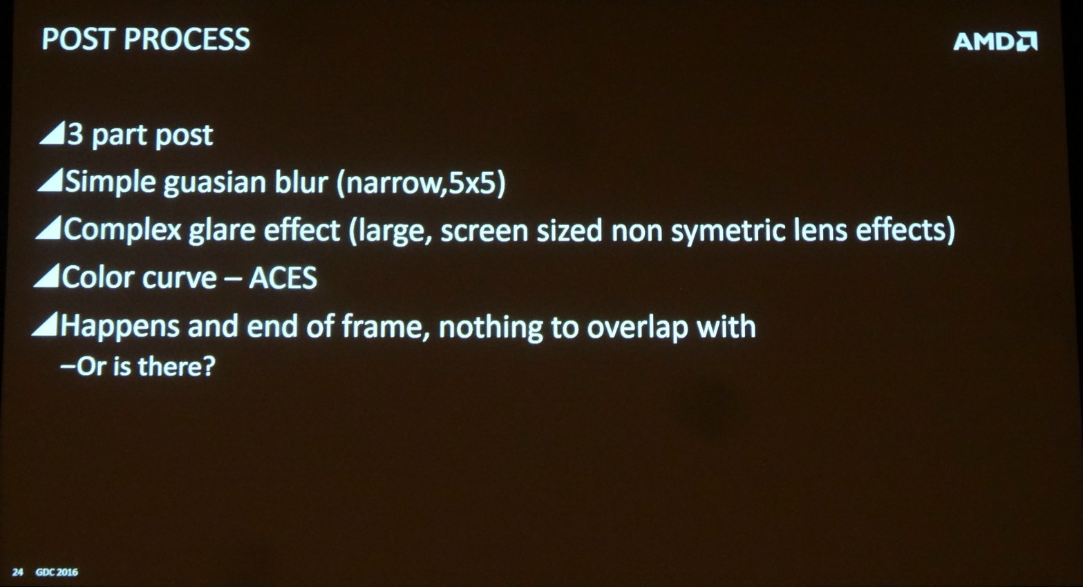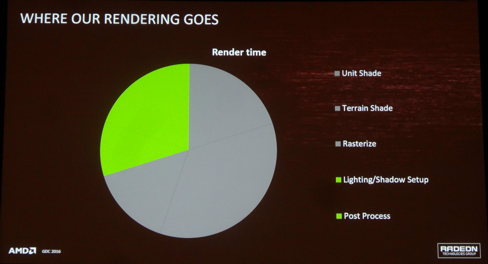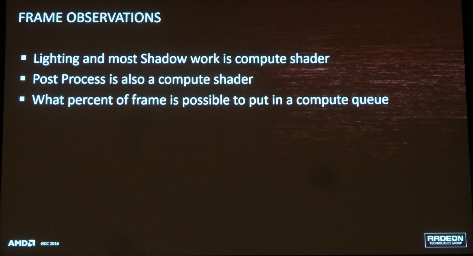 Dans le cas du moteur d'Ashes of the Singularity (AotS) il y a 2 larges pans du rendu qui sont traités via des computes shaders : l'éclairage et les ombres d'une part et le post processing d'autre part. Ils représentent à peu près 30% du temps de rendu d'une image typique et semblent donc être de bons candidats. C'est particulièrement le cas pour le post processing qui intervient en fin de rendu et peut sans problème être traité pendant que le travail commence sur une nouvelle image.