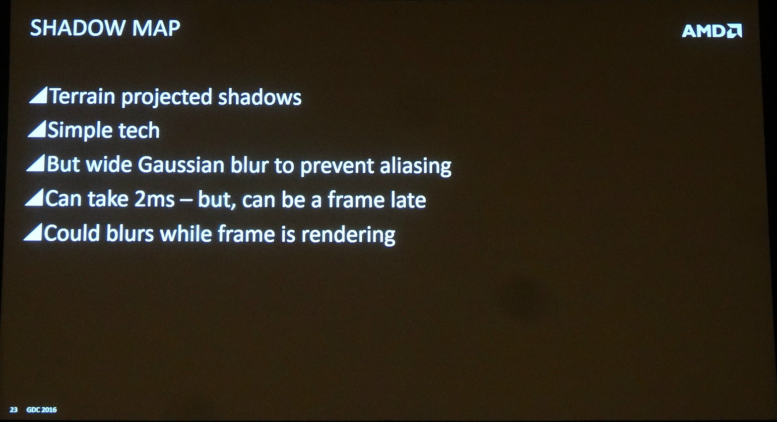 Reste le second point qui peut potentiellement être traité en parallèle via une file compute : l'éclairage et les ombres. Il est plus délicat à aborder et Oxide rentre moins dans les détails. Notre compréhension est que seule une partie passe dans une file compute : le filtrage des ombres qui a un coût élevé. Le problème est que cette phase ne peut pas être traitée en parallèle du reste du rendu qui en a besoin. Pour pouvoir malgré tout la paralléliser, Oxide a recours à une approximation : pour chaque image, les ombres sont issues de l'image précédente. Dans un jeu tel qu'AotS, cela passe presqu'inaperçu, mais cette approche ne pourrait probablement pas être utilisée dans un fps par exemple.