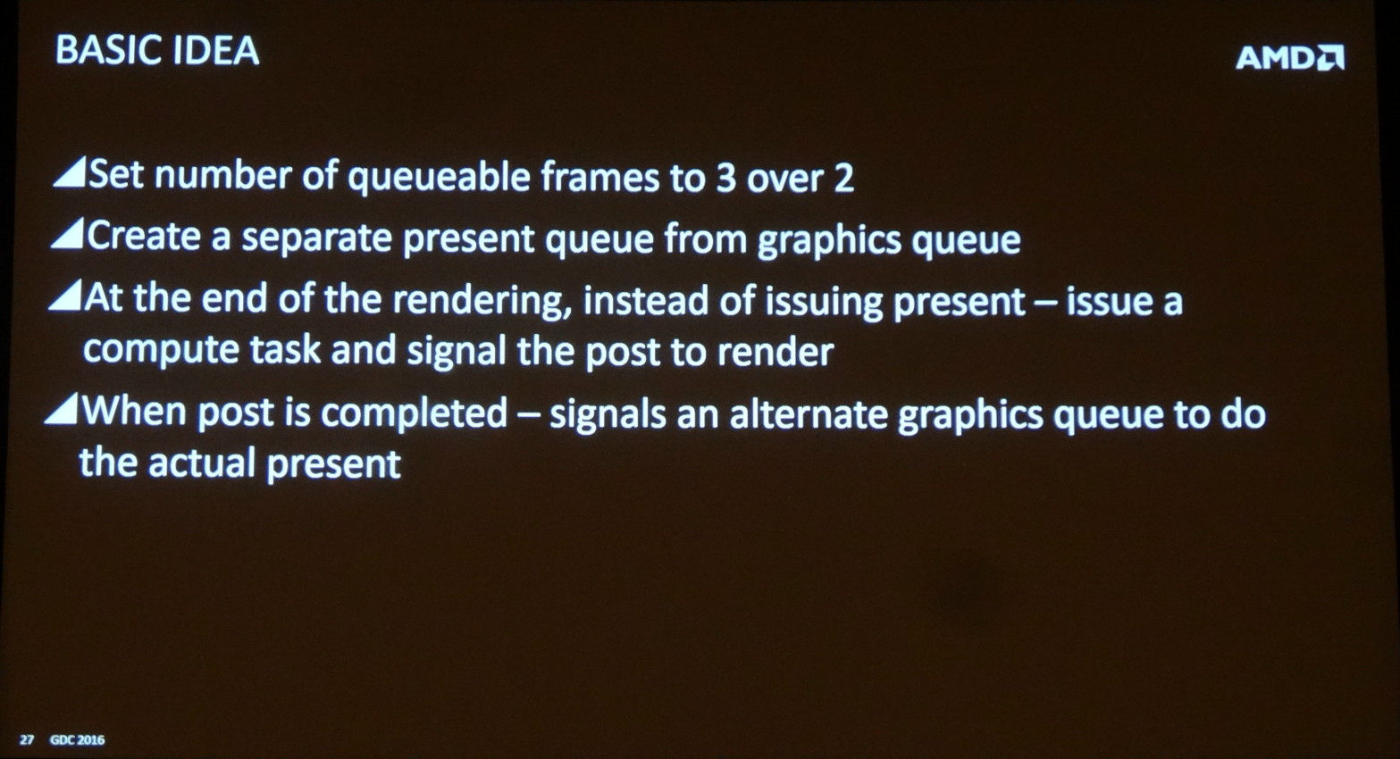 La solution est d'exploiter une seconde file graphique qui servira exclusivement à présenter les images en vue de leur affichage. Reste que si les pilotes n'ont aucun problème avec cette possibilité, les GPU actuels ne sont pas capables de gérer deux files graphiques en parallèle. Or si la file secondaire doit attendre que la principale soit traitée avant d'être exécutée, cela entraîne une image de latence supplémentaire.