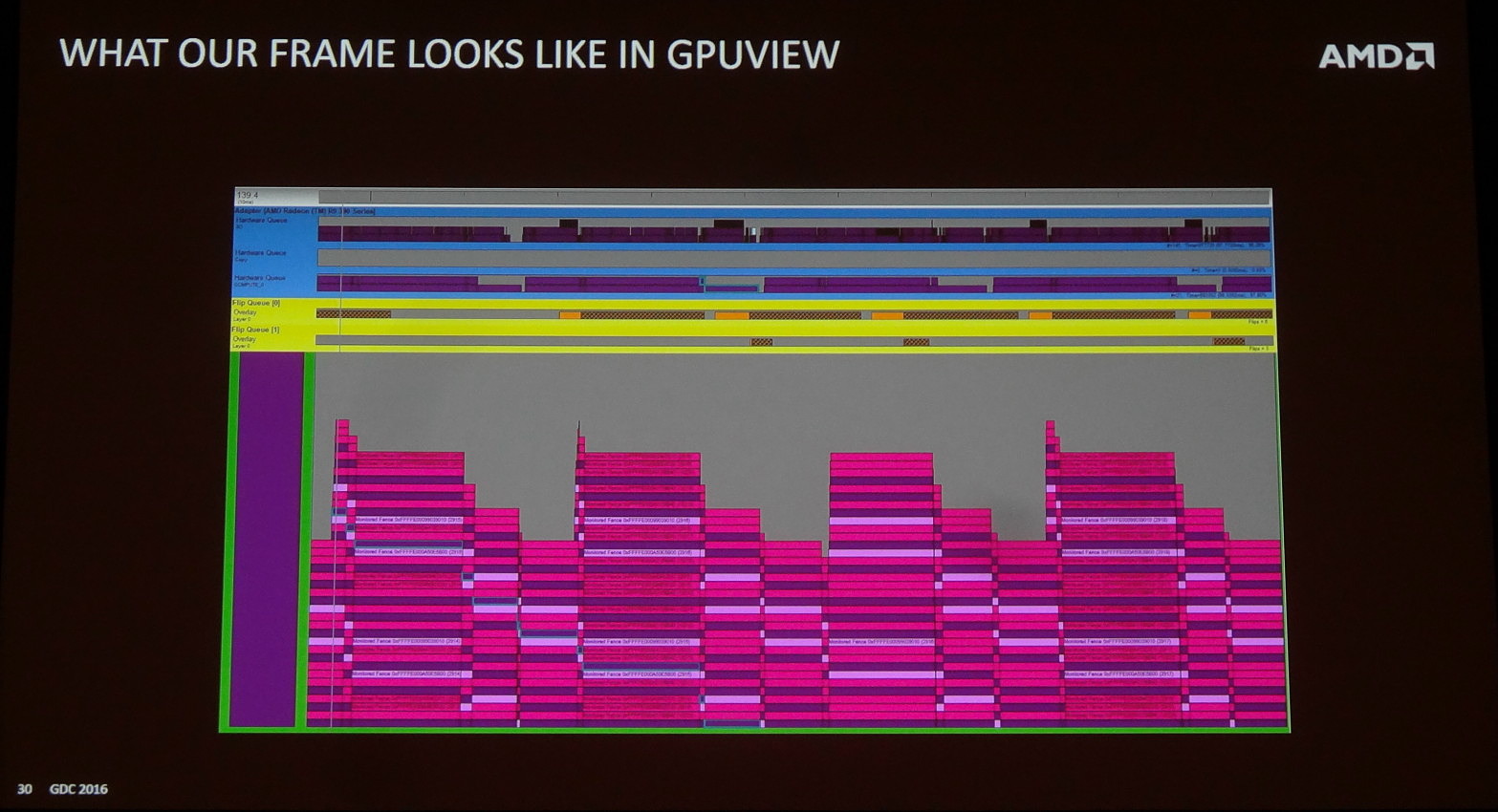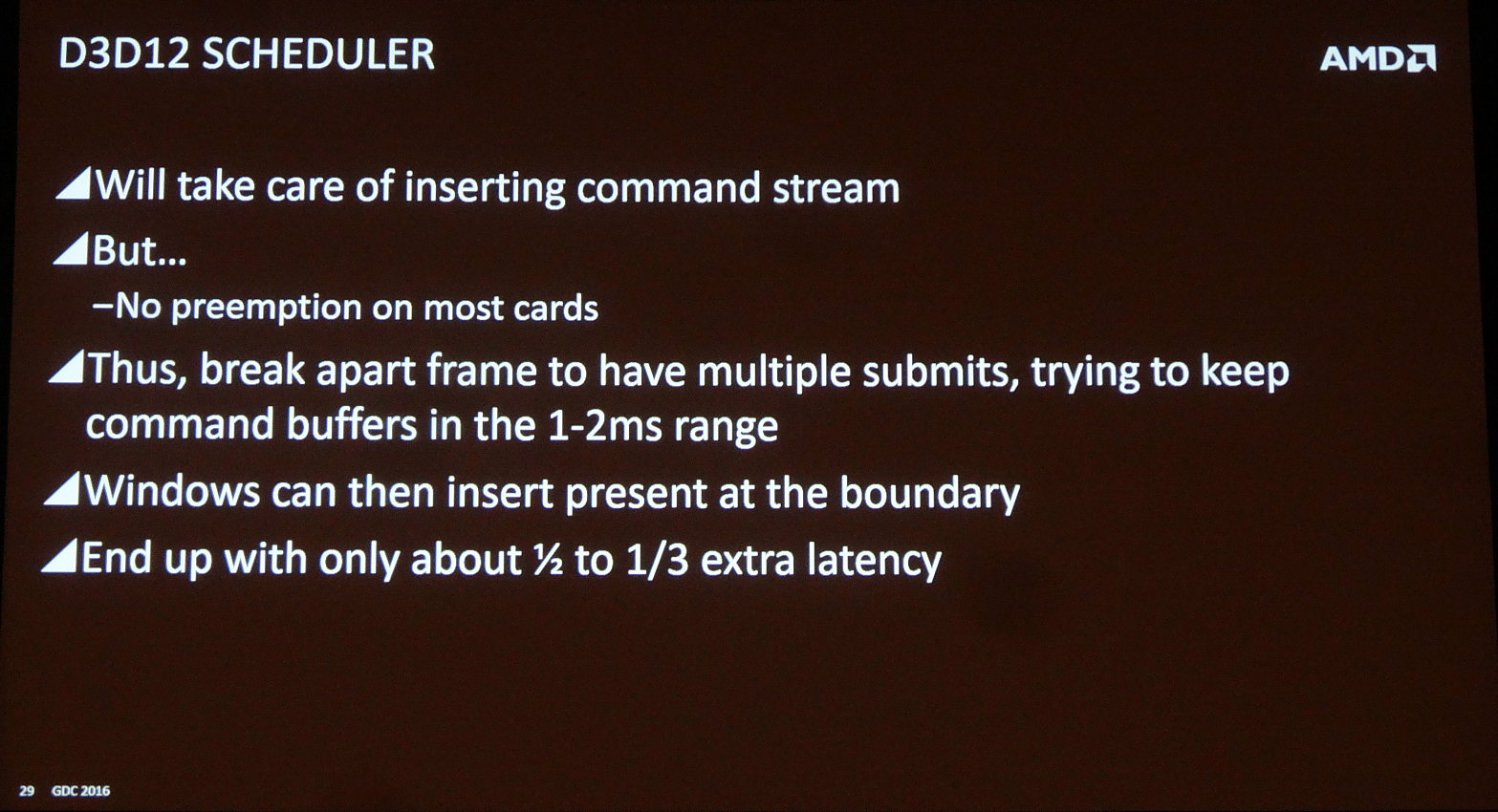 Oxide a cherché à éviter ce désagrément en faisant en sorte créer un maximum d'opportunités d'alternance entre les deux files graphiques via une décomposition du rendu principal de l'image en suffisamment de groupes de commandes. C'est peut-être légèrement moins efficace sur le plan des performances mais entre l'exécution de ces plus petits groupes de commandes, Windows pourra alterner entre les files graphiques et ainsi insérer la commande de présentation de l'image. Au lieu d'une image de latence supplémentaire, Oxide parvient ainsi à ne l'augmenter que de 1/3 à 1/2 image.