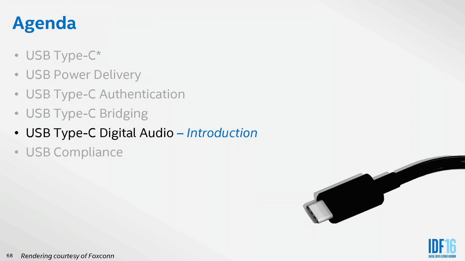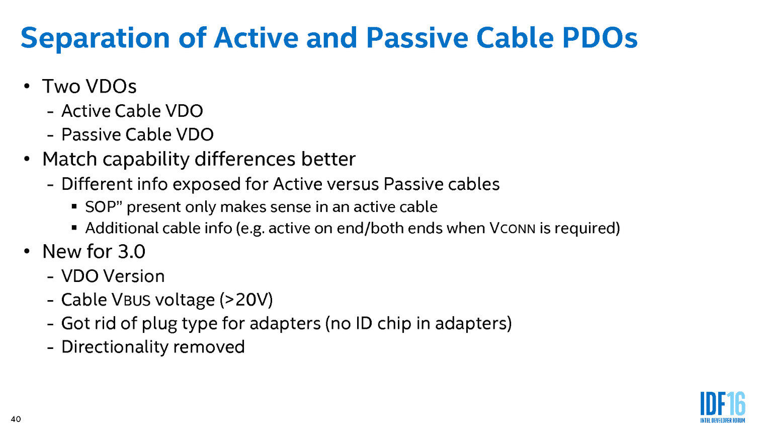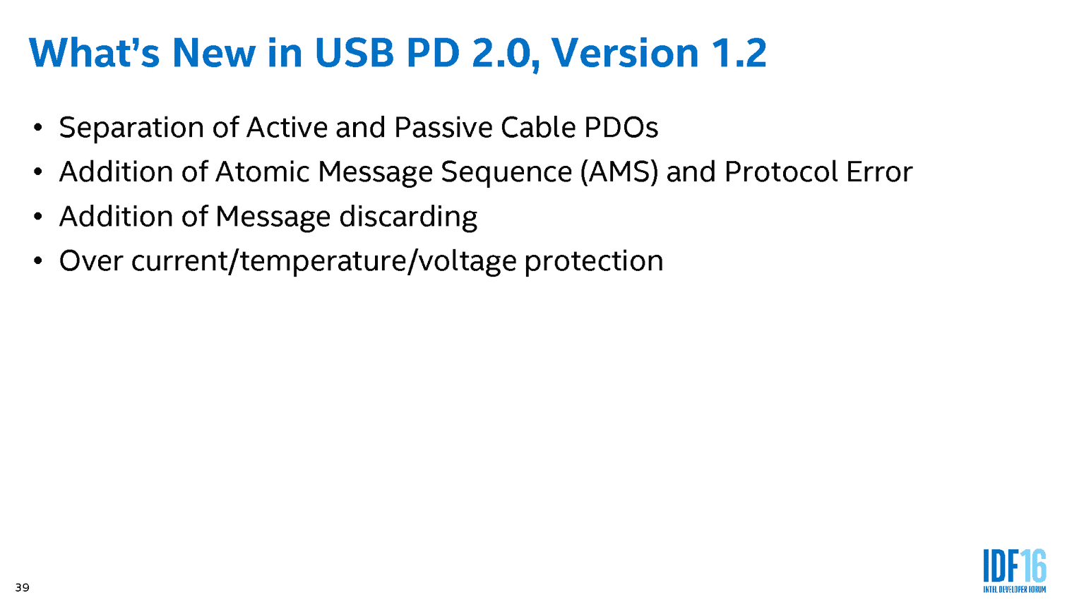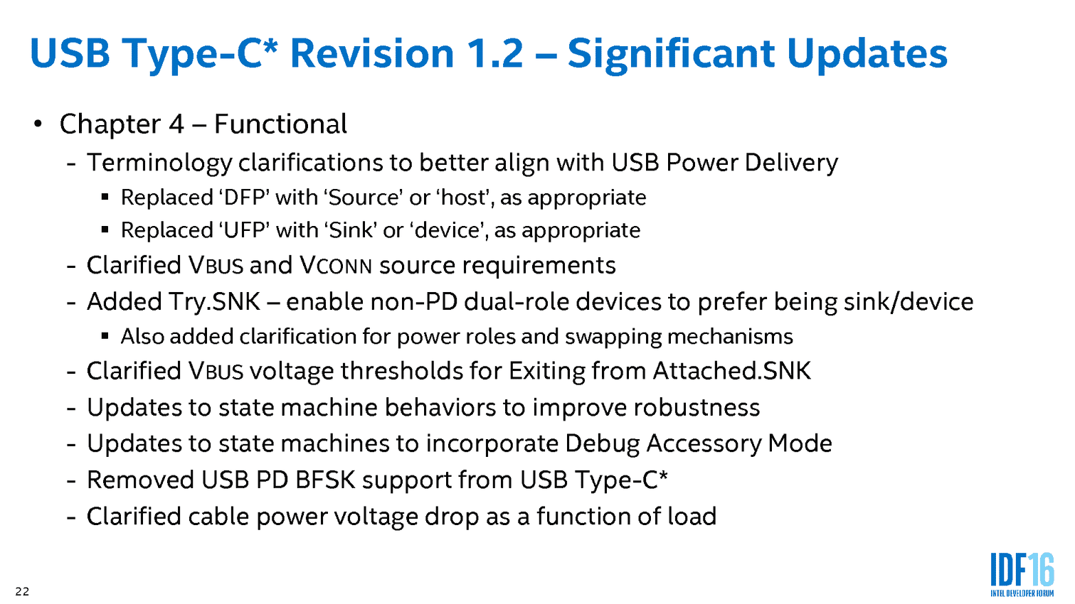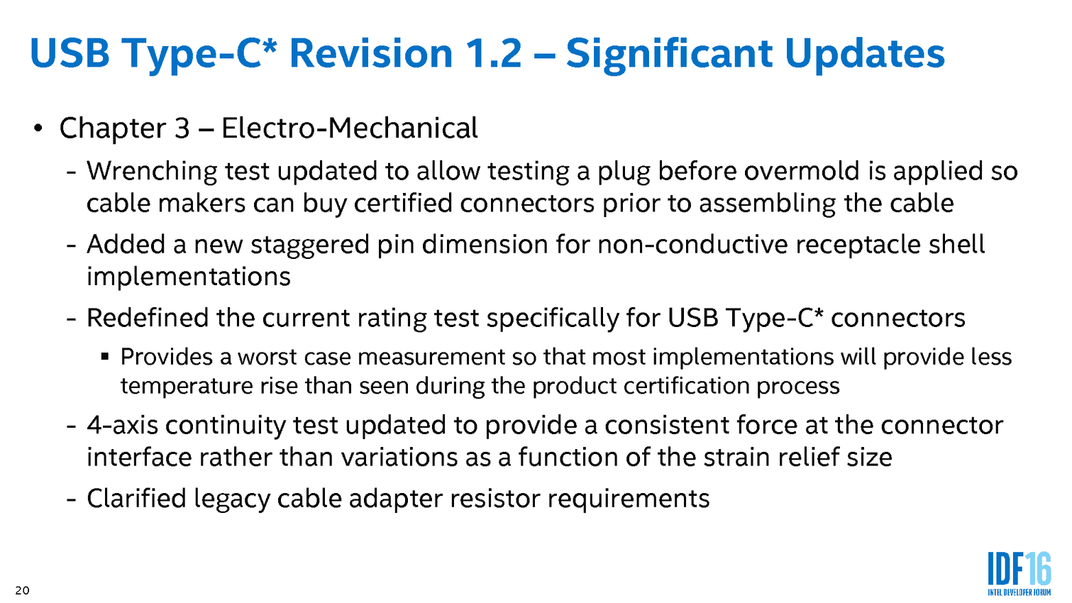 L'édition chinoise de l'IDF a donné lieu à une présentation des membres de l'USB-IF sur les nouveautés à venir autour du standard USB. La première concerne la version 1.2 de la spécification du connecteur USB Type-C. Un travail important de clarification a été fait pour rendre les documents plus clairs, certains passages ayant entraîné des interprétations hasardeuses qui avaient donné lieu à des câbles non certifiés, mais surtout fonctionnellement non valides et parfois même dangereux vendus dans le commerce ! Les processus de certifications ont également été clarifiés et un effort a été fait pour valider des prises standards qui pourront être vendues et réutilisées par les différents fabricants de câbles.