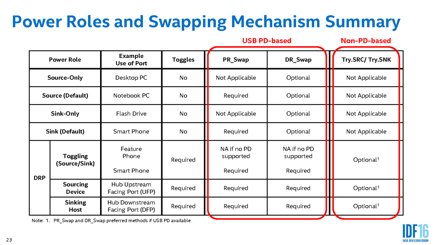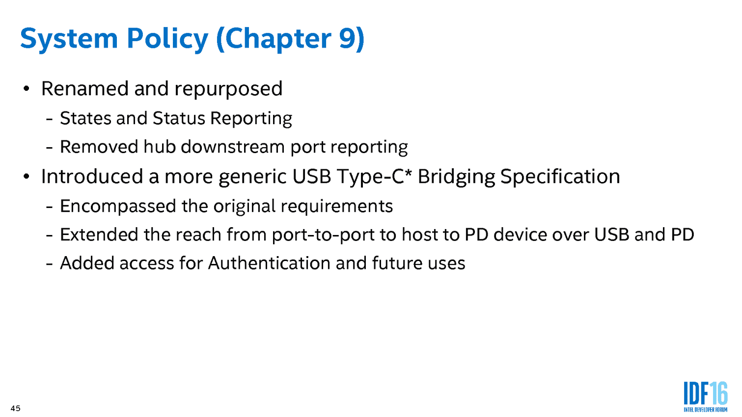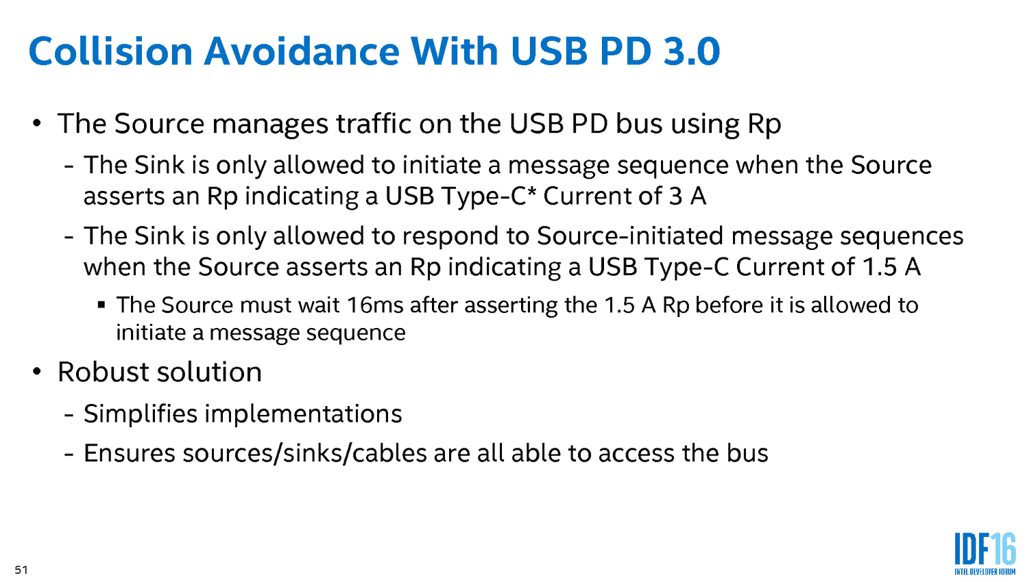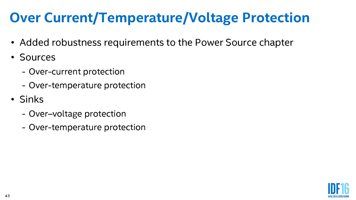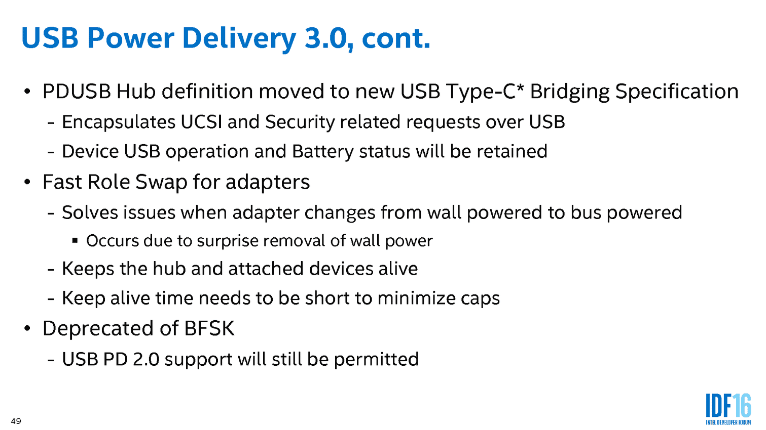 L'édition chinoise de l'IDF a donné lieu à une présentation des membres de l'USB-IF sur les nouveautés à venir autour du standard USB. La première concerne la version 1.2 de la spécification du connecteur USB Type-C. Un travail important de clarification a été fait pour rendre les documents plus clairs, certains passages ayant entraîné des interprétations hasardeuses qui avaient donné lieu à des câbles non certifiés, mais surtout fonctionnellement non valides et parfois même dangereux vendus dans le commerce ! Les processus de certifications ont également été clarifiés et un effort a été fait pour valider des prises standards qui pourront être vendues et réutilisées par les différents fabricants de câbles.