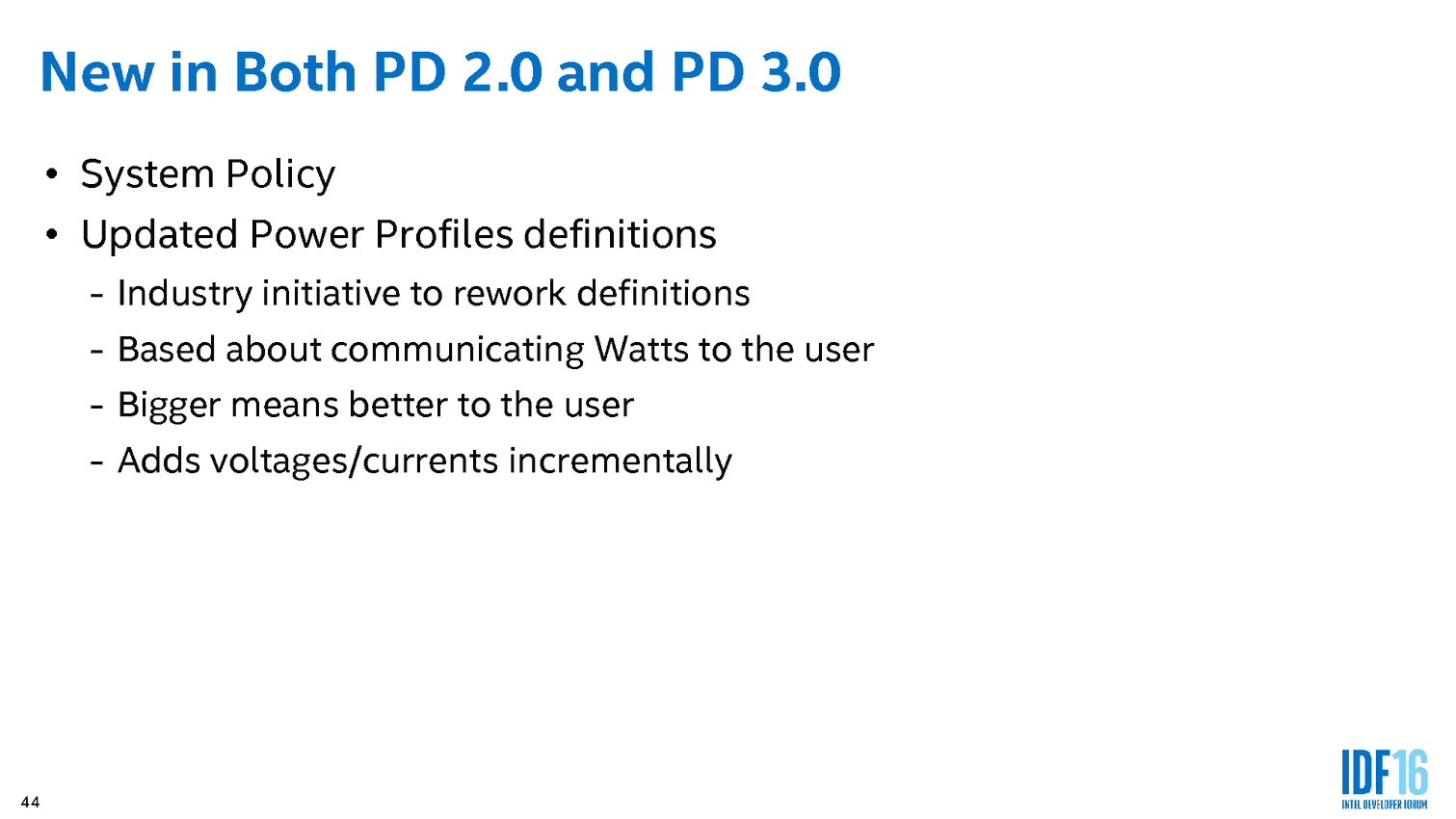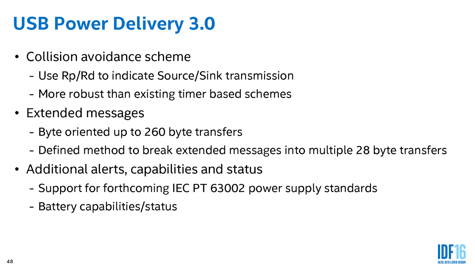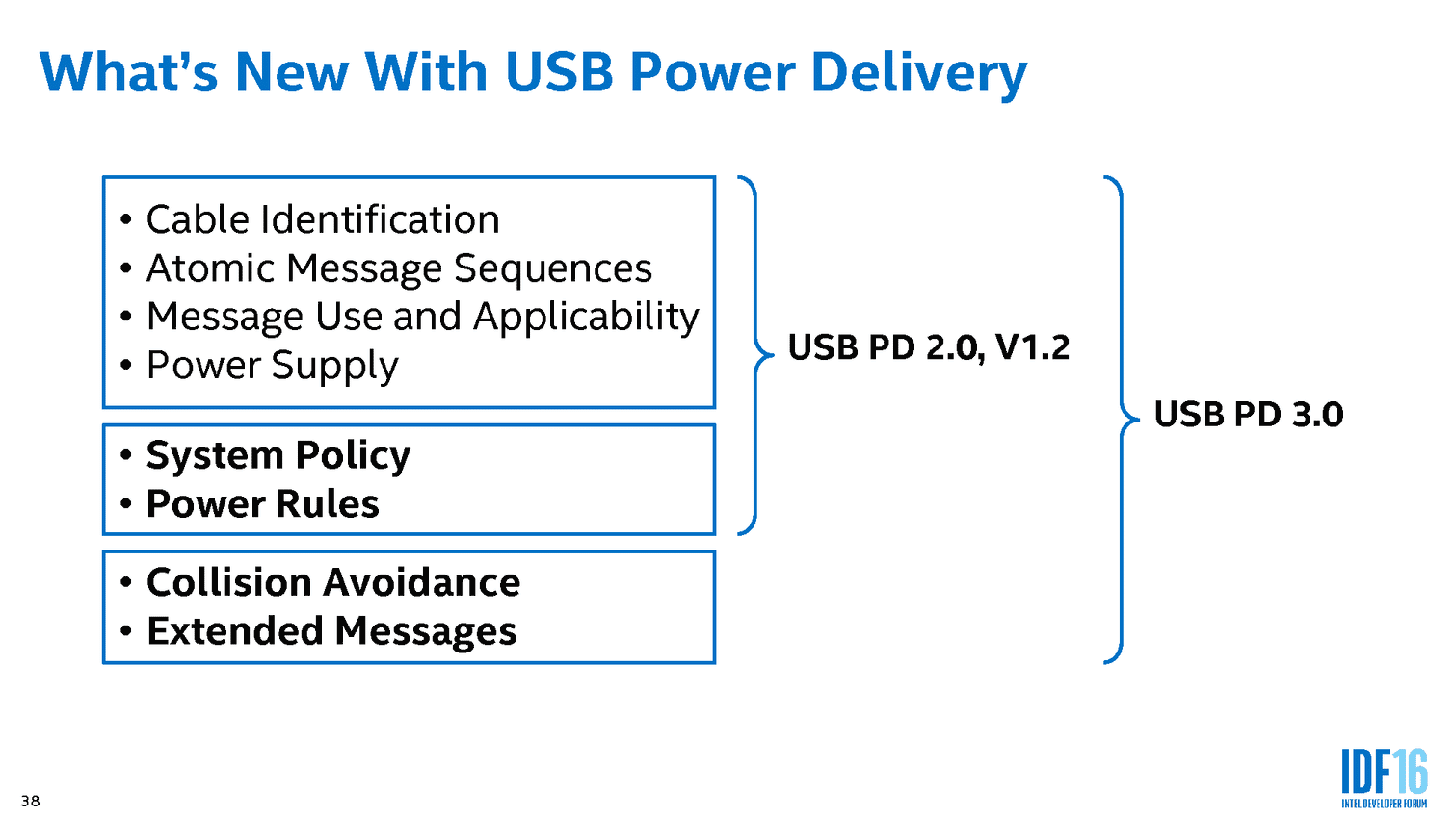 La spécification USB-PD 3.0 simplifie le tout en remplaçant les profils par des règles fixes qui indiquent, pour chaque niveau de puissance, comment celle-ci sera délivrée. Par-dessus cela, les périphériques exprimeront simplement leurs besoins en watts, et indiqueront le niveau actuel de charge de leur batterie. Un système plus simple, et surtout plus compréhensible pour les utilisateurs. Les systèmes d'exploitations pourront ainsi communiquer plus clairement les choix lorsque nécessaire. On ne peut que se féliciter de ce changement !