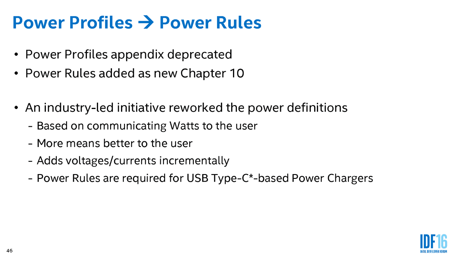 Un autre changement concerne les profils de puissance proposés. La norme originale proposait un système de profils très compliqué qui définissait les différentes puissances de chargement possibles. Tout était découpé autour de cinq profils qui définissaient plusieurs niveaux de puissance (jusqu'à 100 watts) via l'utilisation de plusieurs tensions. C'est en fonction des profils déclarés que les contrôleurs USB pouvaient effectuer automatiquement les choix que nous mentionnions plus haut.