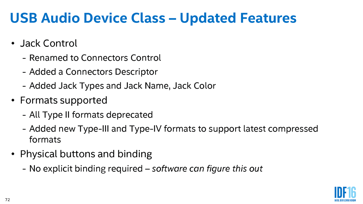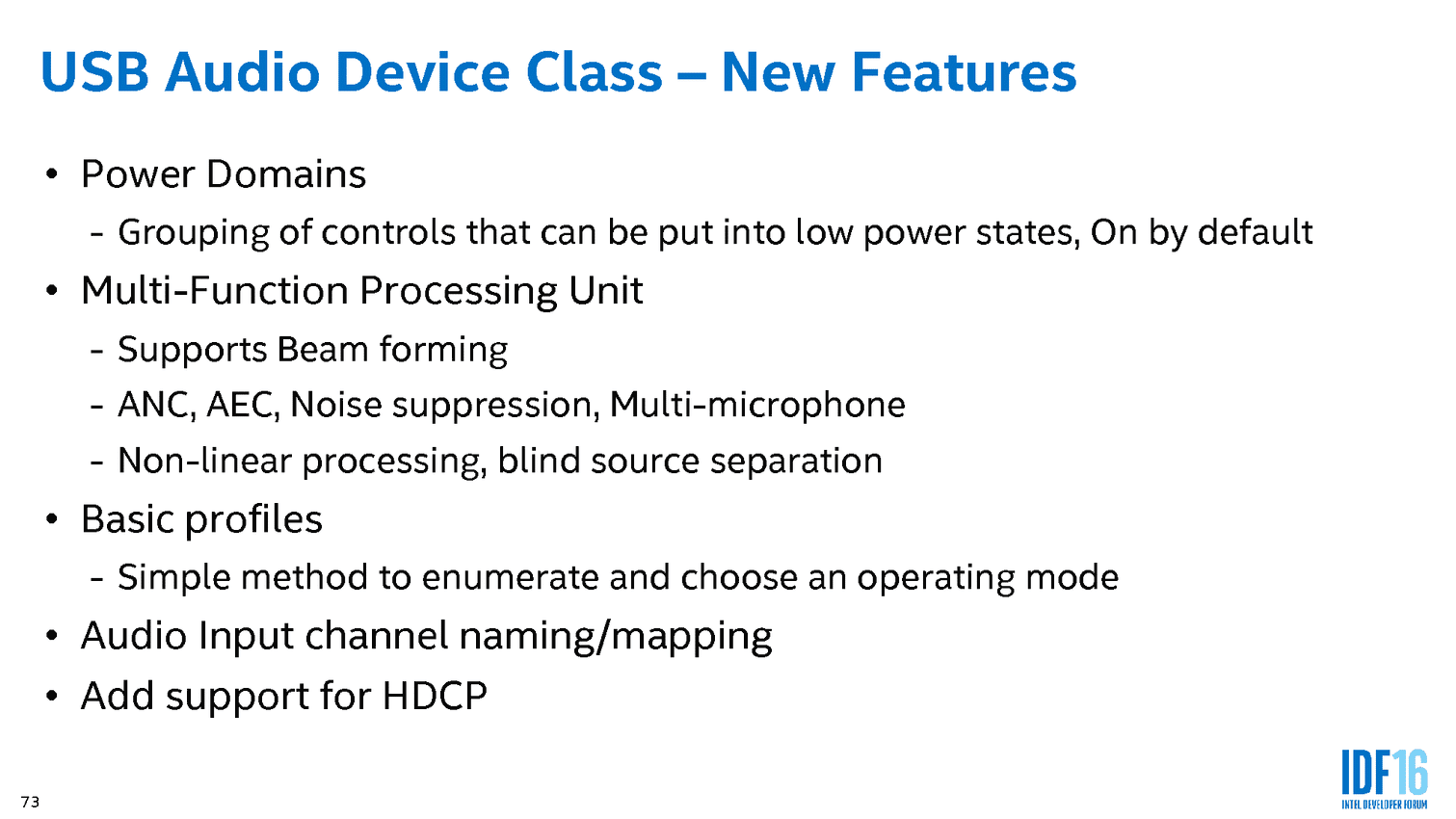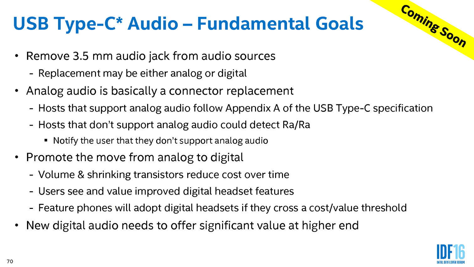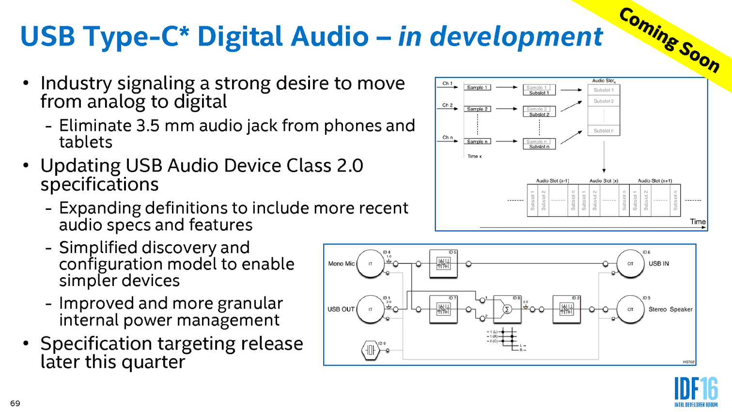 Le dernier point évoqué a été celui de l'extension Digital Audio, qui avait été évoquée l'été dernier. L'USB-If va faire évoluer son standard USB Audio existant pour permettre de nouvelles utilisations avec une idée : supprimer la prise jack des smartphones et tablettes.