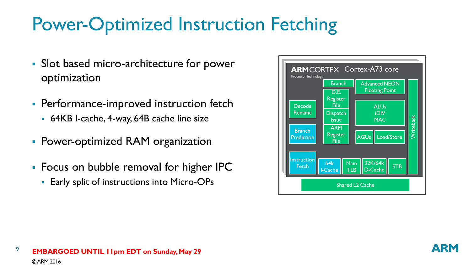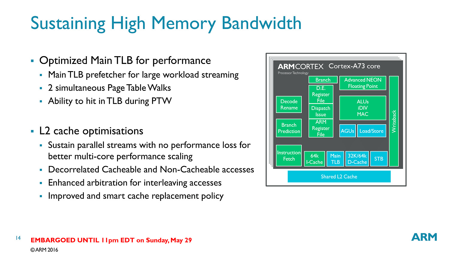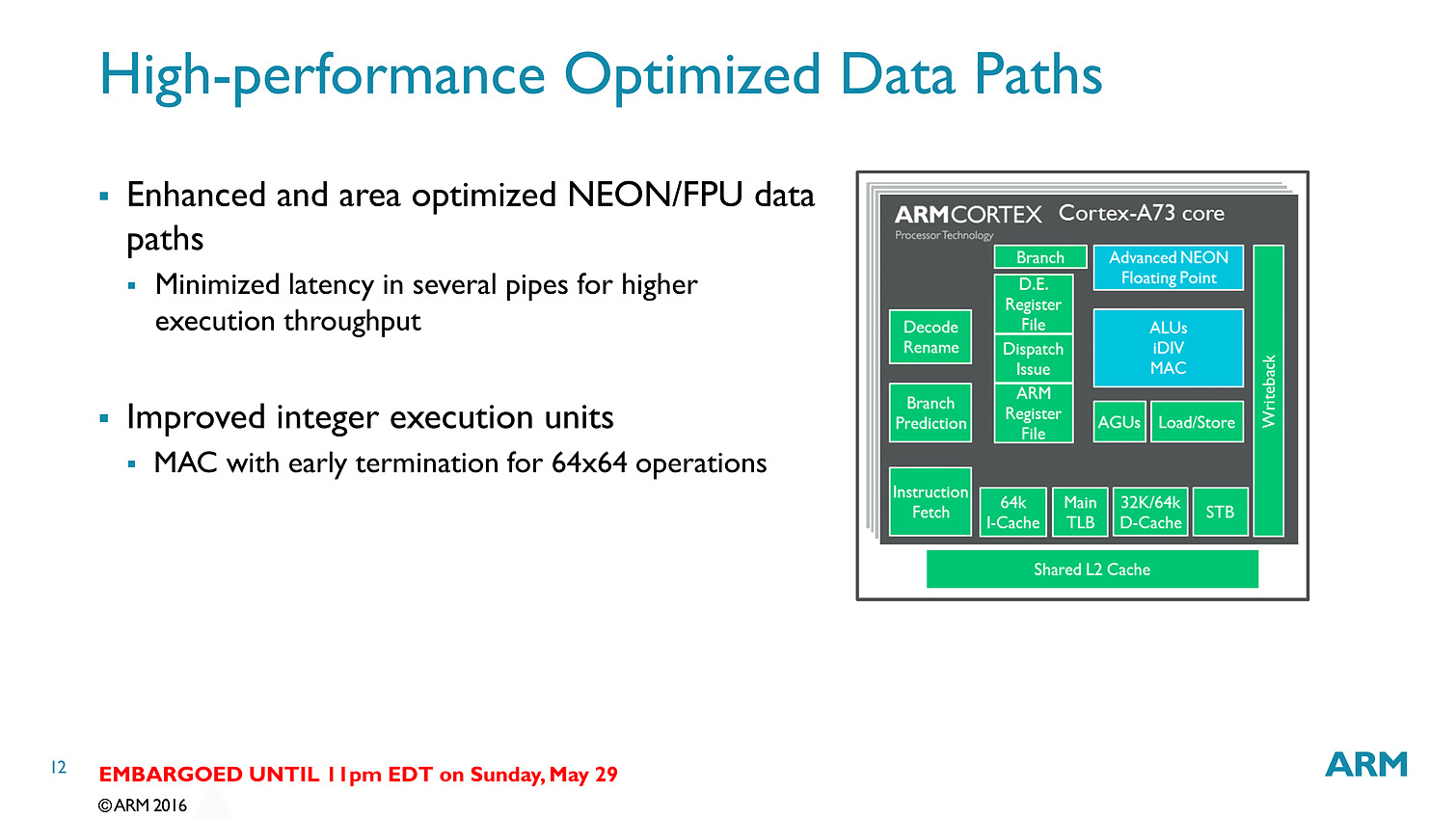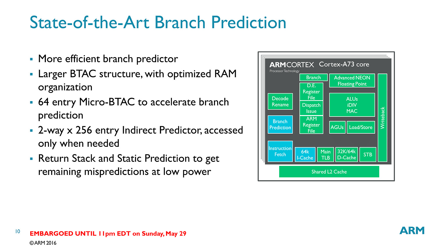 Sur le papier l'A73 est un meilleur compromis côté architecture que ses prédécesseurs, ce qui devrait ravir les partenaires d'ARM, assez peu heureux des A57. Si ARM vise le 10nm, en pratique il propose à ses partenaires des designs A73 en 28, 16 et 10nm. D'ici la fin de l'année, des SoC 16nm devraient faire leur apparition et c'est probablement là qu'on les trouvera en masse (le 10nm sera probablement, pour rappel, réservé au moins dans un premier temps aux gros acteurs du marché comme Qualcomm et Apple à l'image de ce que l'on avait vu avec le 20nm).