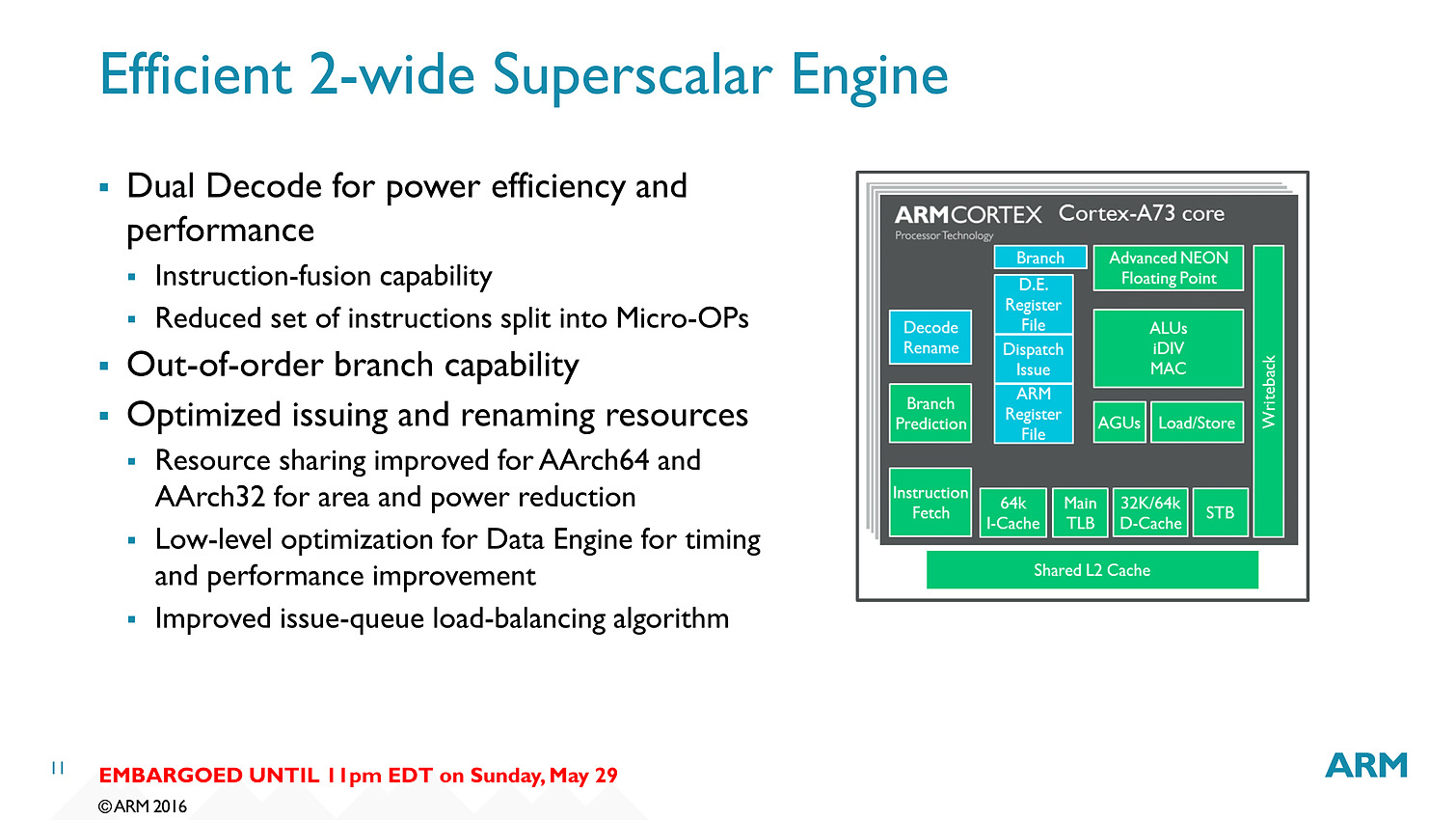 Bien que décodant une instruction par cycle en moins, l'A73 permet sur le papier au final de dispatcher 6 micro-instructions par cycle, contre 5 pour l'A72. Si l'on ajoute toutes les autres optimisations (le sous système mémoire, point faible historique des Cortex semble avoir évolué), l'A73 est annoncé comme 10% plus performant que l'A72, à fréquence/process égal.