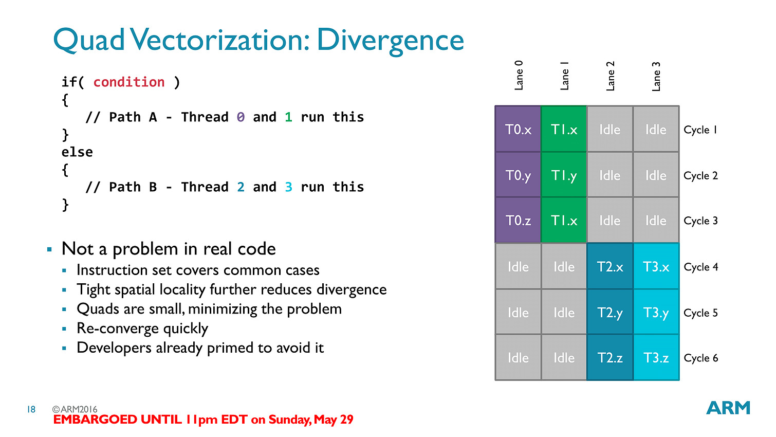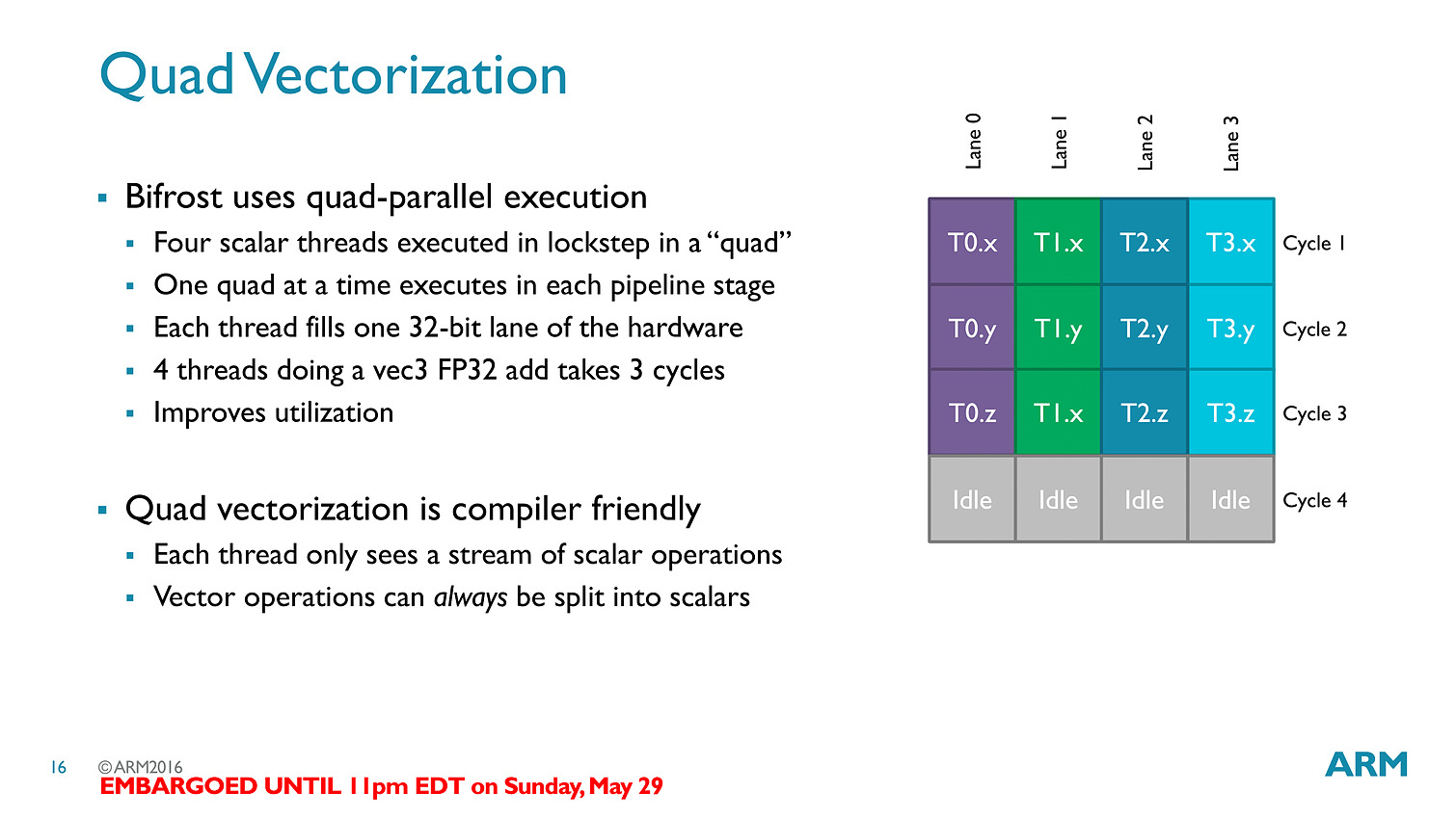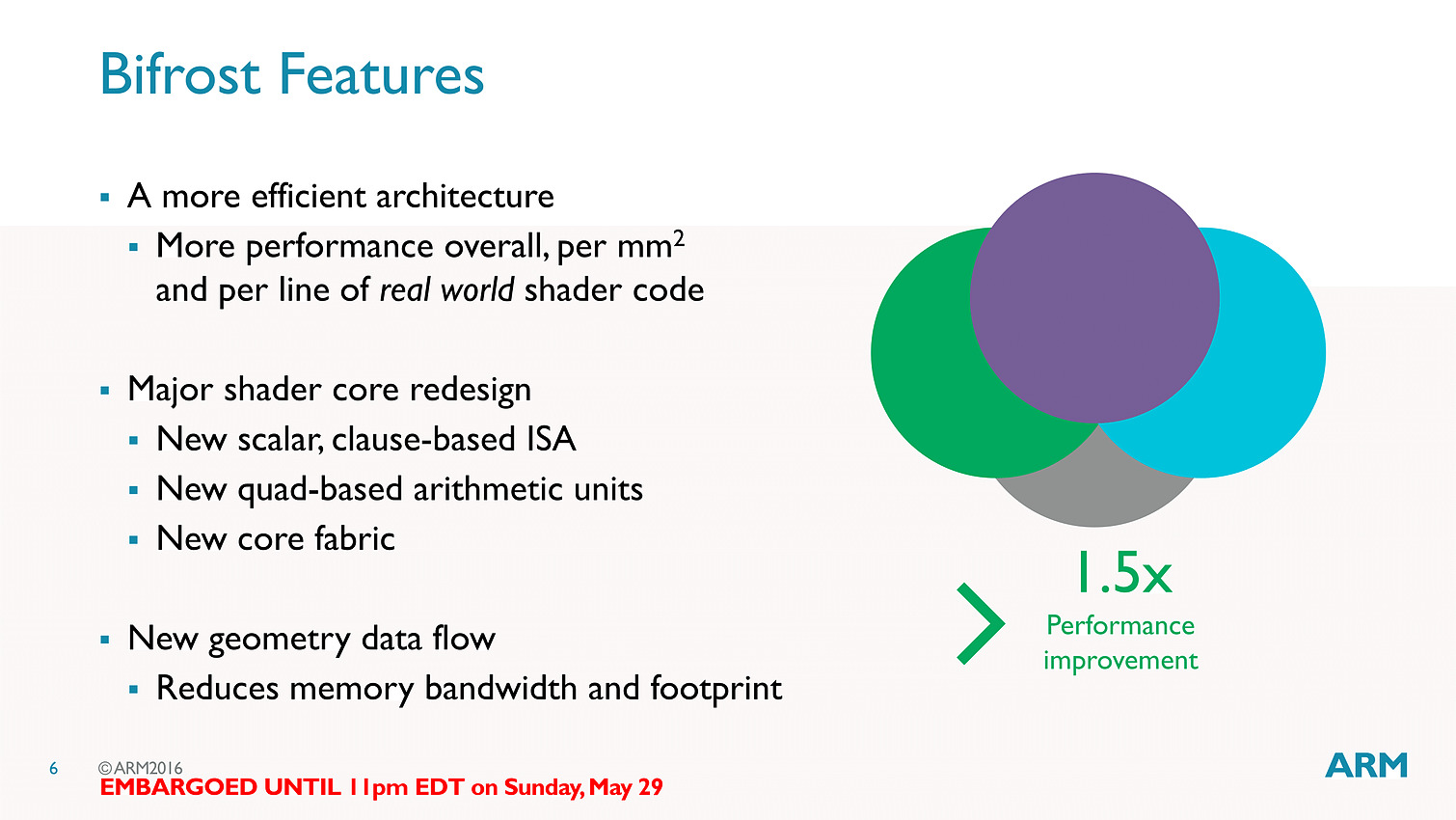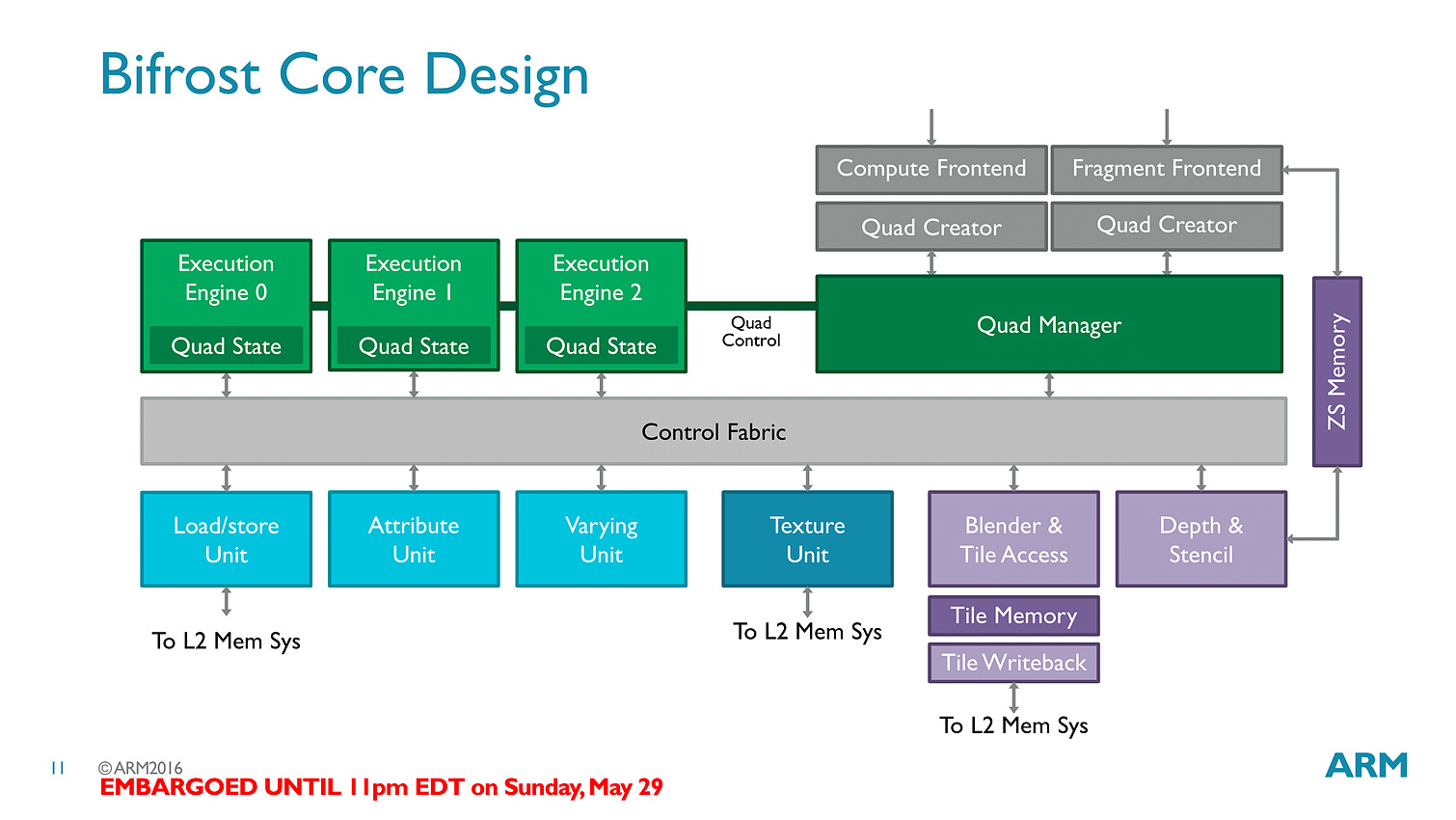 Les threads - clauses dans le langage ARM - sont particulièrement optimisées avec des caches a tous les niveaux (sous la forme de register file) pour s'assurer que les accès mémoires soient optimisés au mieux. Cumulé à tout les autres changements architecturaux (le tiler a également été modifié pour réduire sa consommation mémoire), ARM annonce 50% de gains de performances avec Bifrost.