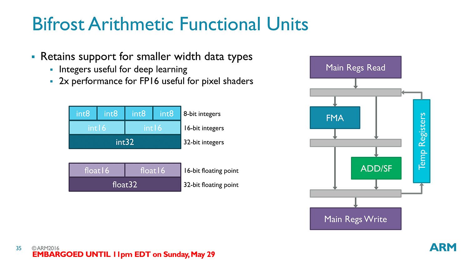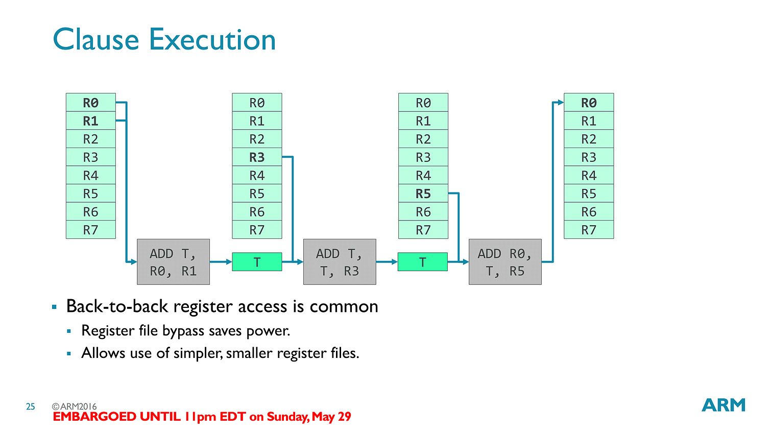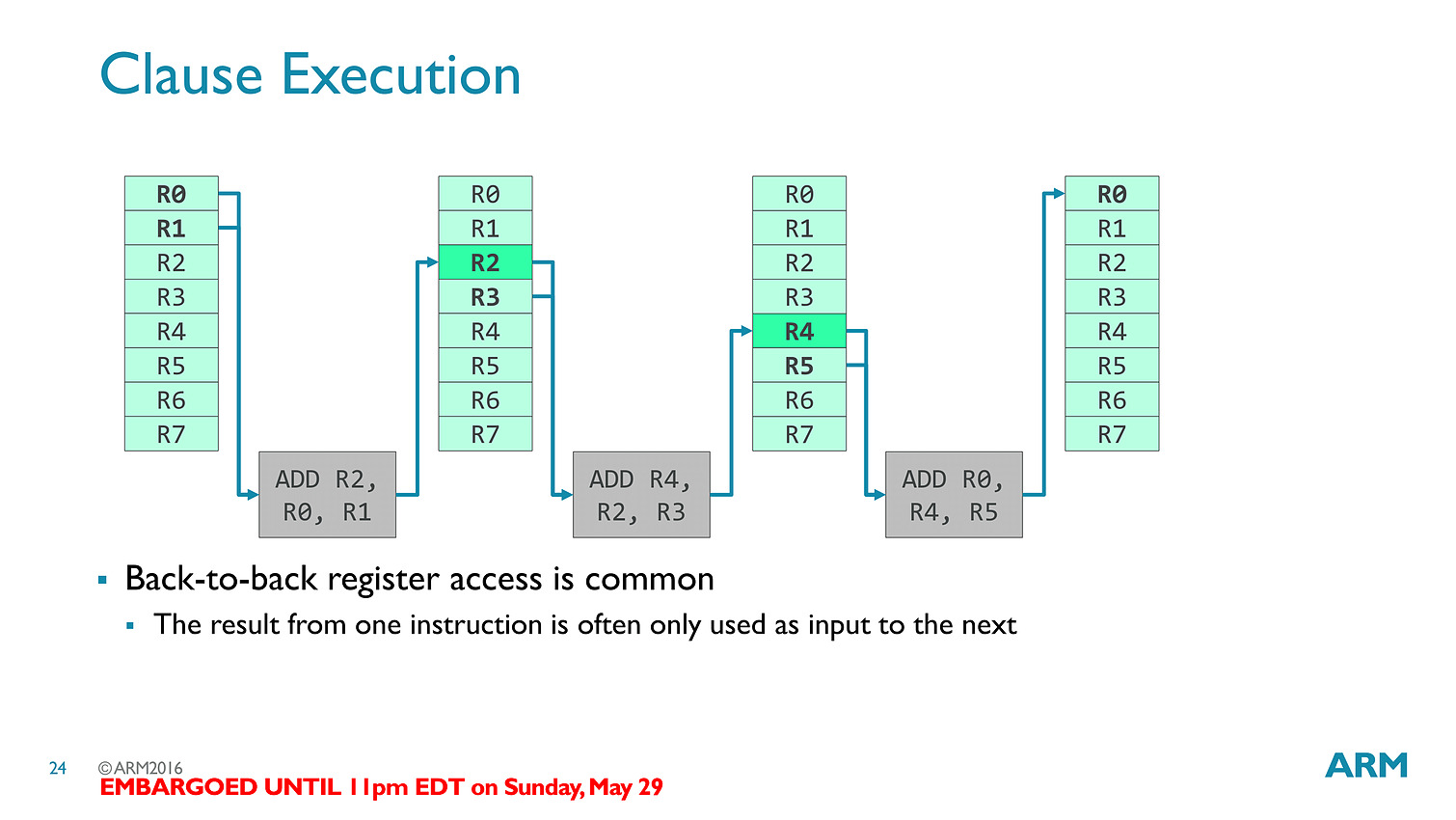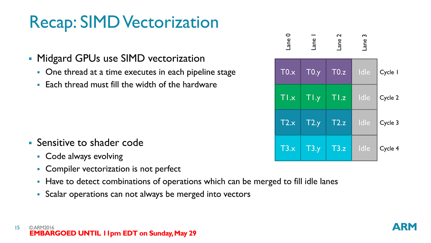 Les threads - clauses dans le langage ARM - sont particulièrement optimisées avec des caches a tous les niveaux (sous la forme de register file) pour s'assurer que les accès mémoires soient optimisés au mieux. Cumulé à tout les autres changements architecturaux (le tiler a également été modifié pour réduire sa consommation mémoire), ARM annonce 50% de gains de performances avec Bifrost.
