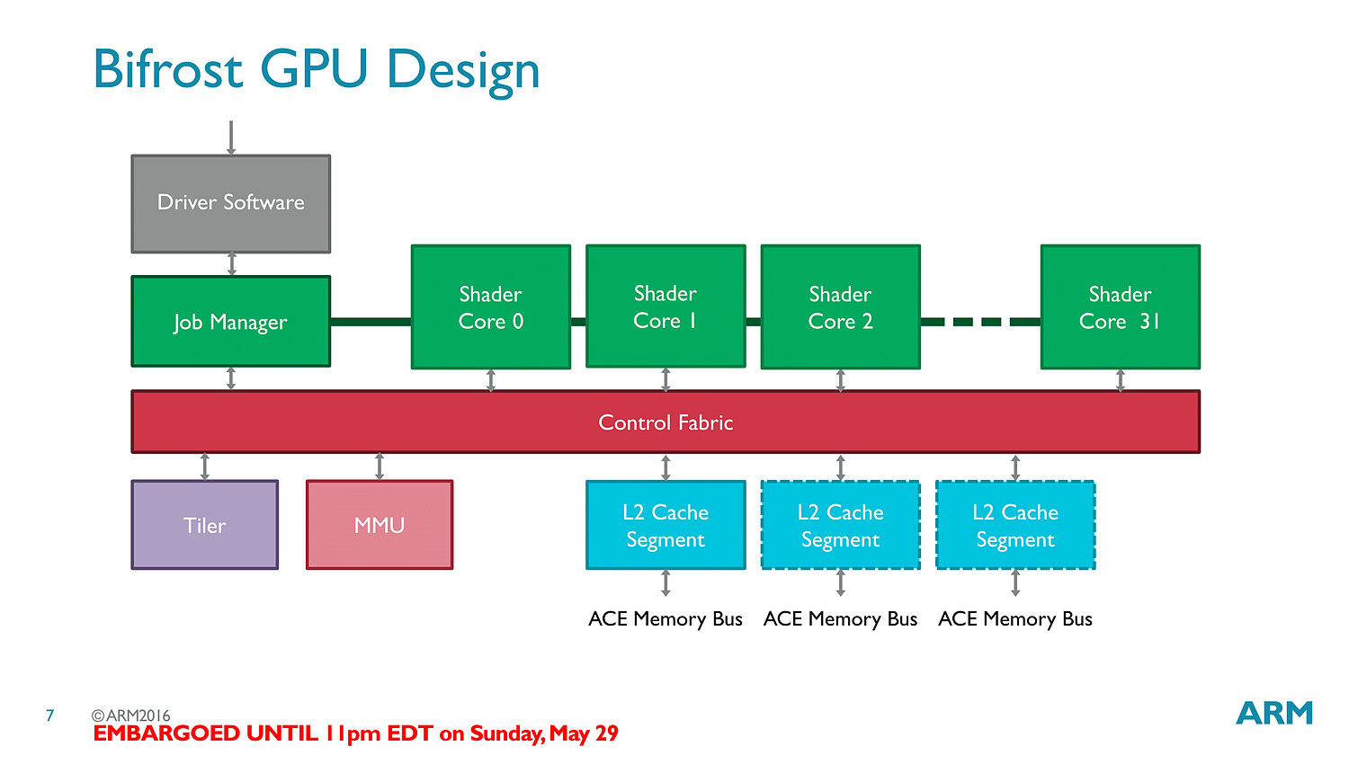 En pratique le Mali-T71 est le premier GPU ARM utilisant Bifrost, il regroupera jusqu'à 32 shader cores (qui comptent chacun 12 unités scalaires) et reste compatible comme ses prédécesseurs avec OpenGL ES 3.x, OpenCL 2.0 et Vulkan. On rajoutera un dernier mot sur l'interconnexion puisque l'on a droit à un accès au cache fully coherent, ce qui signifie que CPU et GPU peuvent partager la même mémoire cache en opérant en parallèle sans blocage (à la manière de Kaveri chez AMD qui utilisait cependant deux bus distincts), ce qui pourra être utile pour des tâches compute ou l'on fait travailler de concert CPU et GPU (ce qui n'est pas forcément la majorité des usages sur les plateformes mobiles).