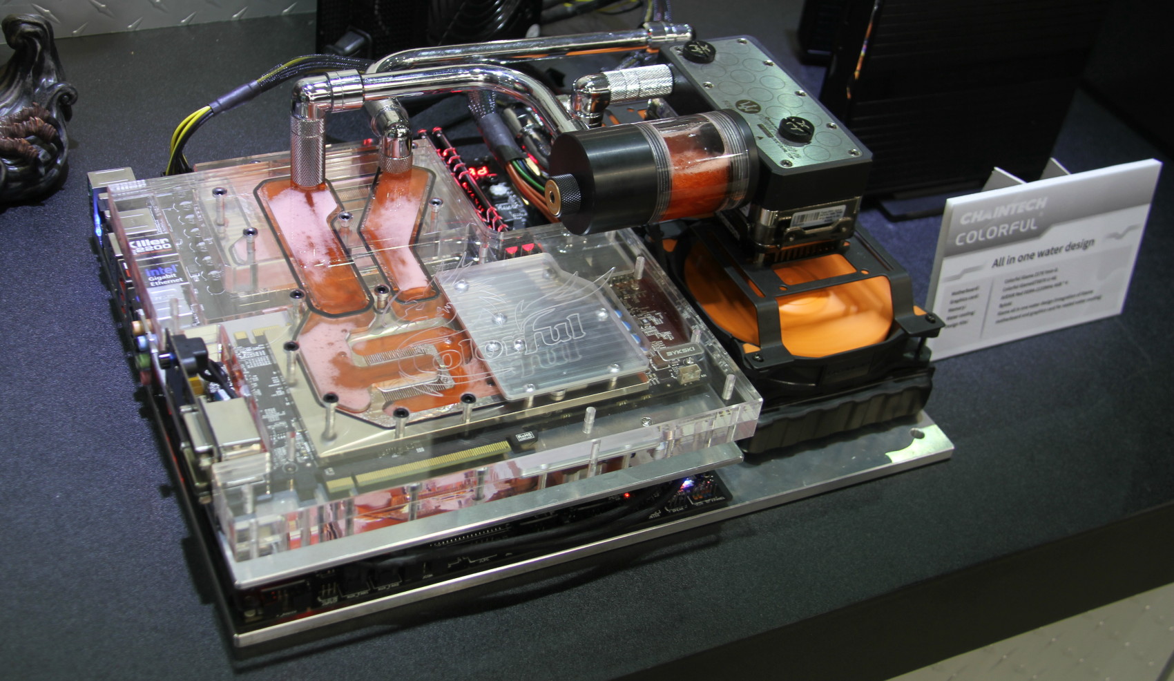 Le Chinois Colorful, avec qui s'est associé le taiwanais Chaintech il y a quelques années pour relancer sa division cartes-mères, exposait au Computex une autre solution de refroidissement pour le moins originale. Développée en collaboration avec un spécialiste Chinois du watercooling, bykski, elle consiste à intégrer le refroidissement du CPU, de la carte graphique et de la carte-mère dans un système all-in-one.
