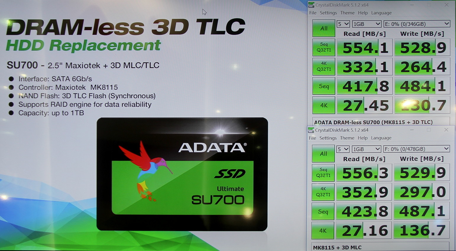 L'un des premiers partenaires de Maxiotek est le Taïwanais ADATA qui propose avec sa série SU700 des SSD 2.5" qui associent au MK8115 de la 3D NAND Micron MLC ou TLC. Les performances affichées sont similaires, cache SLC oblige, mais elles seront évidemment meilleures en pratique sur le modèle MLC qui profitera également d'une meilleure endurance.