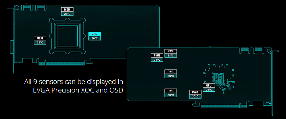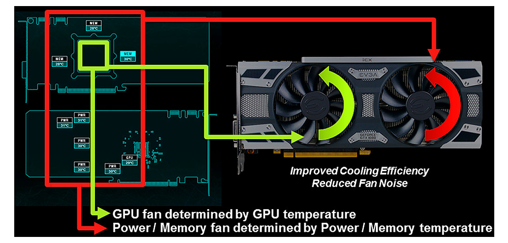EVGA lance un nouveau système de refroidissement pour ses cartes graphiques dénommé iCX. Cette évolution de l'ACX 3.0 se base sur l'intégration de pas moins de 9 capteurs de température sur le PCB : un pour le GPU, 3 pour la GDDR5 et 5 pour l'étage d'alimentation.