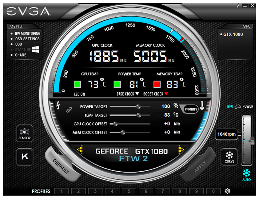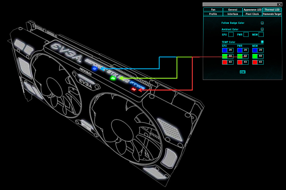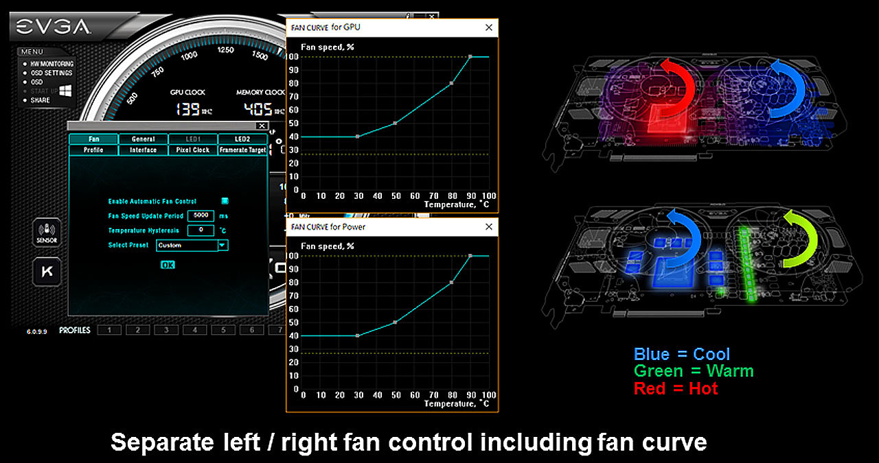 Les deux ventilateurs ne fonctionnent plus à la même vitesse, le premier est asservi à la température GPU alors que la vitesse du second est déterminée par les températures de la mémoire et de l'étage d'alimentation, un comportement asynchrone qui peut être modifié par EVGA Precision XOC. Vu le positionnement de la mémoire, il aurait été toutefois plus logique que le ventilateur de gauche réagisse aussi en fonction de la température mémoire.