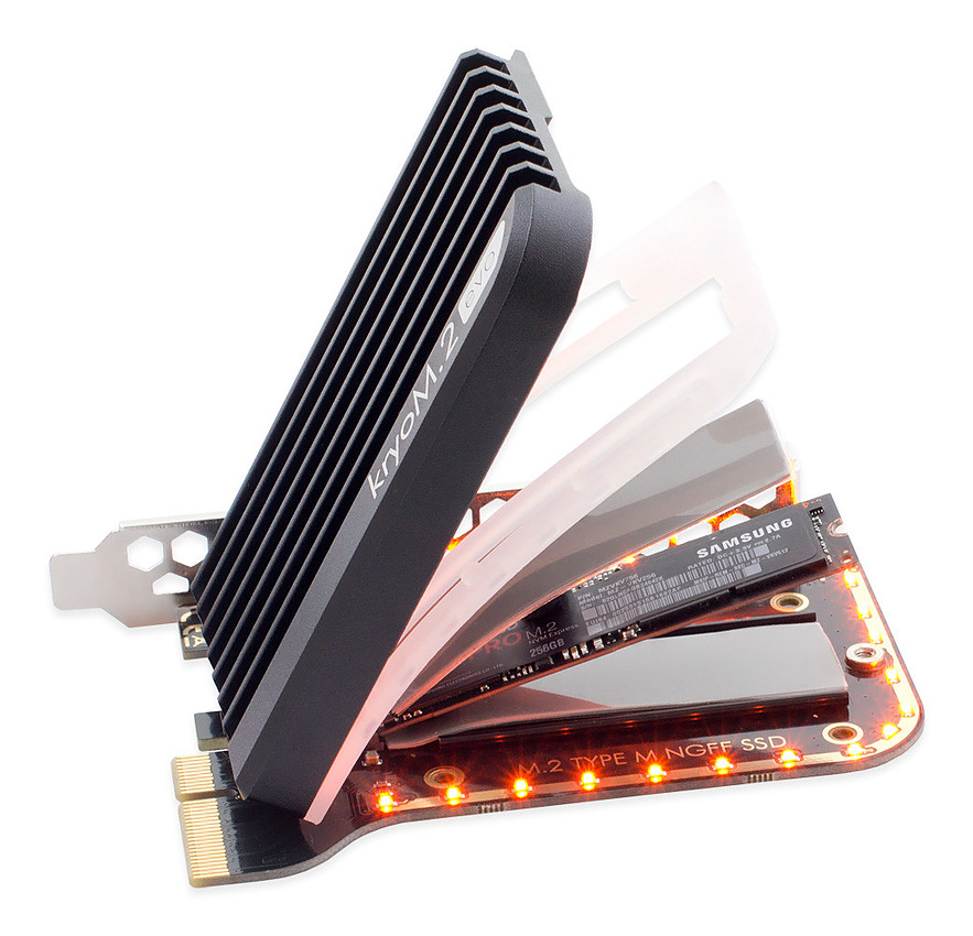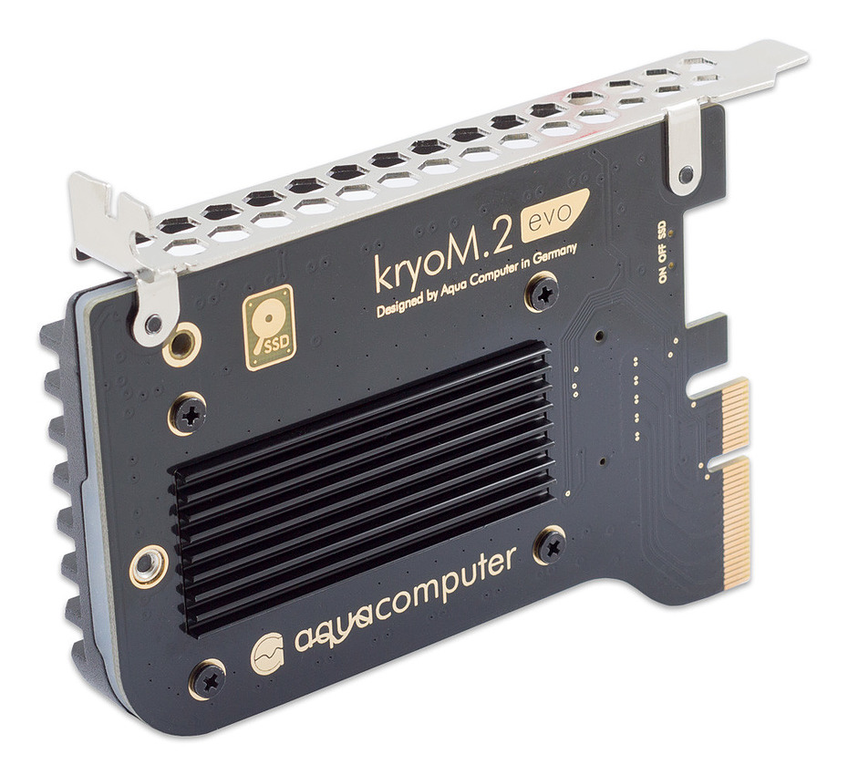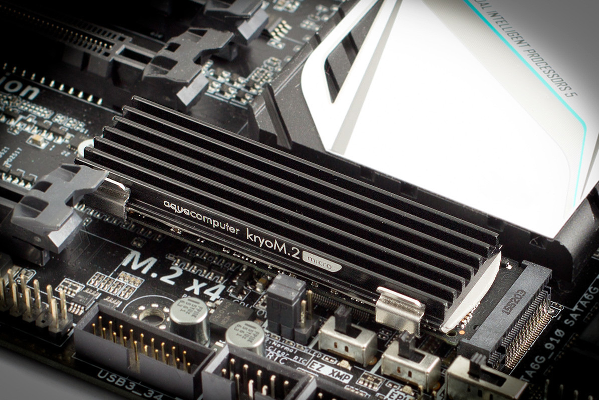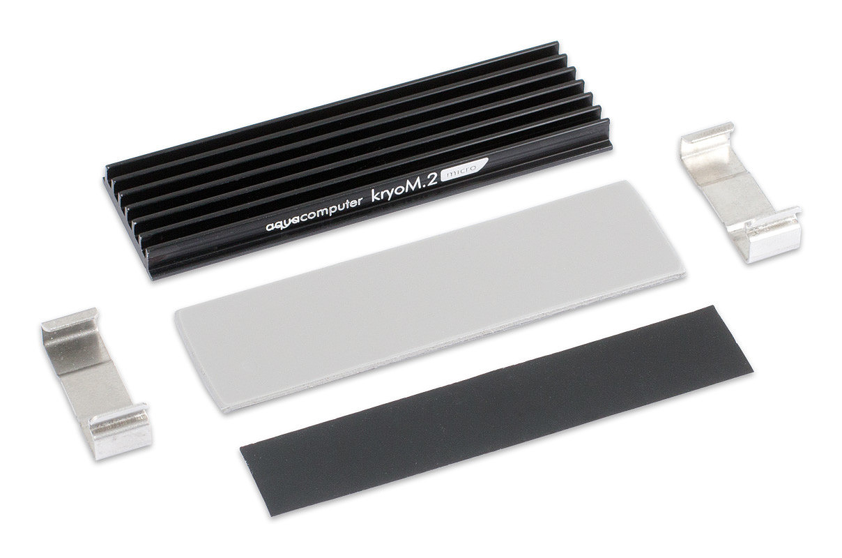 Aqua Computers lance deux nouveaux produits à cet usage. Le kryoM.2 micro, proposé à 10 €, est constitué d'un grand pad thermique pour un M.2 pleine longueur ainsi que d'un radiateur de même taille. Un isolant à positionner au dos du M.2 est fournie, afin d'éviter tout contact entre les clips de fixation et un composant de la carte mère.