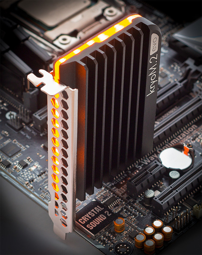 Le kryoM.2 EVO est plus évolué puisqu'il s'agit d'une carte fille PCIe x4, à positionner de préférence dans un port Gen3 et donc. Le M.2 sera cette fois refroidit par deux radiateurs, un petit à l'arrière et un plus imposant à l'avant. Une LED d'activité est présente à l'arrière ainsi qu'un bandeau de LED qui fait le tour du PCB, il peut être allumé, éteint, ou fonctionner de concert avec l'activité du SSD.