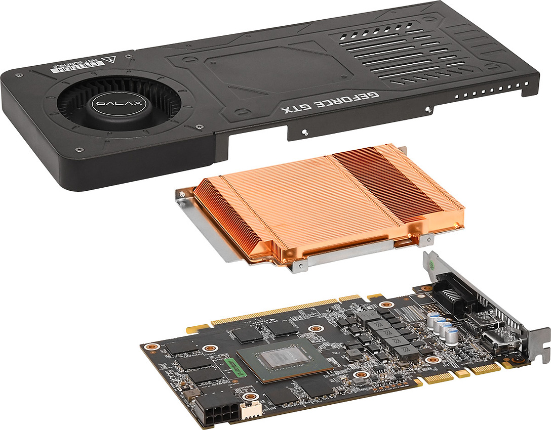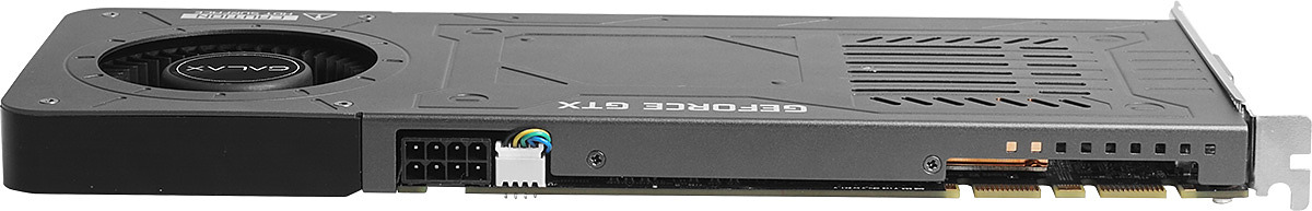Pour ce faire Galax a repris le PCB de sa GTX 1070 OC Mini sur lequel et y a apposé un radiateur composé d'une chambre à vapeur et d'ailettes en cuivre qui est refroidit par un ventilateur de type Turbine. Les ouvertures côté équerres étant réduites alors qu'on en note d'autres sur la coque, l'air chaud n'est que partiellement évacué de la machine.