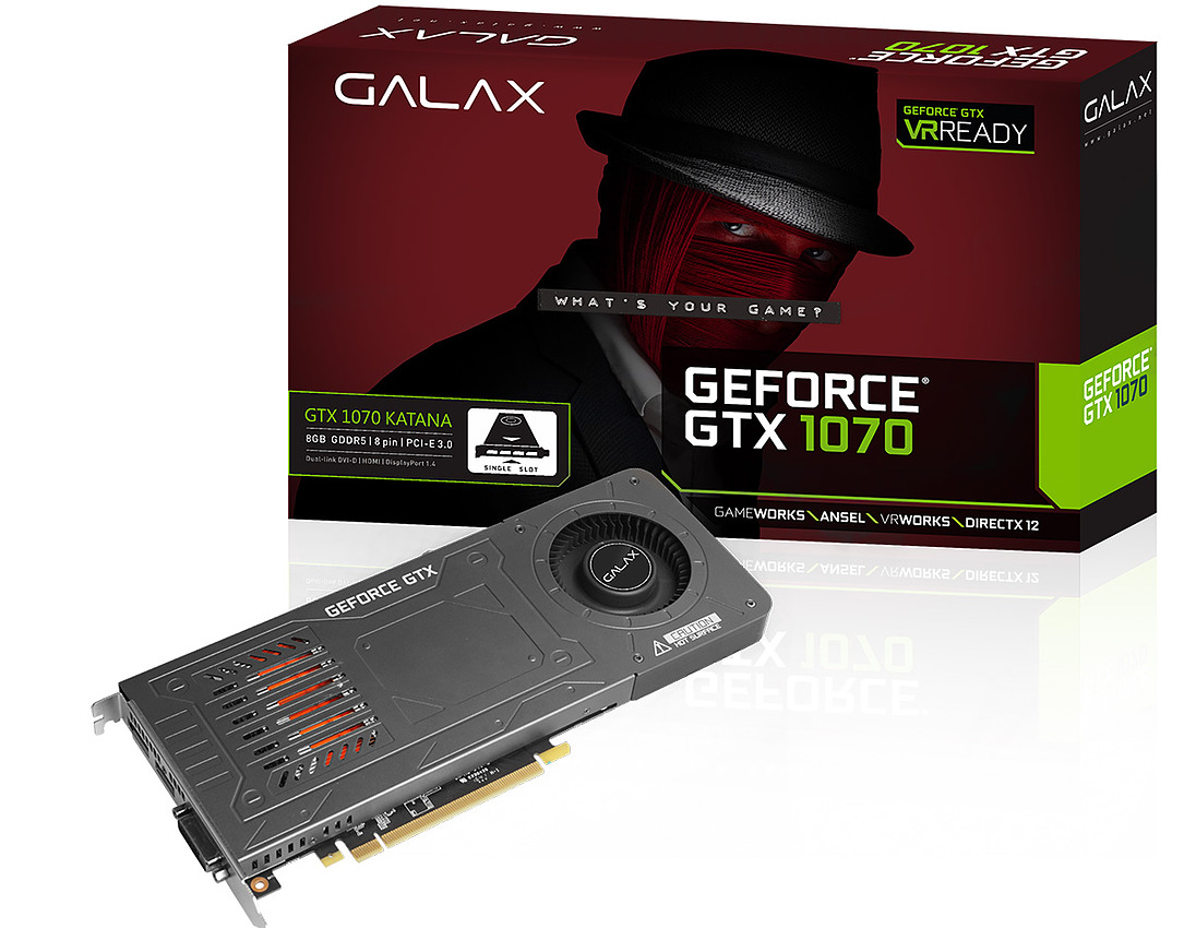 Galax, distribué sous la marque KFA² en Europe et qui appartient à Palit, lance une nouvelle GTX 1070 dénommée Katana. Si la carte est plus épaisse que le sabre japonais il s'agit tout de même de la première GTX 1070 simple slot, sont épaisseur est de seulement 1,6cm sans l'équerre arrière et 1,9cm avec.