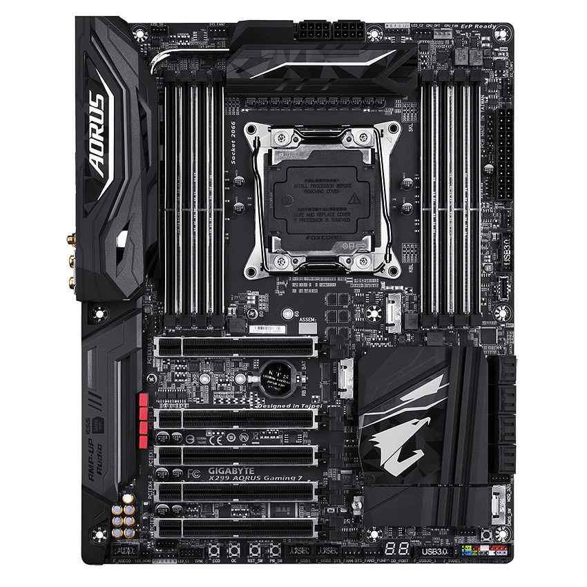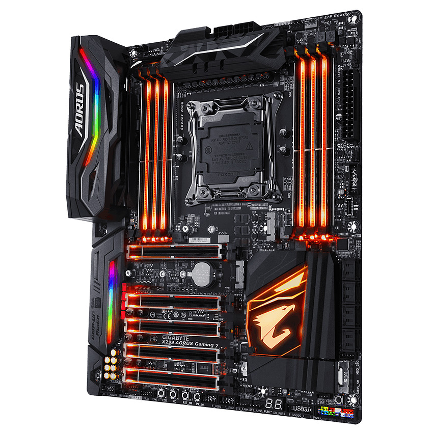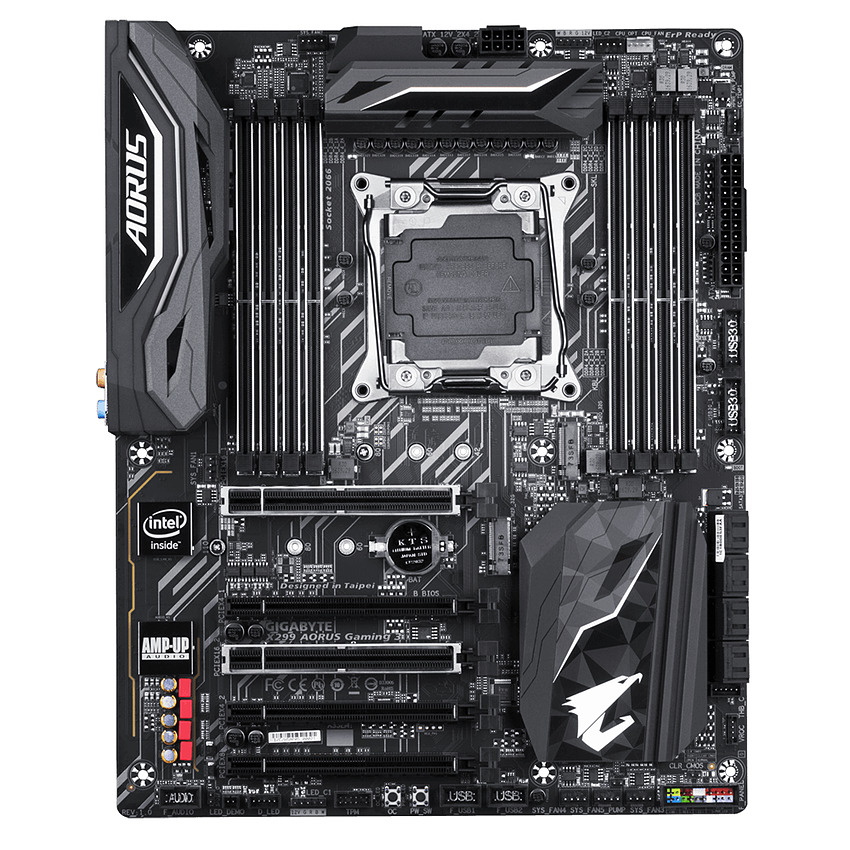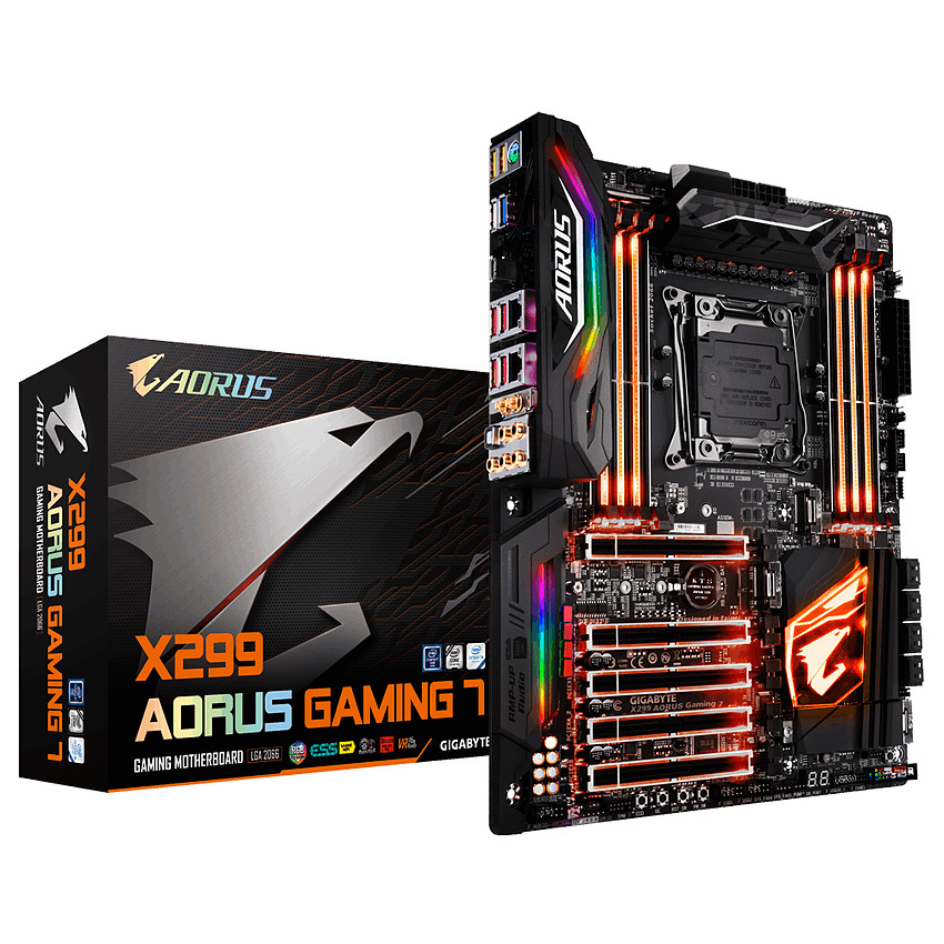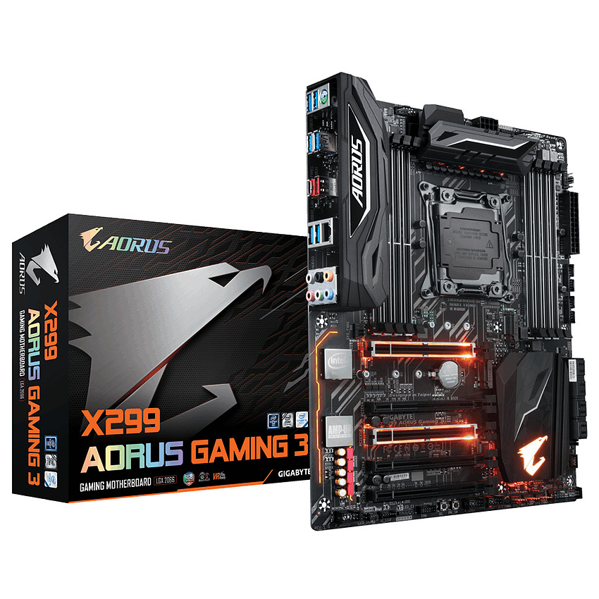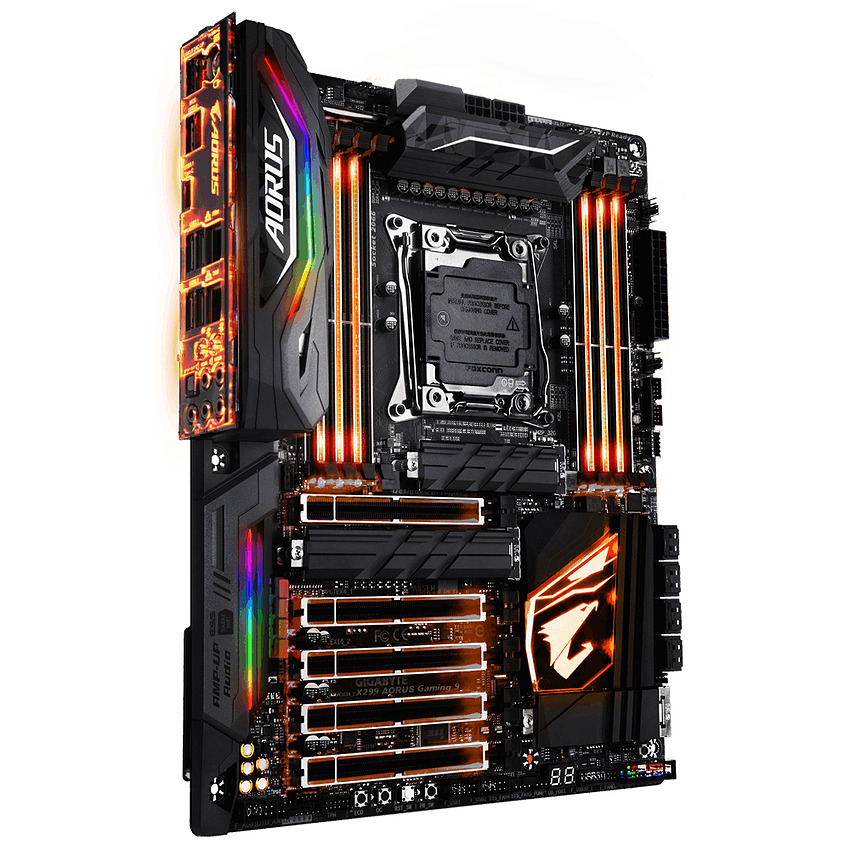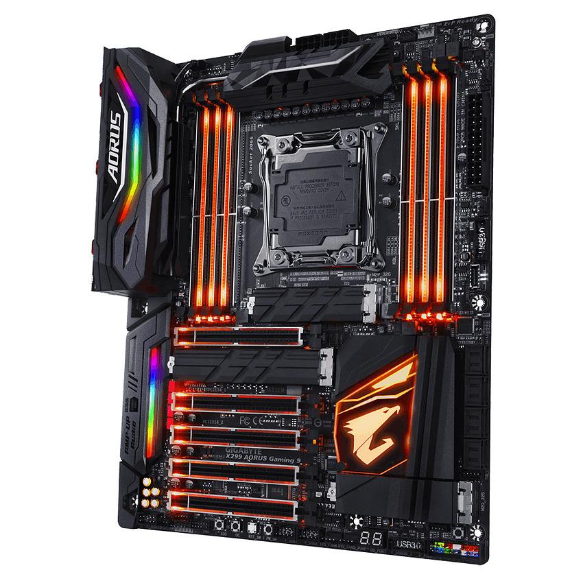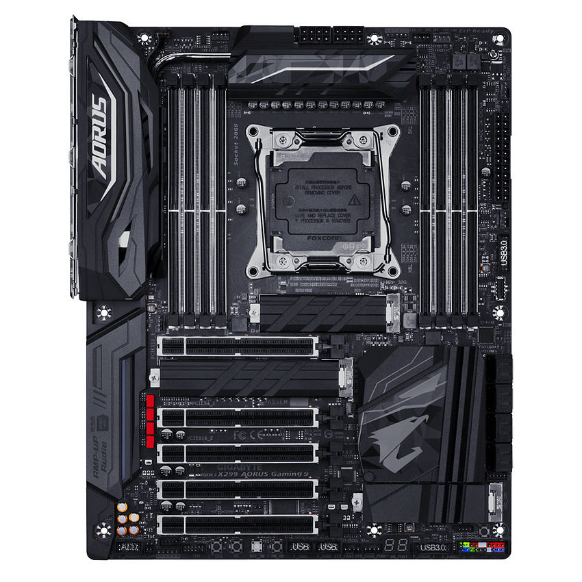 La carte la plus haut de gamme est l'AORUS Gaming 9, elle dispose d'un étage d'alimentation à 8 phases pour le processeur qui peut être pour rappel de type Kaby Lake-X (4 coeurs, 2 canaux DDR4, 16 lignes PCIe) ou Skylake-X (6 à 18 coeurs, 4 canaux DDR4, 28 ou 44 lignes PCIe).