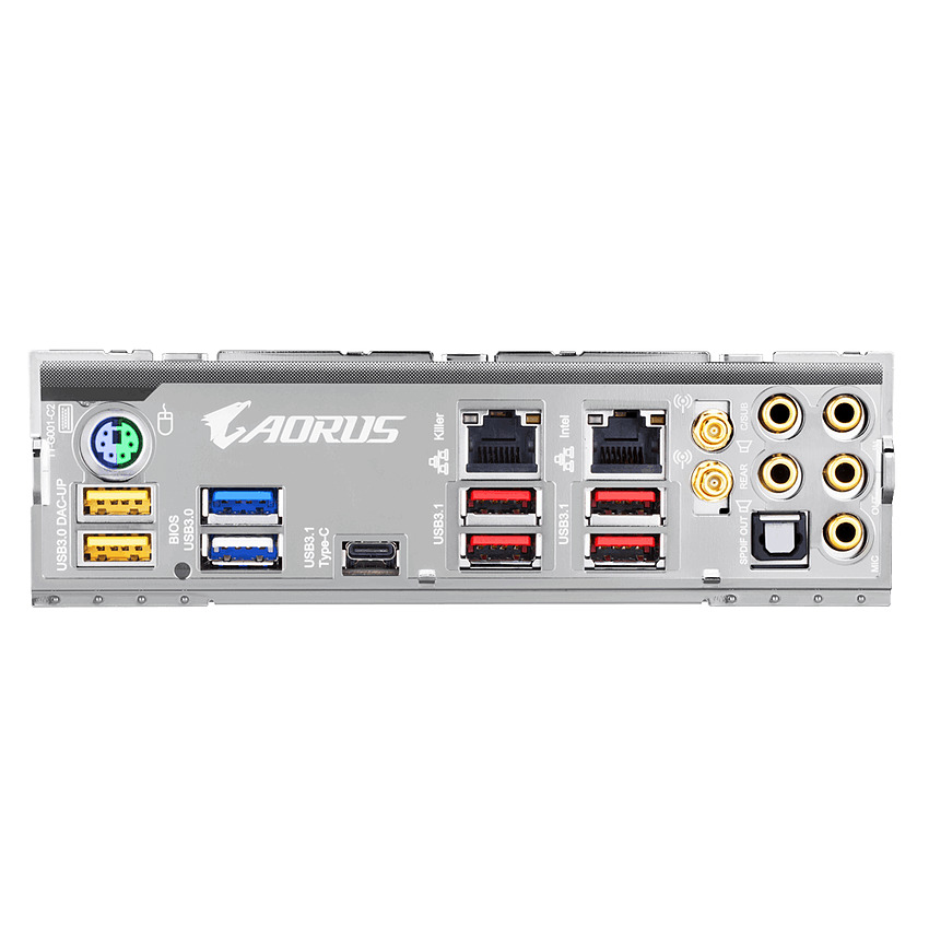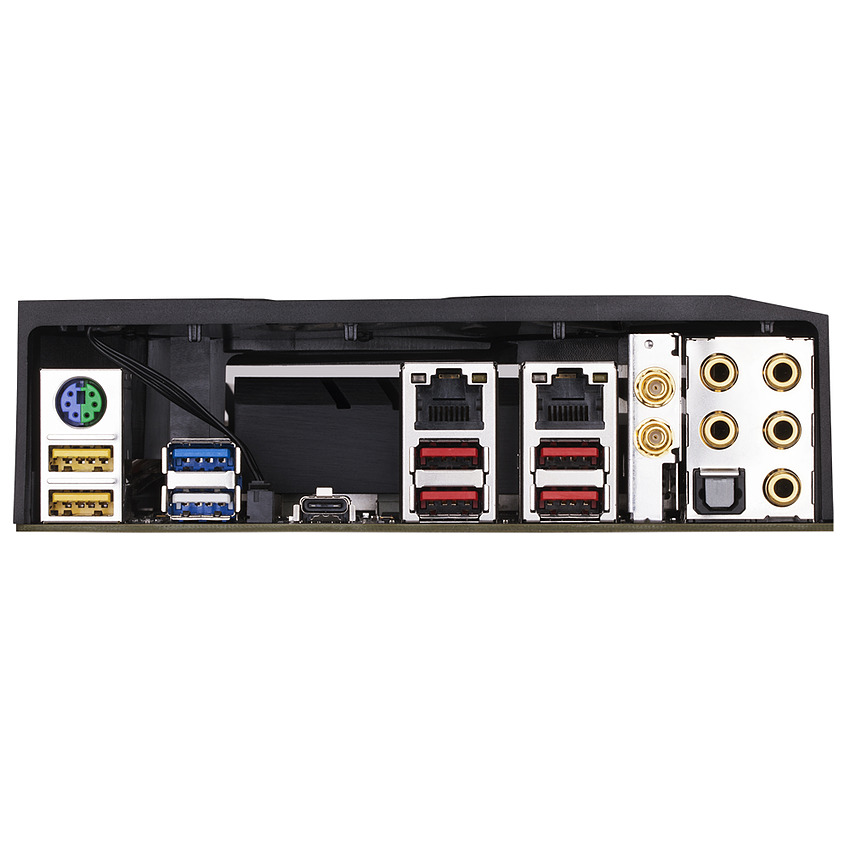 La partie audio est également travaillée puisque le codec Realtek ALC1220 est associé à un DAC ESS Sabre 9018K2M associés à différents composants censé permettre d'obtenir une qualité irréprochable sur les sorties analogiques. Deux ports RJ45 Gigabit sont présents, l'un piloté par une puce Intel I219-V et l'autre par une Killer E2500, ainsi que le WiFi 802.11 ac également de chez Killer.