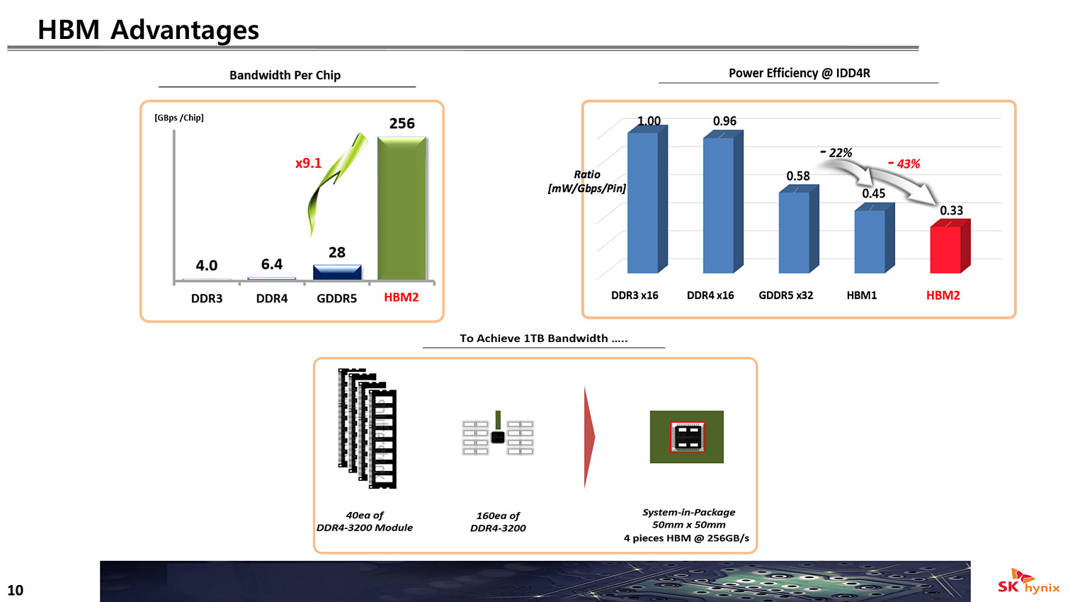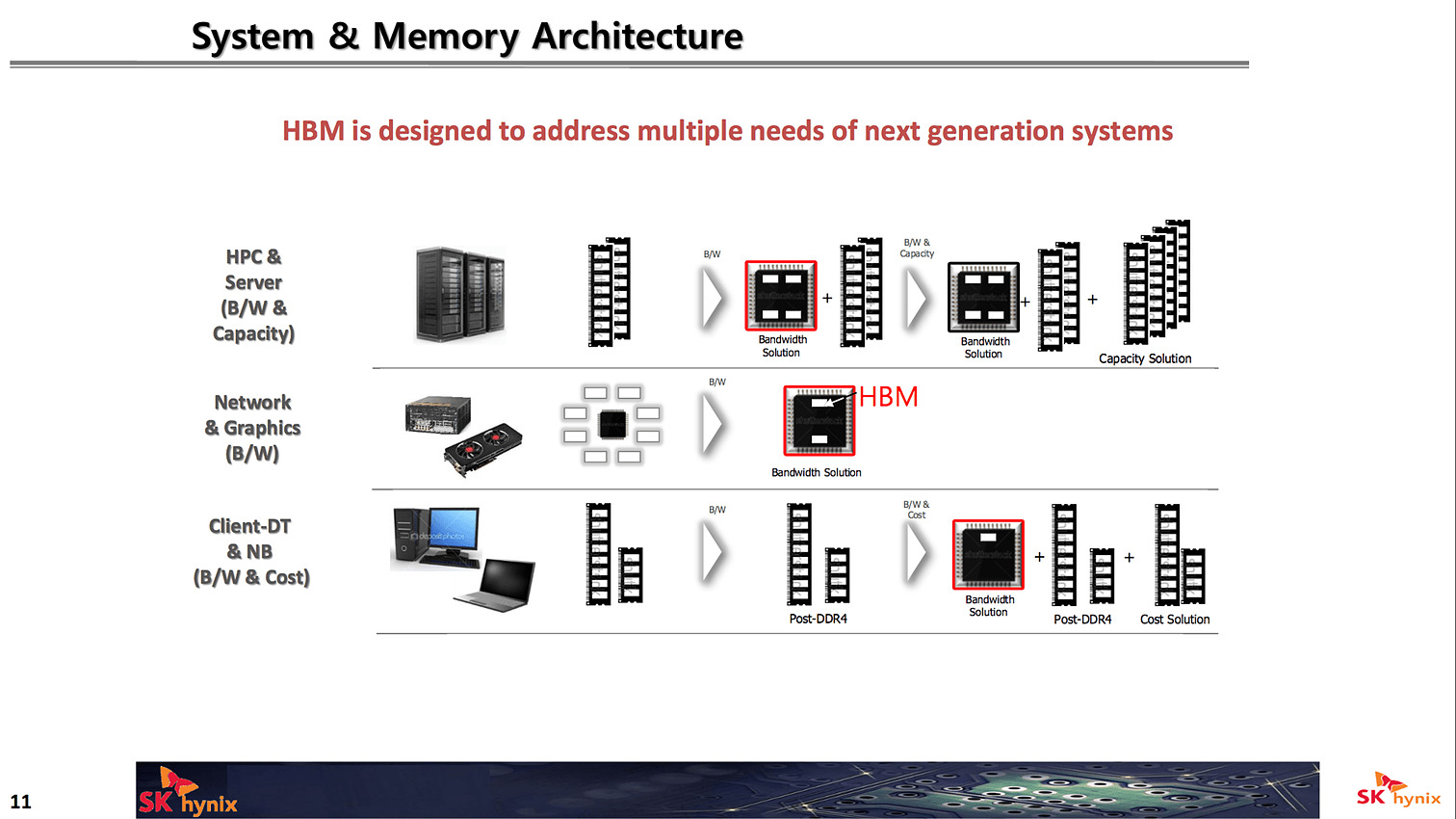 Côté utilisations, si les cartes graphiques ont été les premières à utiliser la HBM, SK Hynix envisage des utilisations dans le monde du HPC et des serveurs ou la HBM servirait de cache intermédiaire. Certaines déclinaisons de Zen pour serveurs devraient utiliser de la HBM, par exemple. SK Hynix voit également la HBM arriver en volume plus large dans les PC portables et desktop.